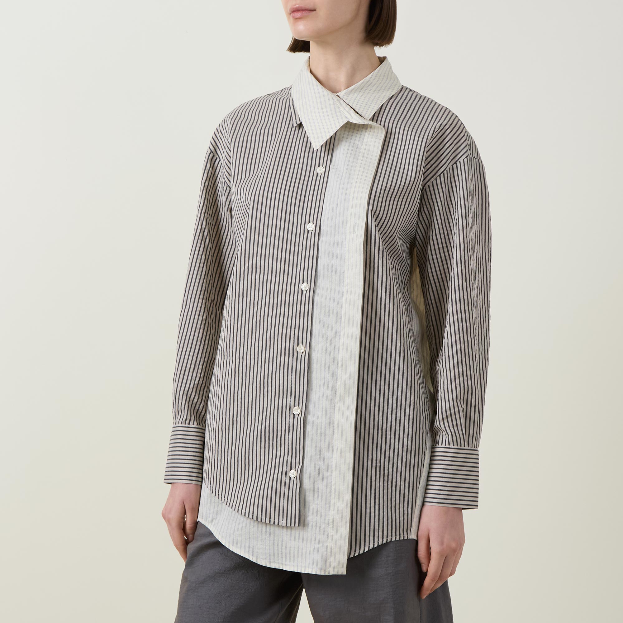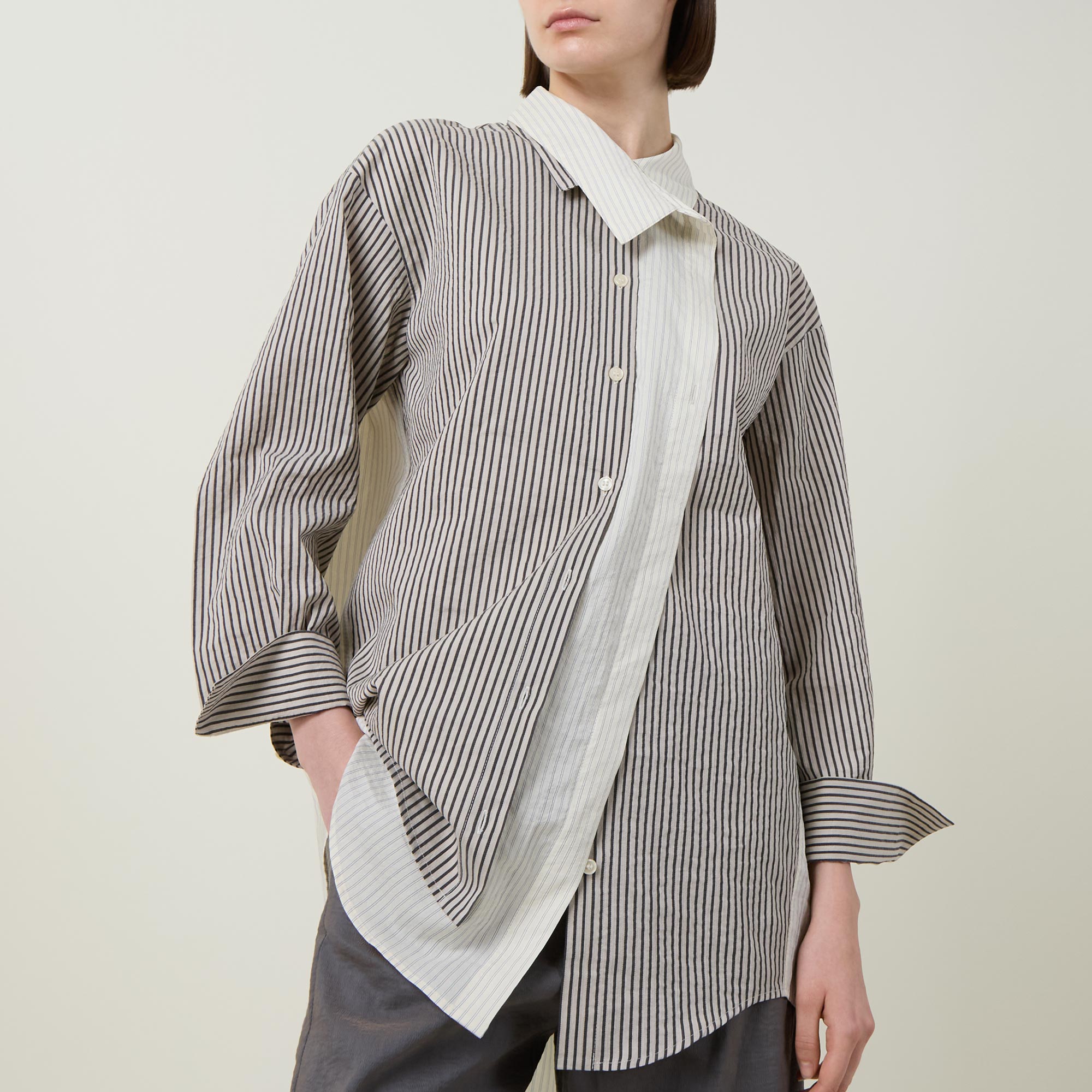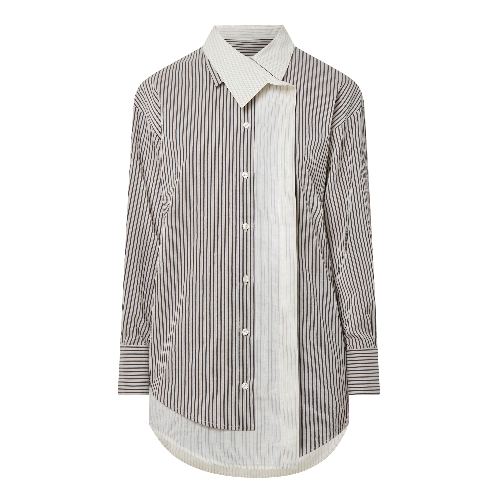 - Point collar, dropped shoulders, long sleeves, buttoned cuffs, asymmetric button placket, layered detailing, curved hem, rear knife pleat, striped design
