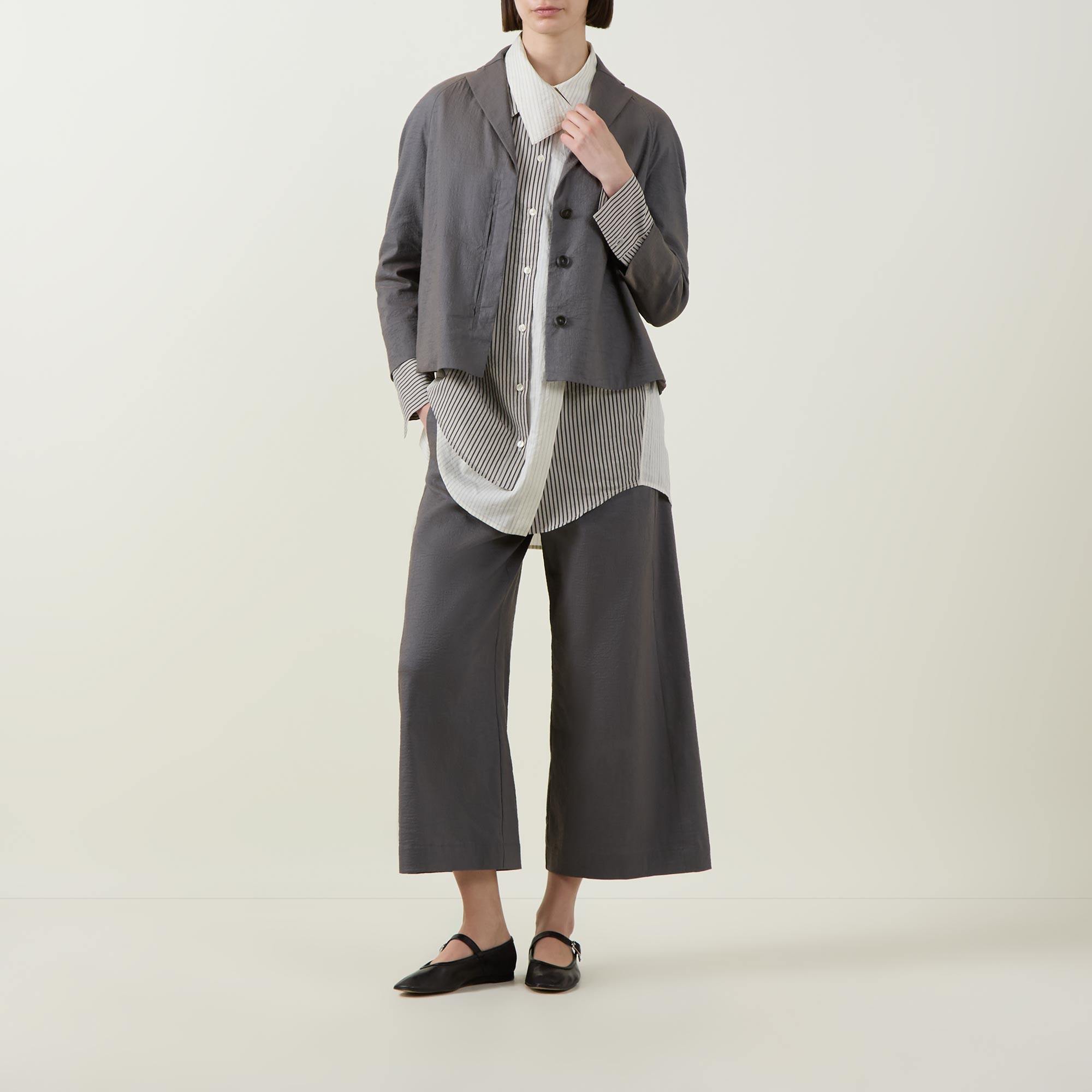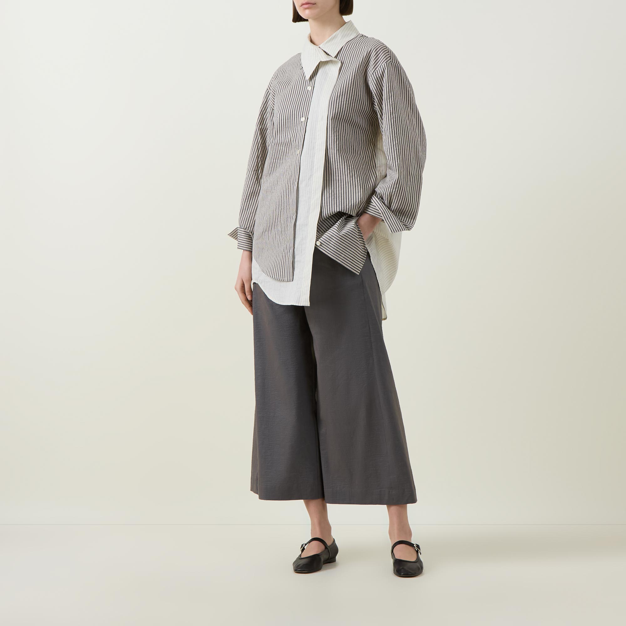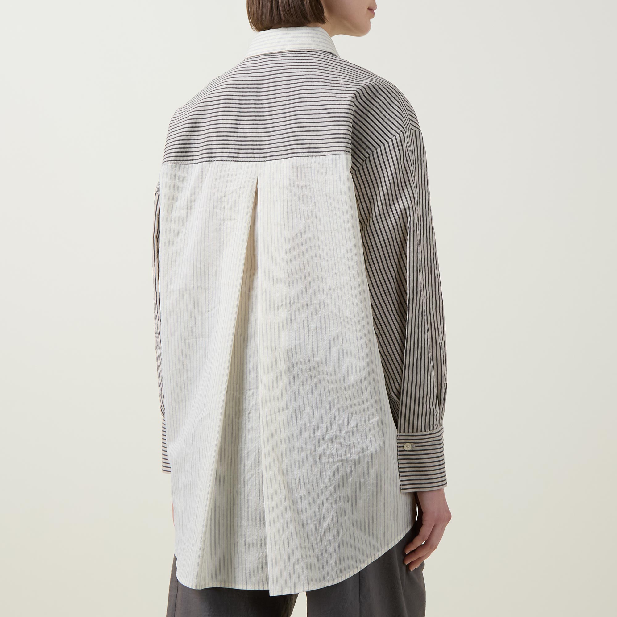 - Point collar, dropped shoulders, long sleeves, buttoned cuffs, asymmetric button placket, layered detailing, curved hem, rear knife pleat, striped design