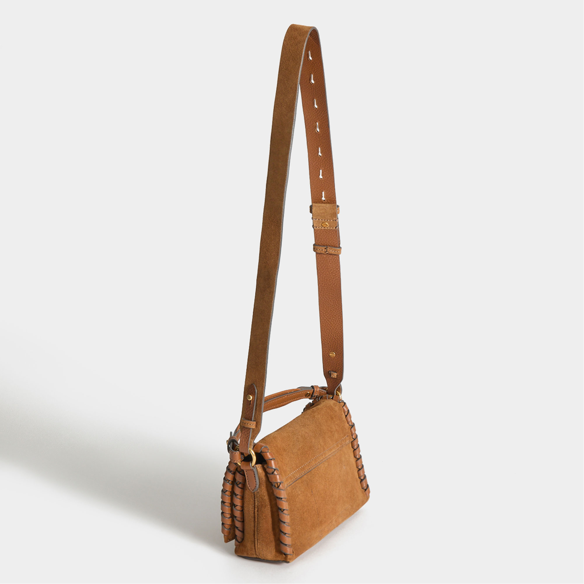• Crossbody style, handmade, reverse suede, woven leather edges, gold-tone hardware, bow, logo-embossed turn-lock, suede top handle, removable and adjustable strap