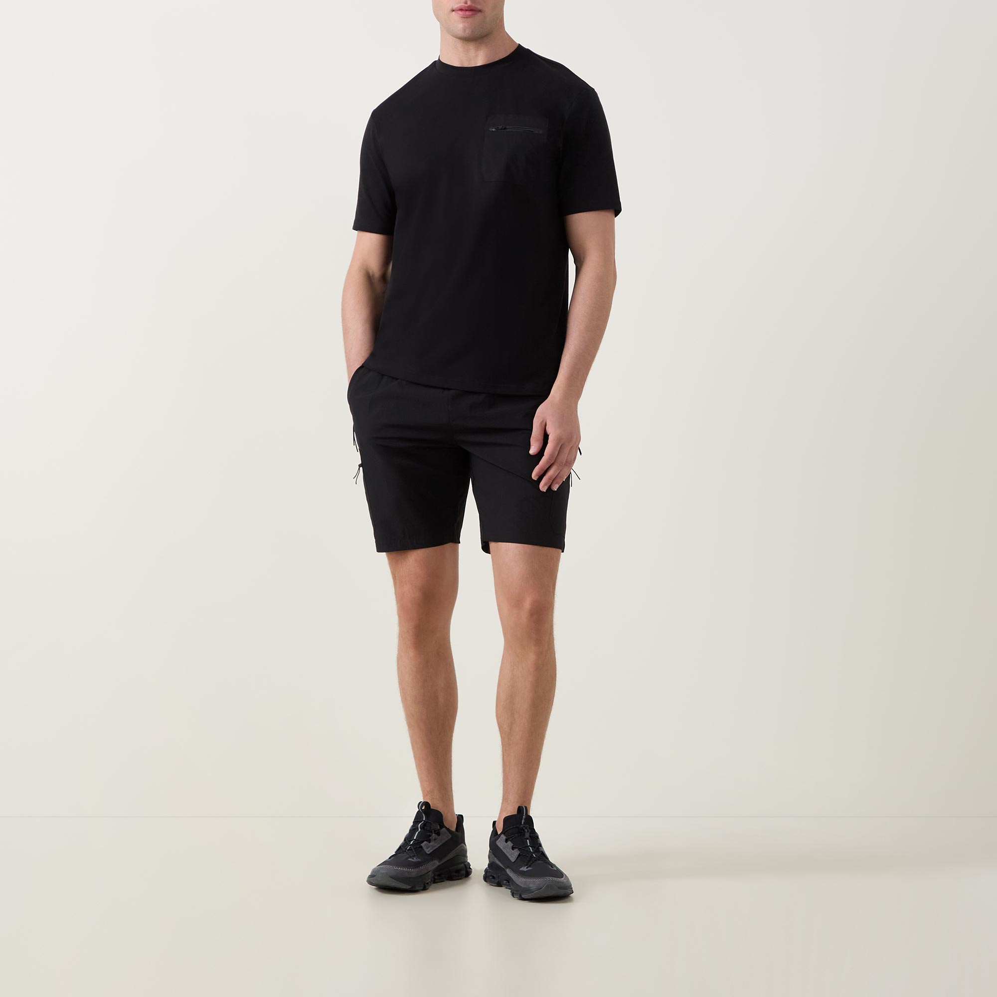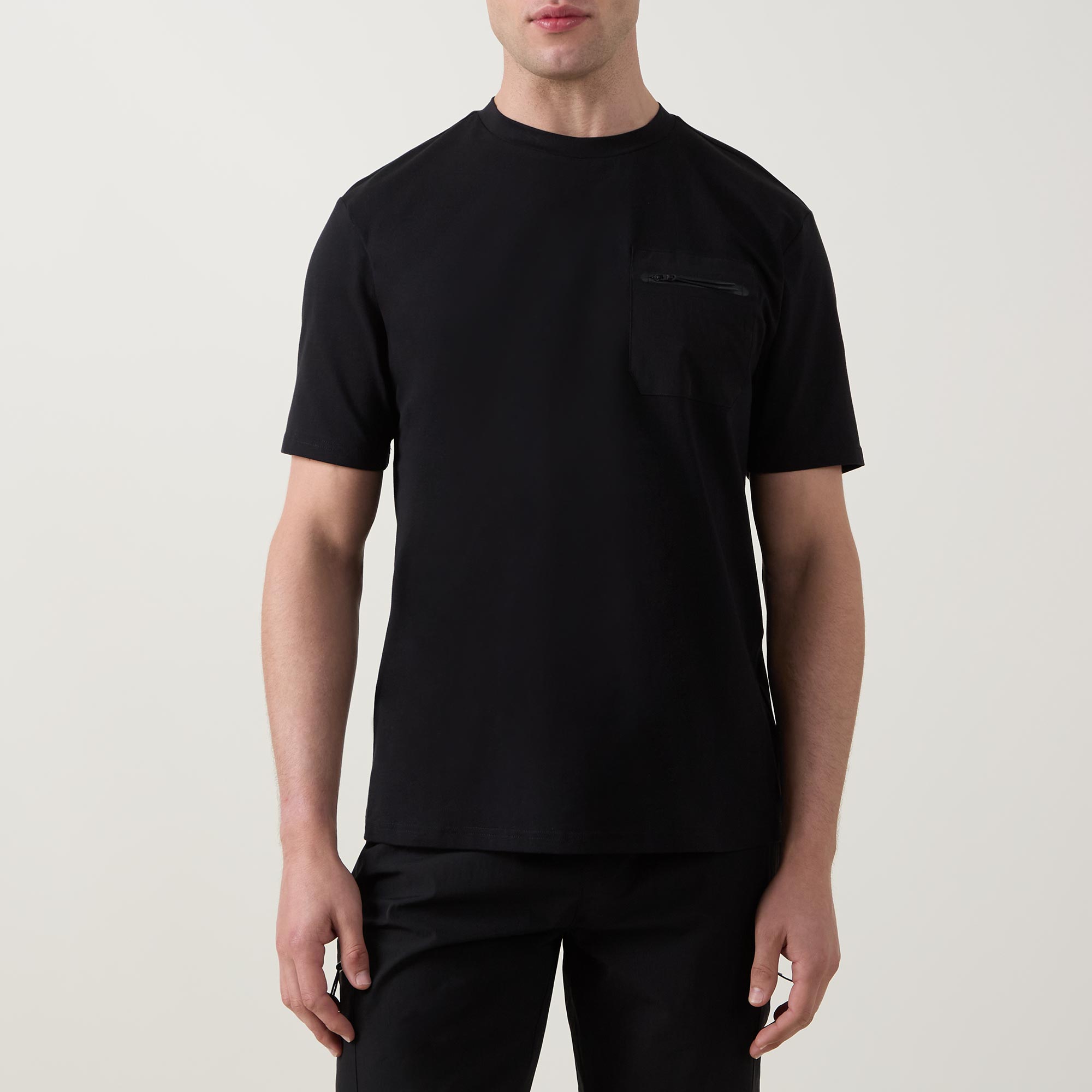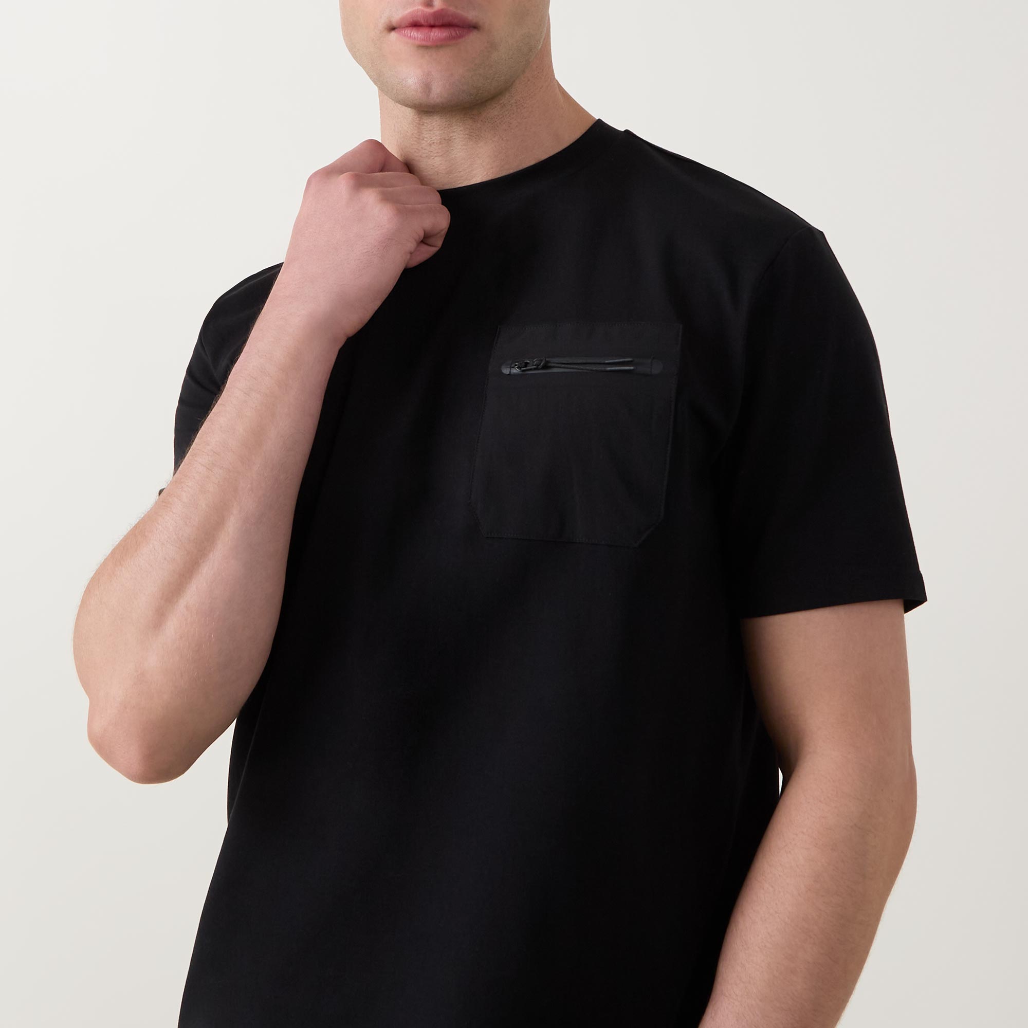 - Crew neck, short sleeves, one chest patch pocket in contrasting fabric, zip fastening, straight hem, tonal stitching, smooth finish