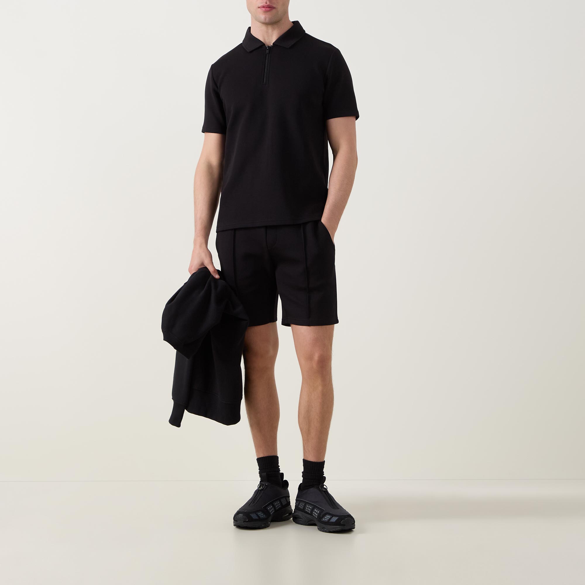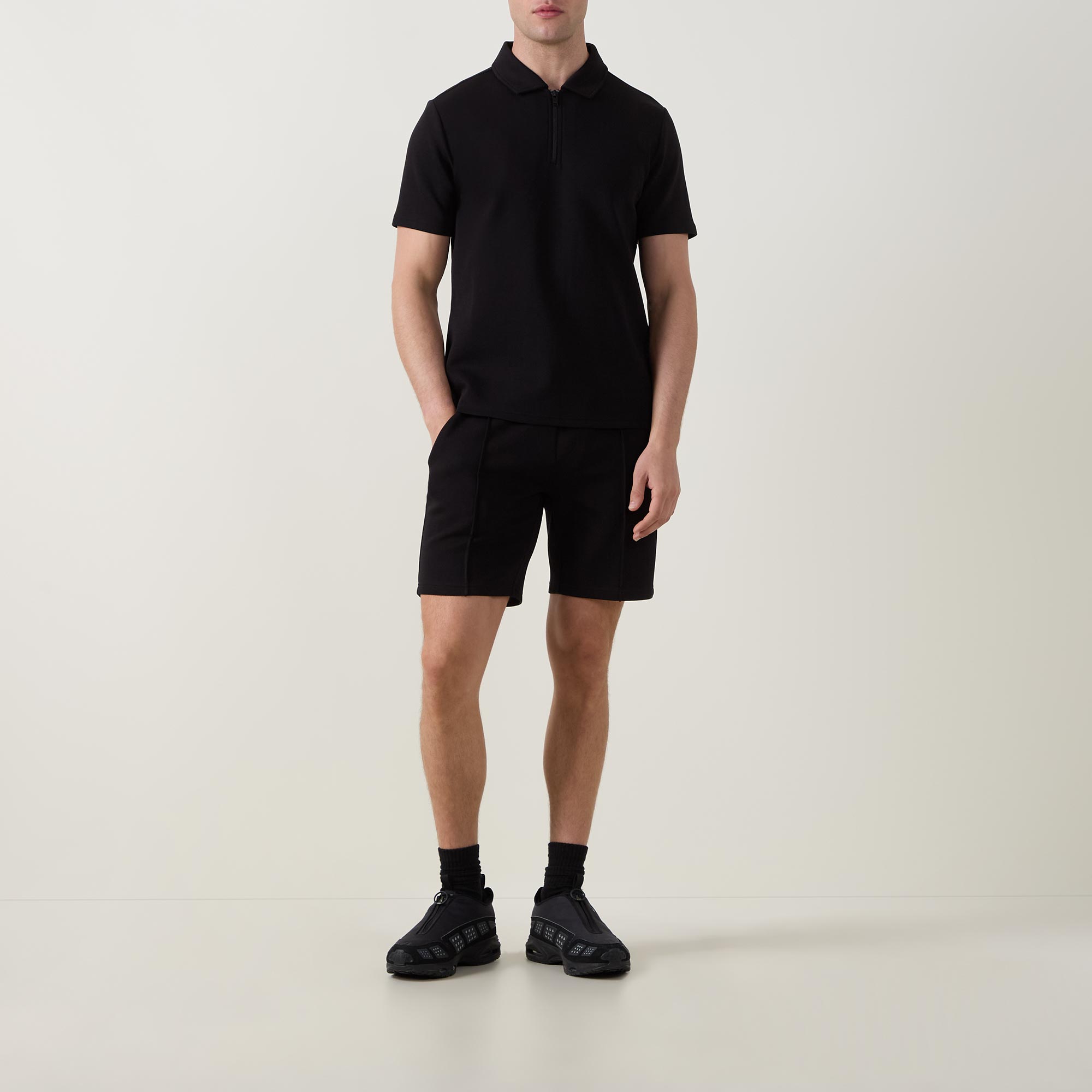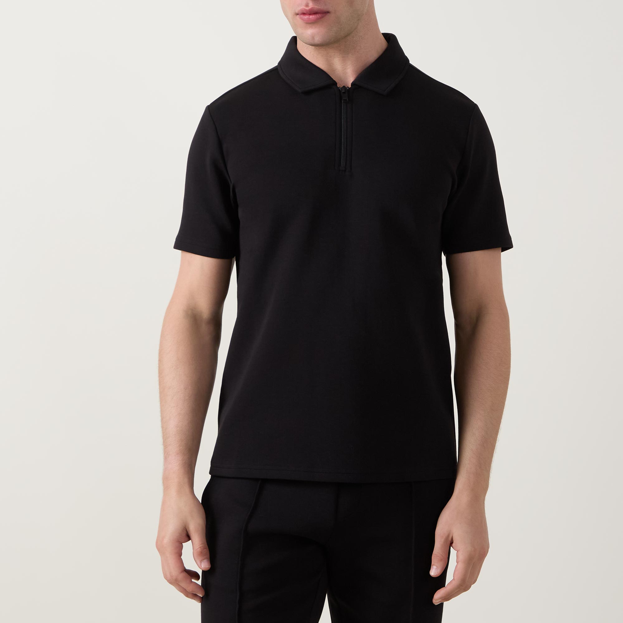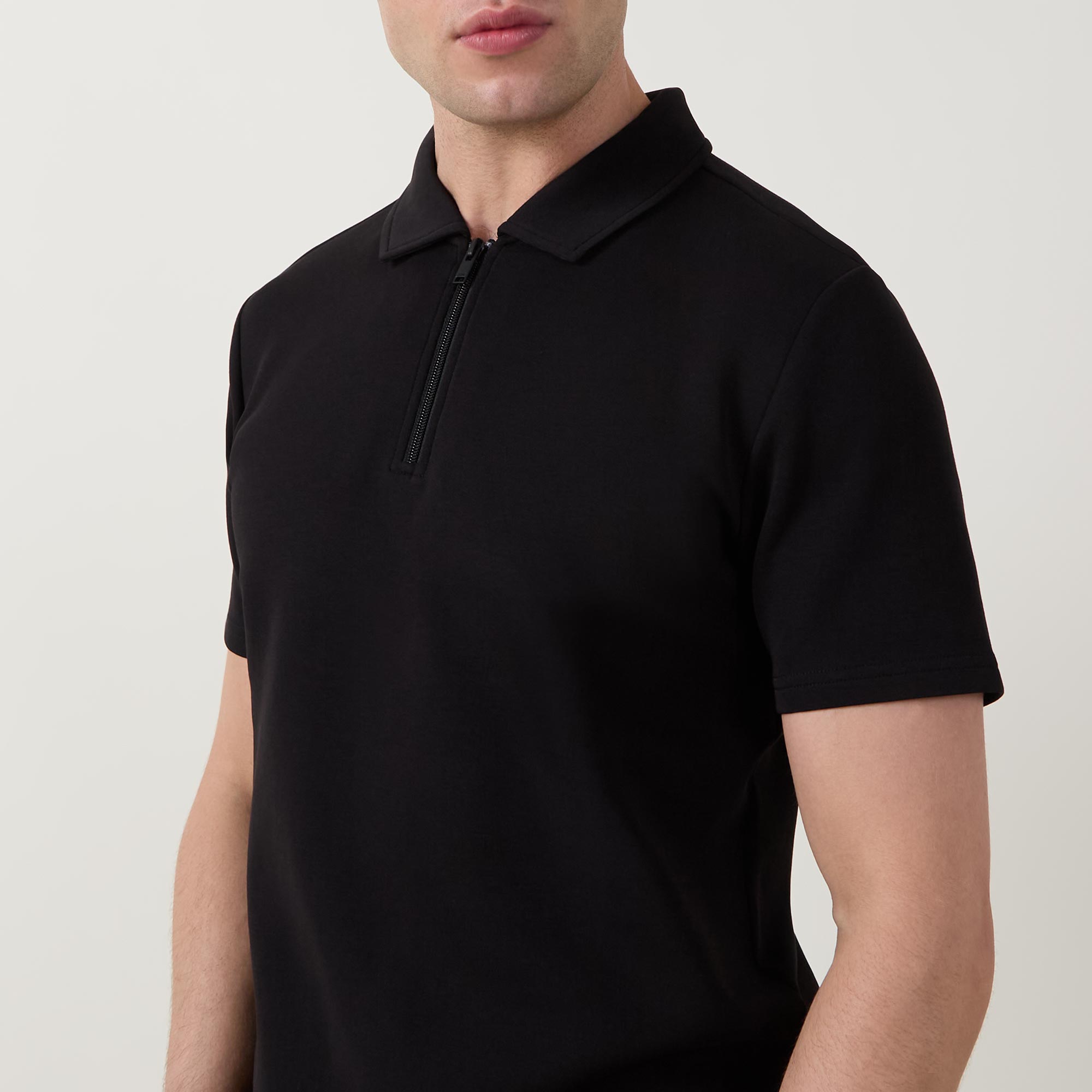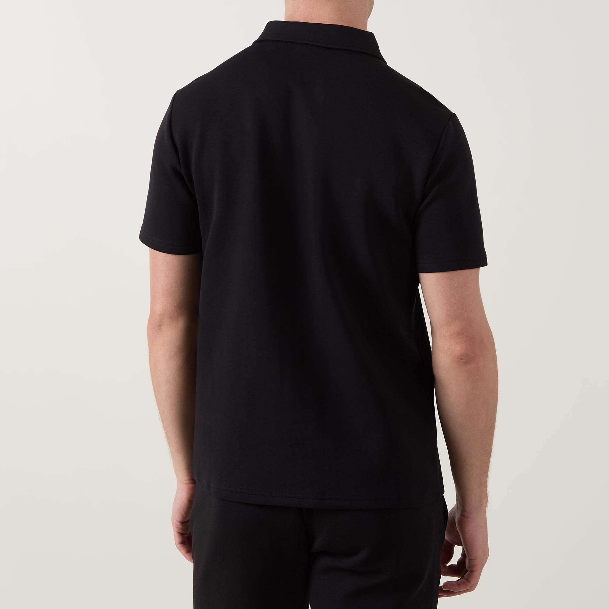 - Polo collar, zip half placket, short sleeves, straight hem, tonal stitching, high density tonal logo embroidery at the back of the neck, smooth finish