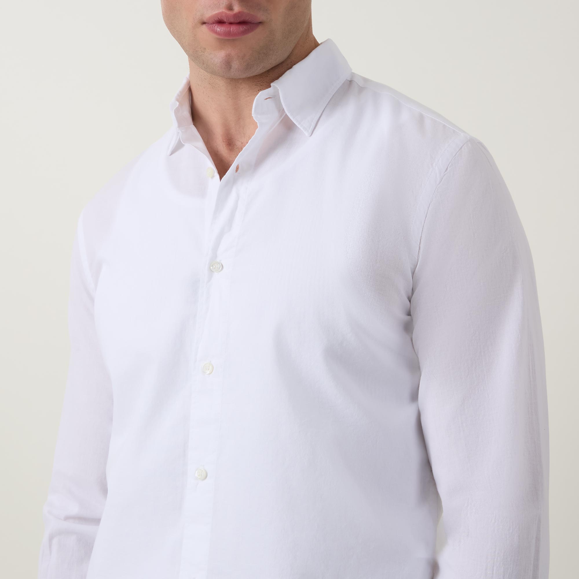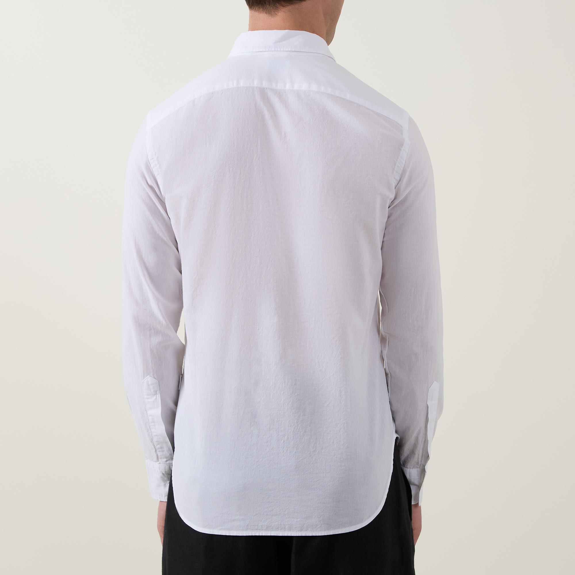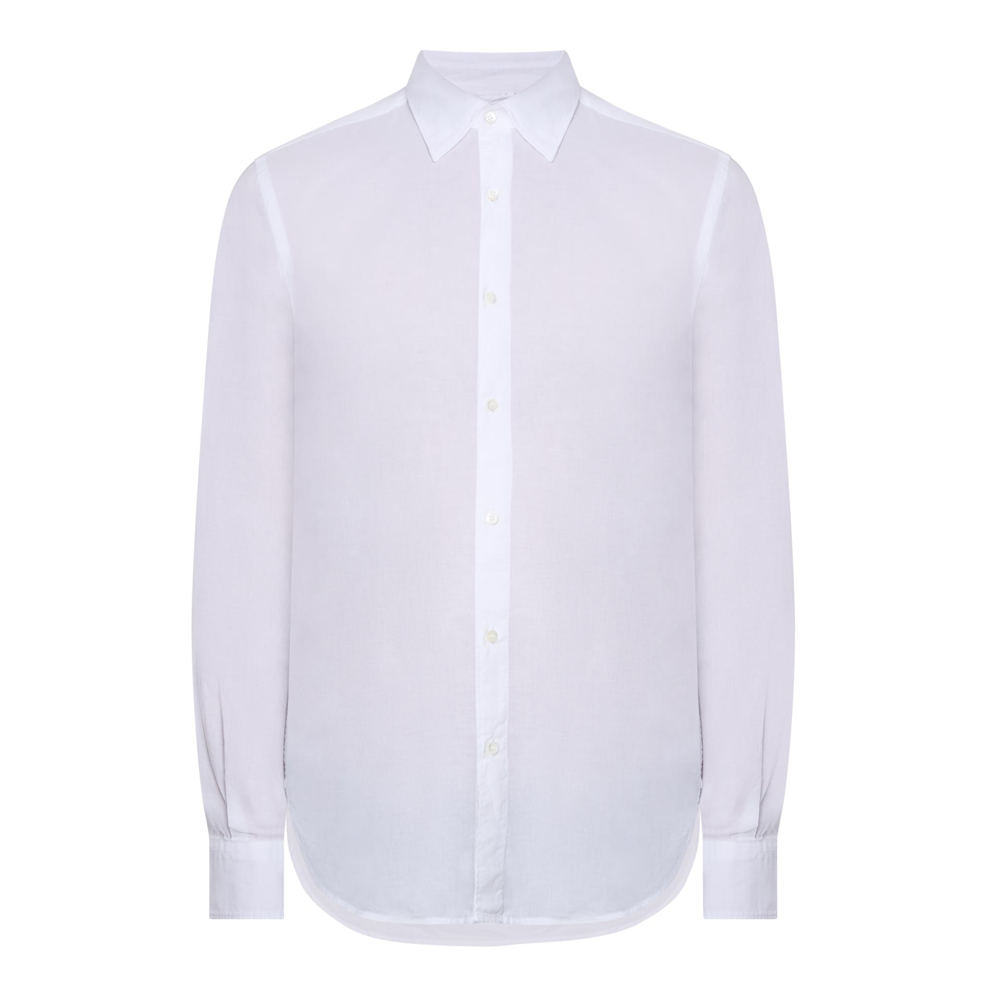 - Curved hemline, long sleeves, pointed collar, button fastenings