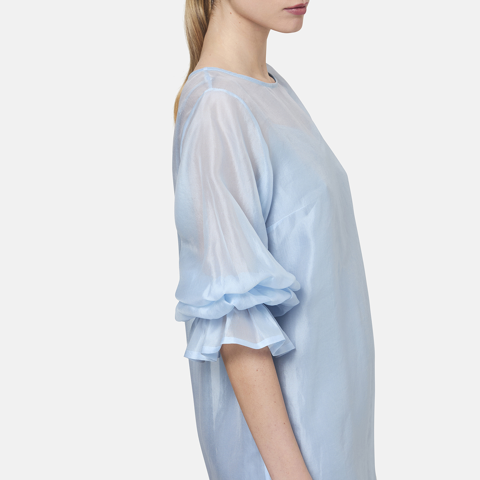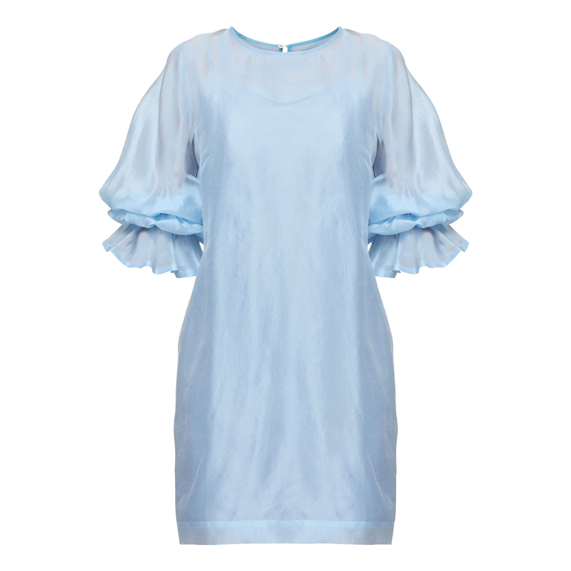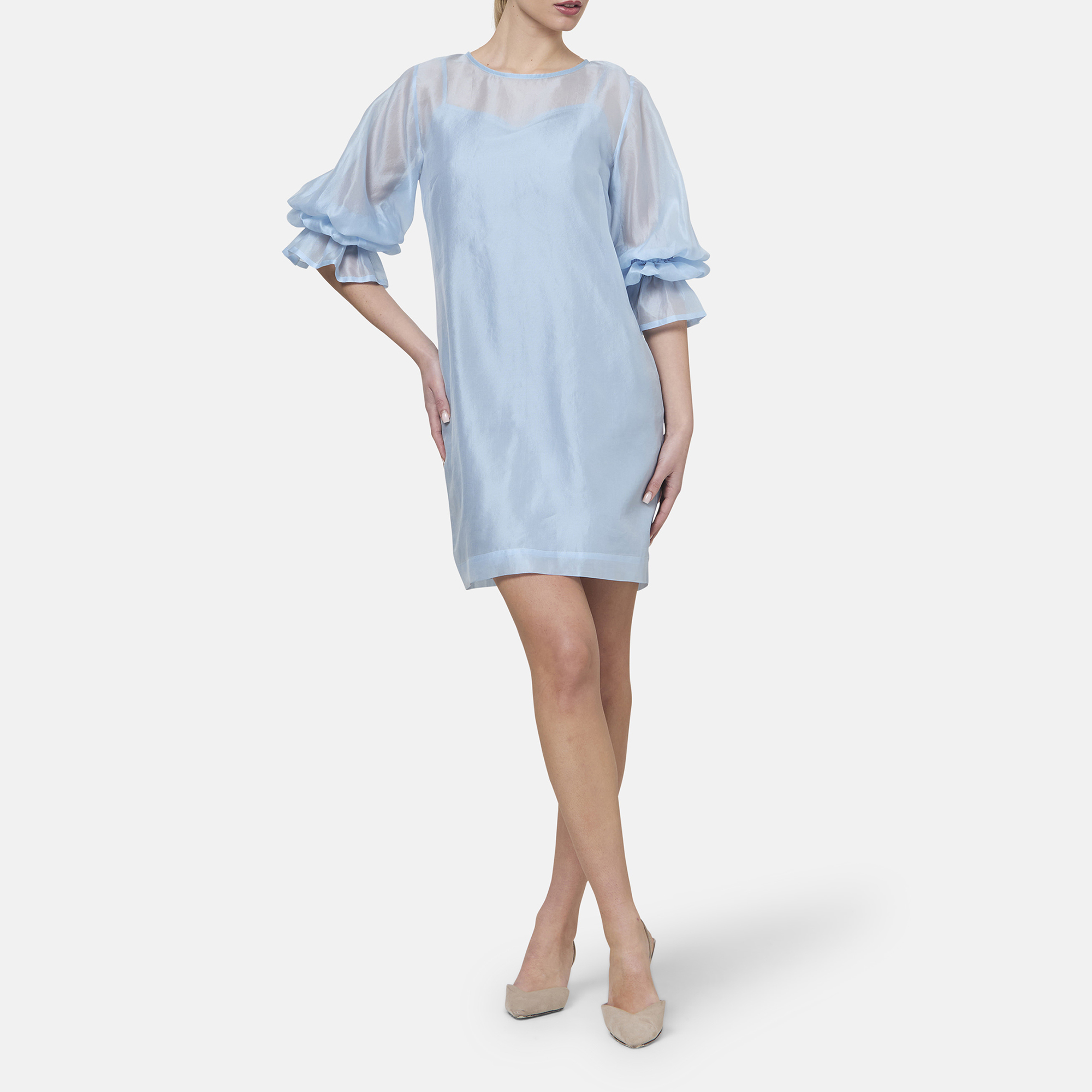 - Shift style, soft semi-transparent organza fabric, double puff-ball sleeves, side seam pockets, mini length
