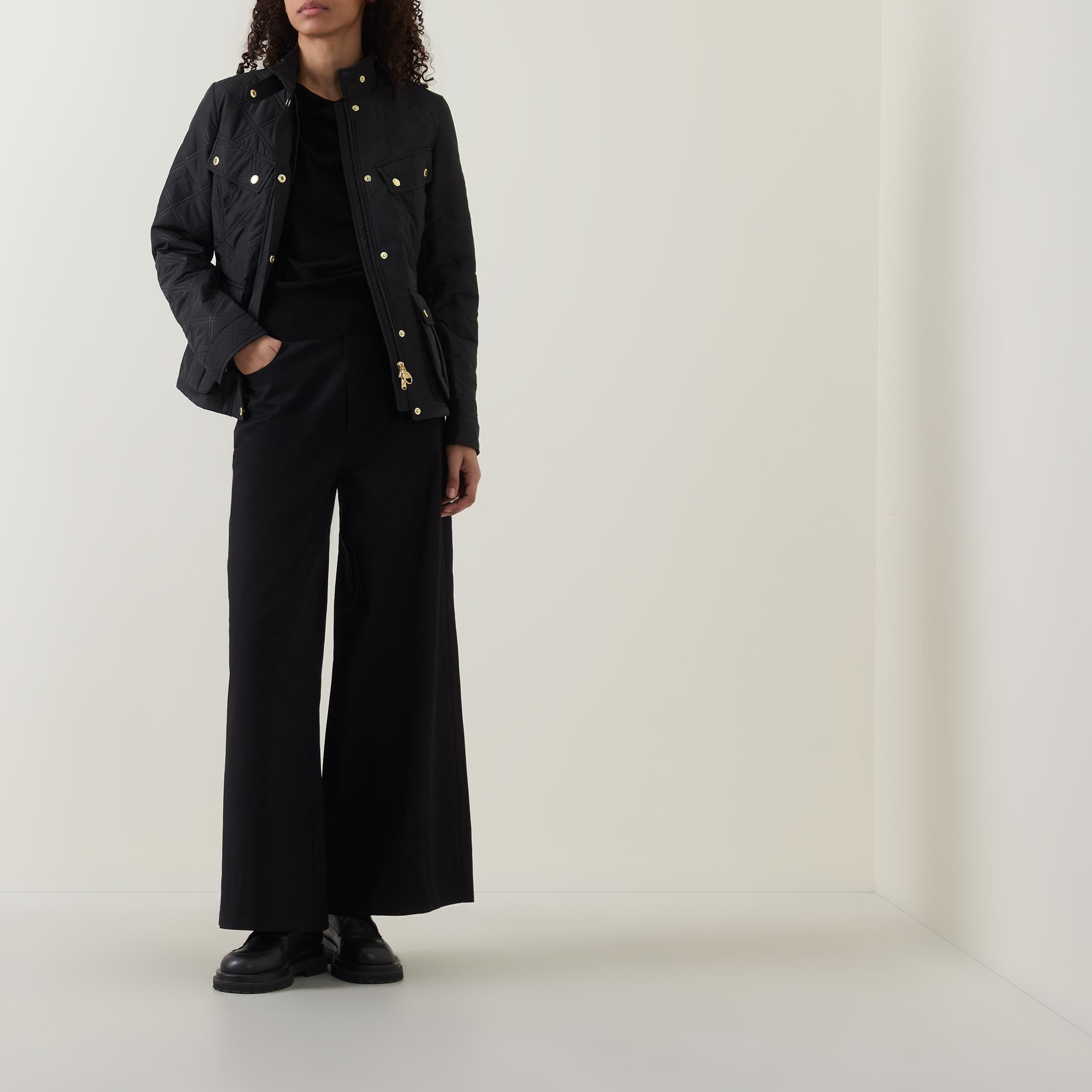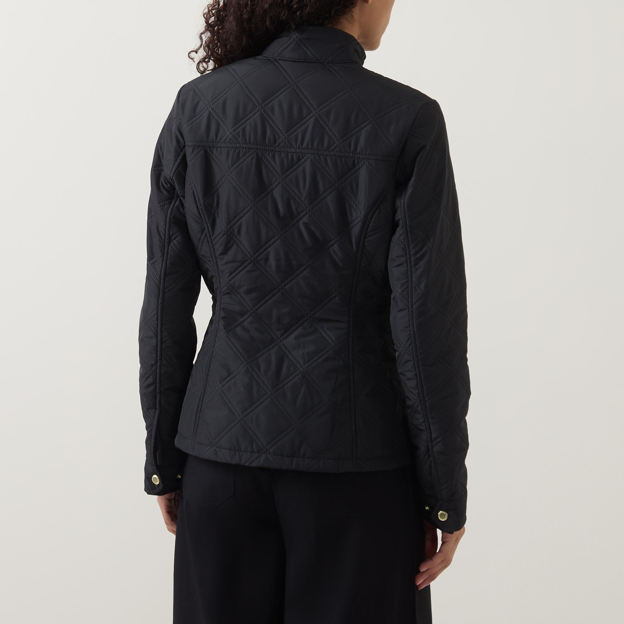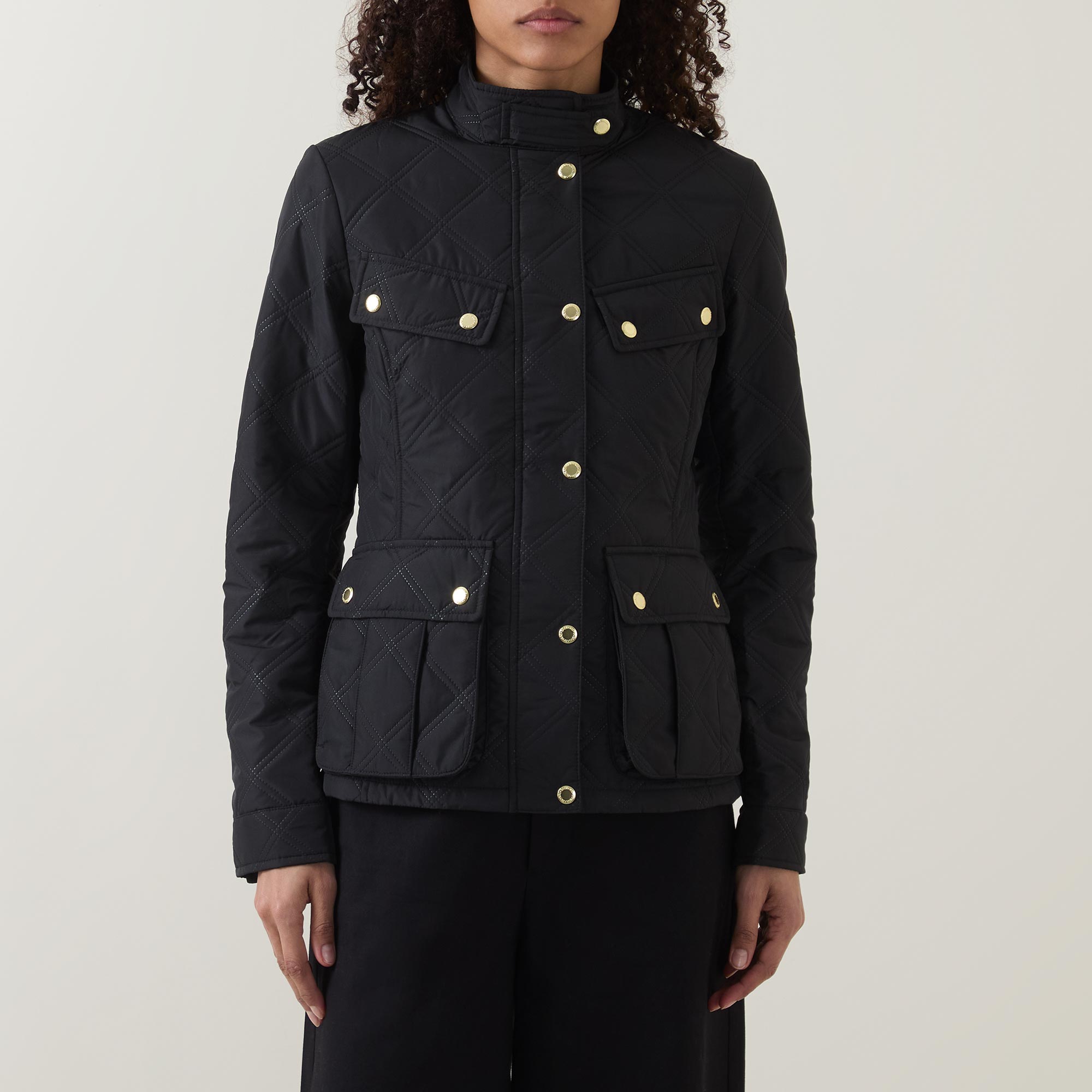 • High neckline, long sleeves, quilted, logo detail, snap buttons, chest pockets, front pockets, zip fastening