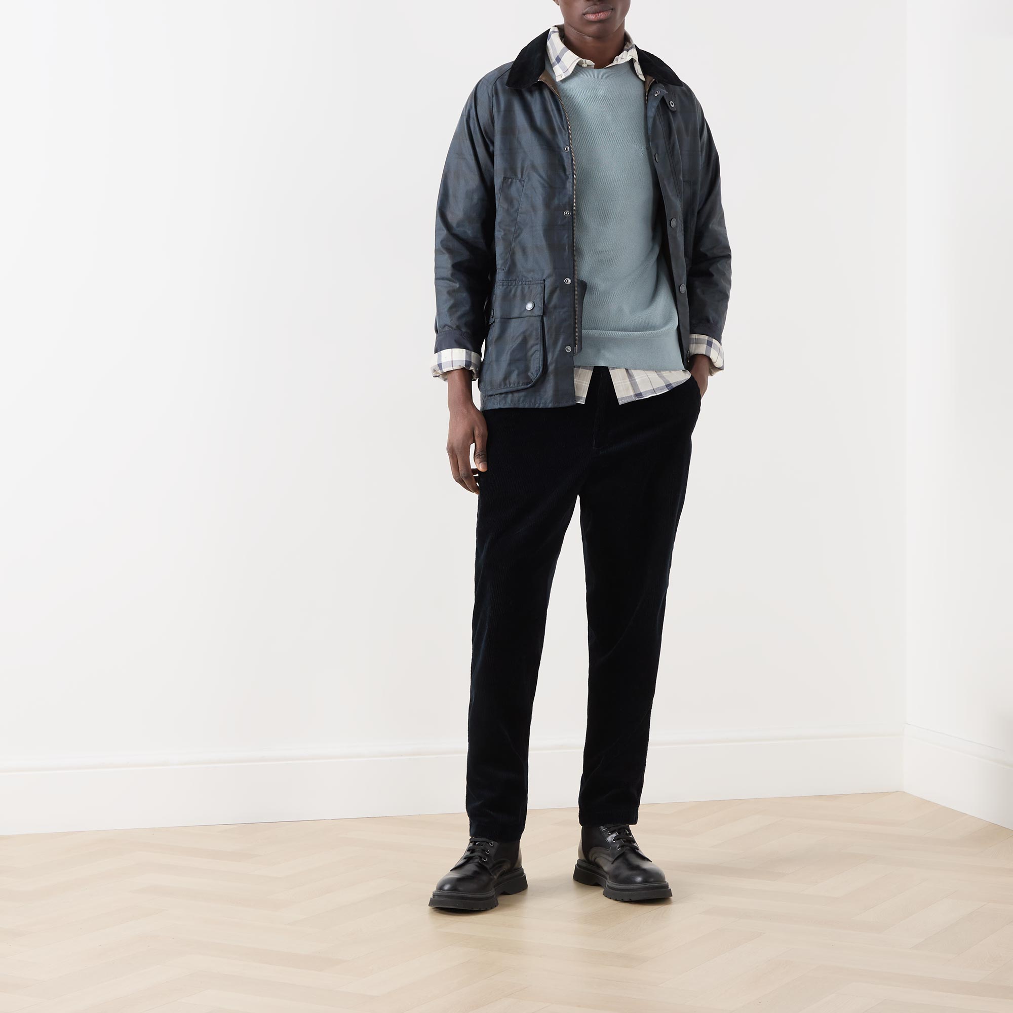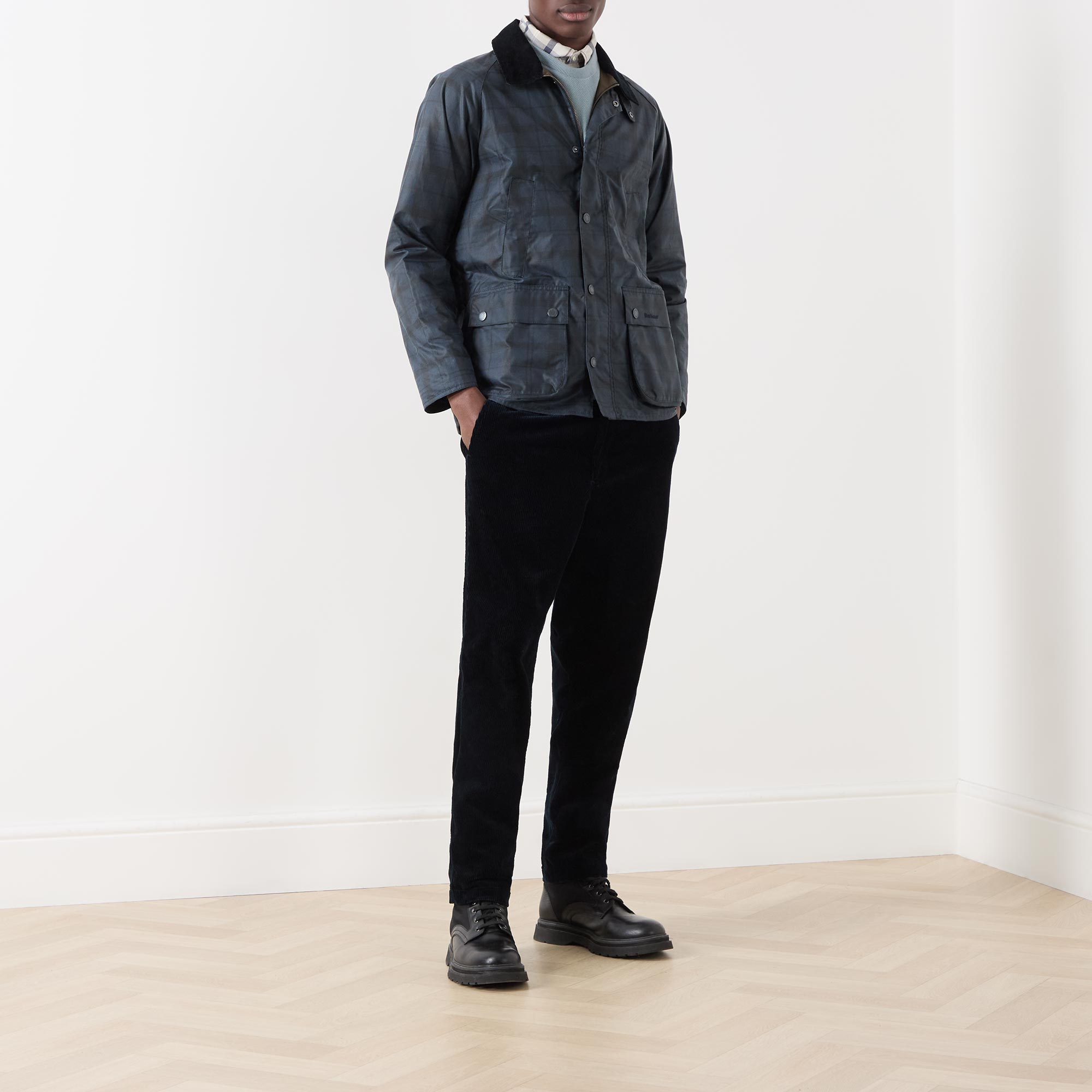 - Corduroy point collar, throat tab with snap button fastening, long sleeves, front zip closure, additional snap button placket, two hand warmer pockets, two large bellow pockets with snap button fastenings, straight hem, embroidered logo detail, tartan pattern, waxed finish
