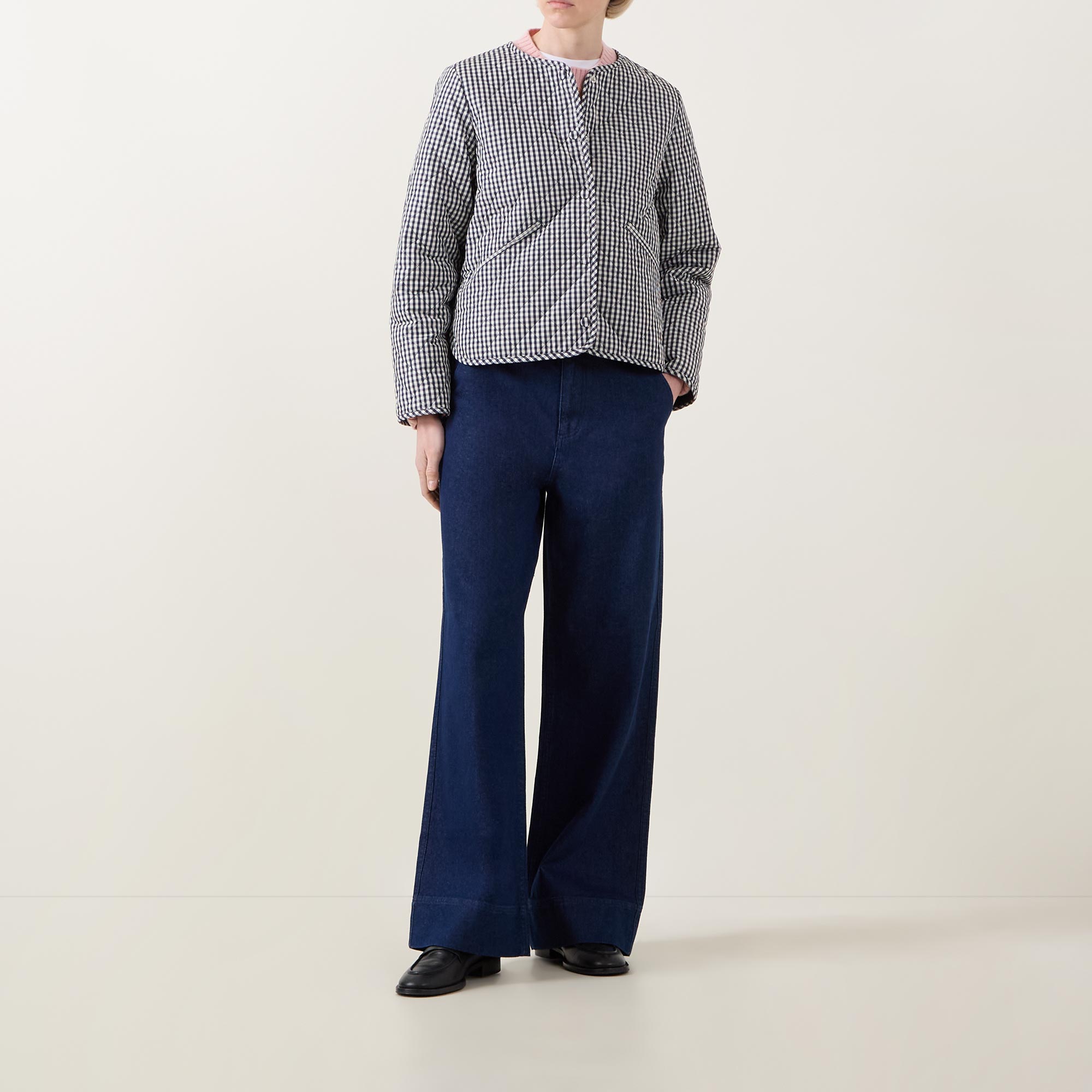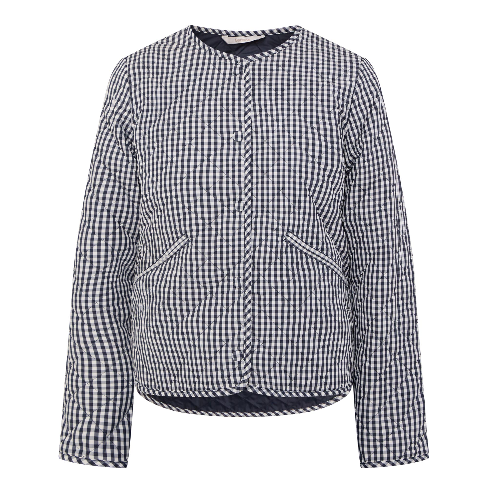 - Collarless, snap button fastening, jet pockets, self-binding trims, diamond quilted, lightweight, curved and dipped hemline, gingham print