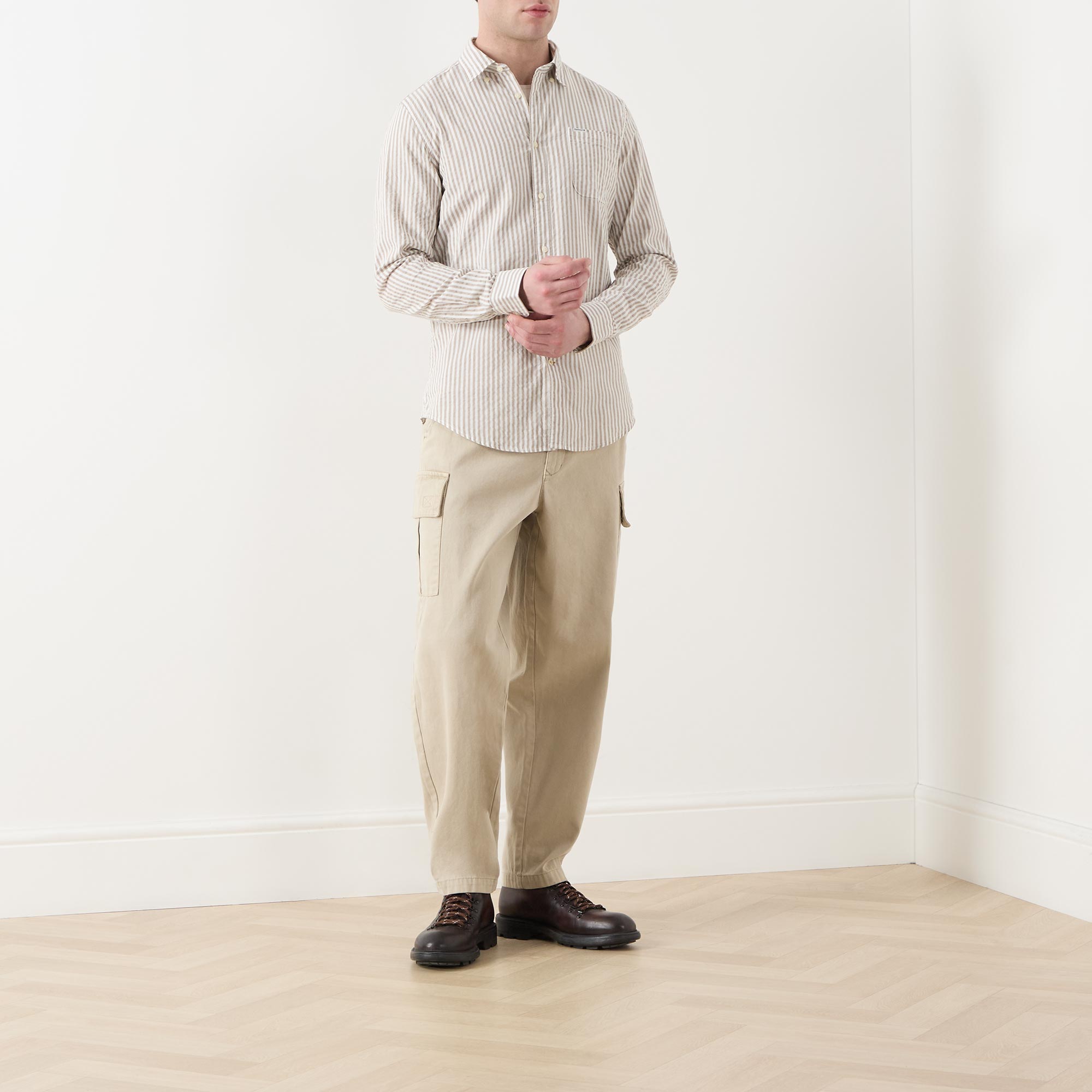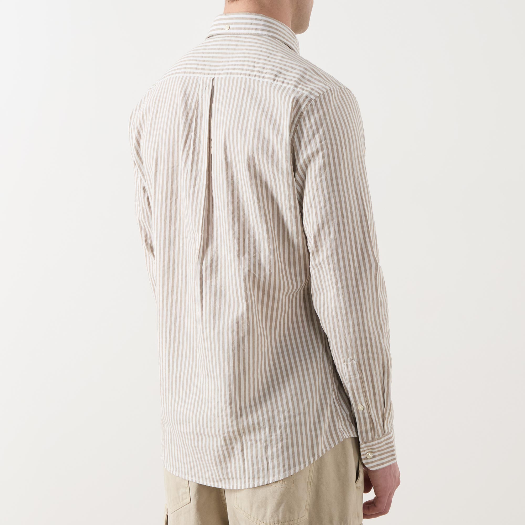 • Button-down point collar, long sleeves, buttoned cuffs, front button placket, one chest patch pocket, curved hem, rear box pleat, seersucker texture, striped design