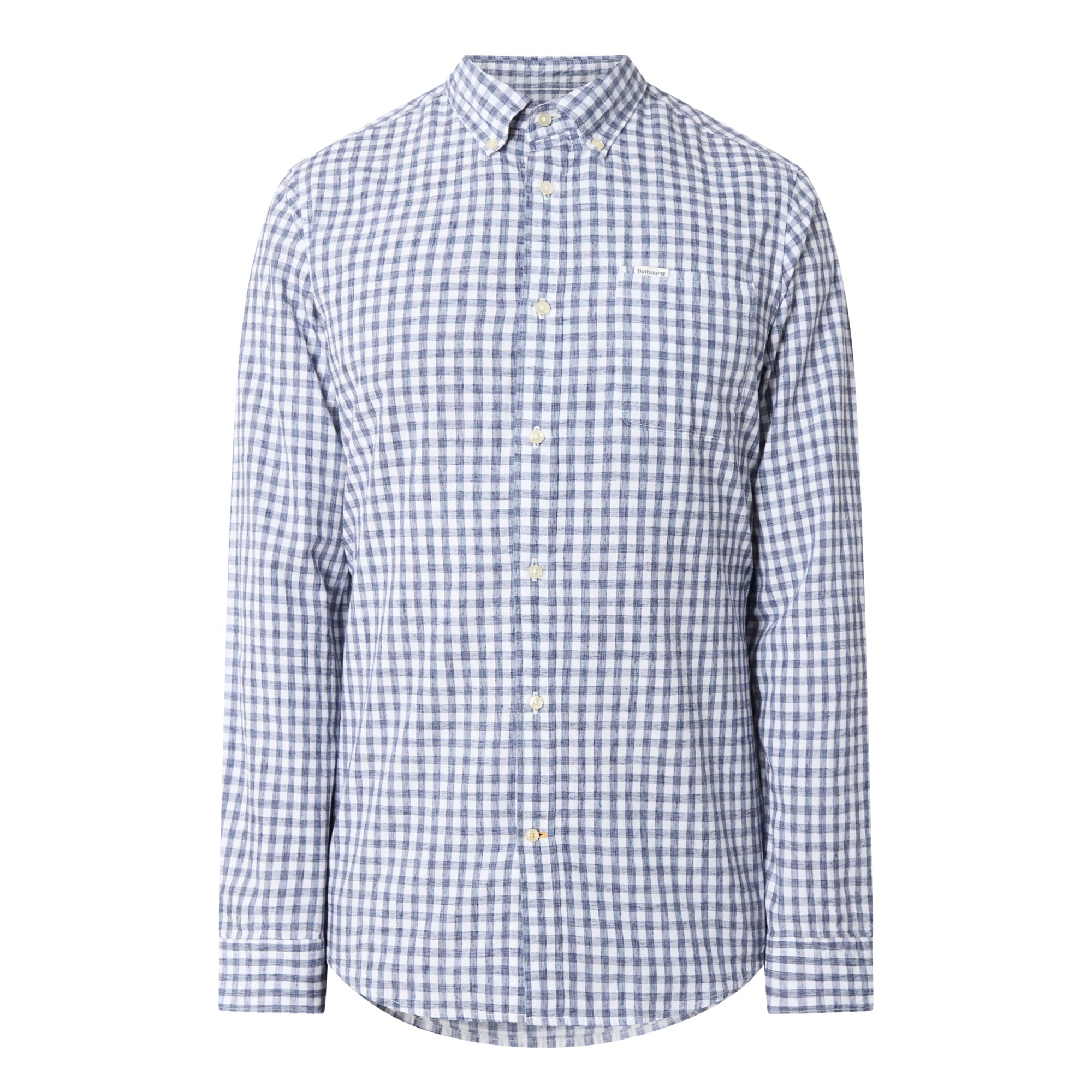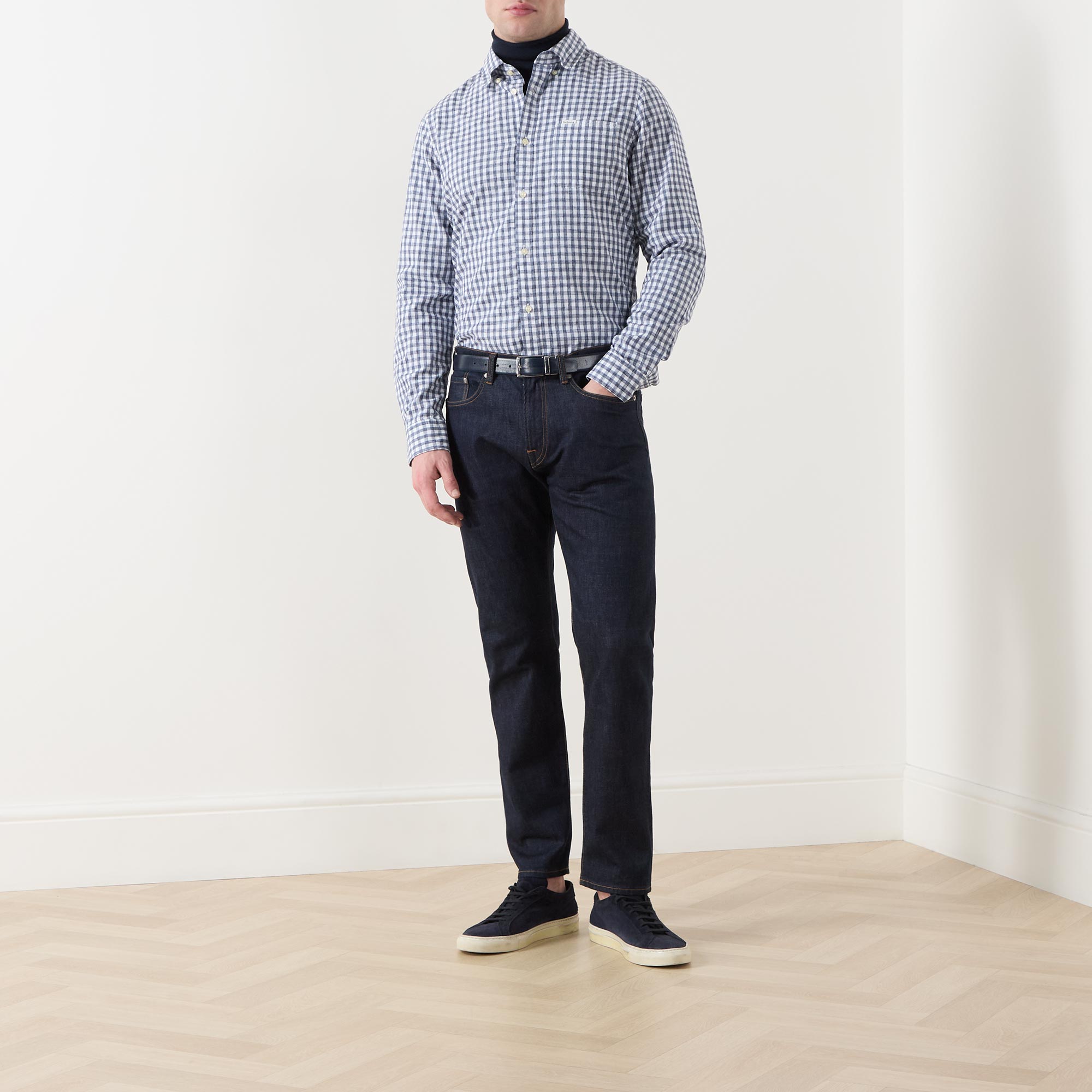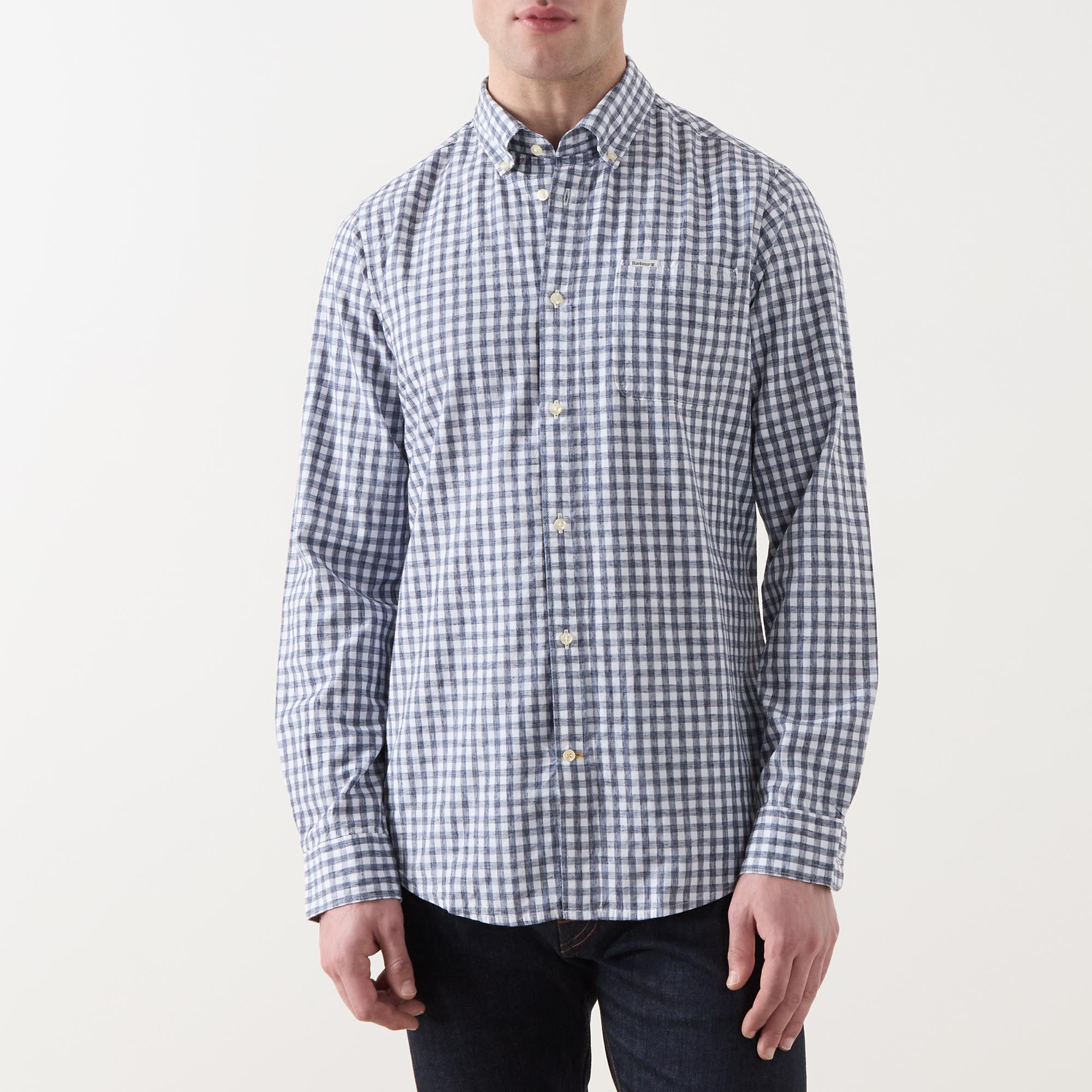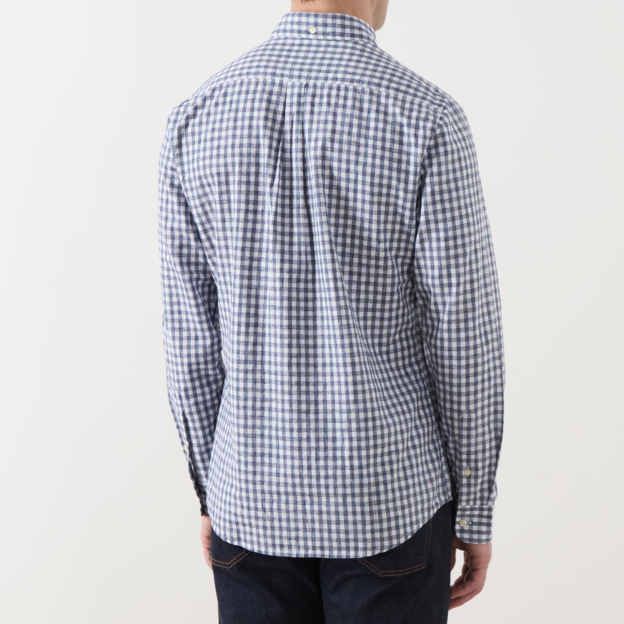 • Button-down point collar, long sleeves, buttoned cuffs, front button placket, one chest patch pocket, curved hem, rear box pleat, logo detail, gingham design