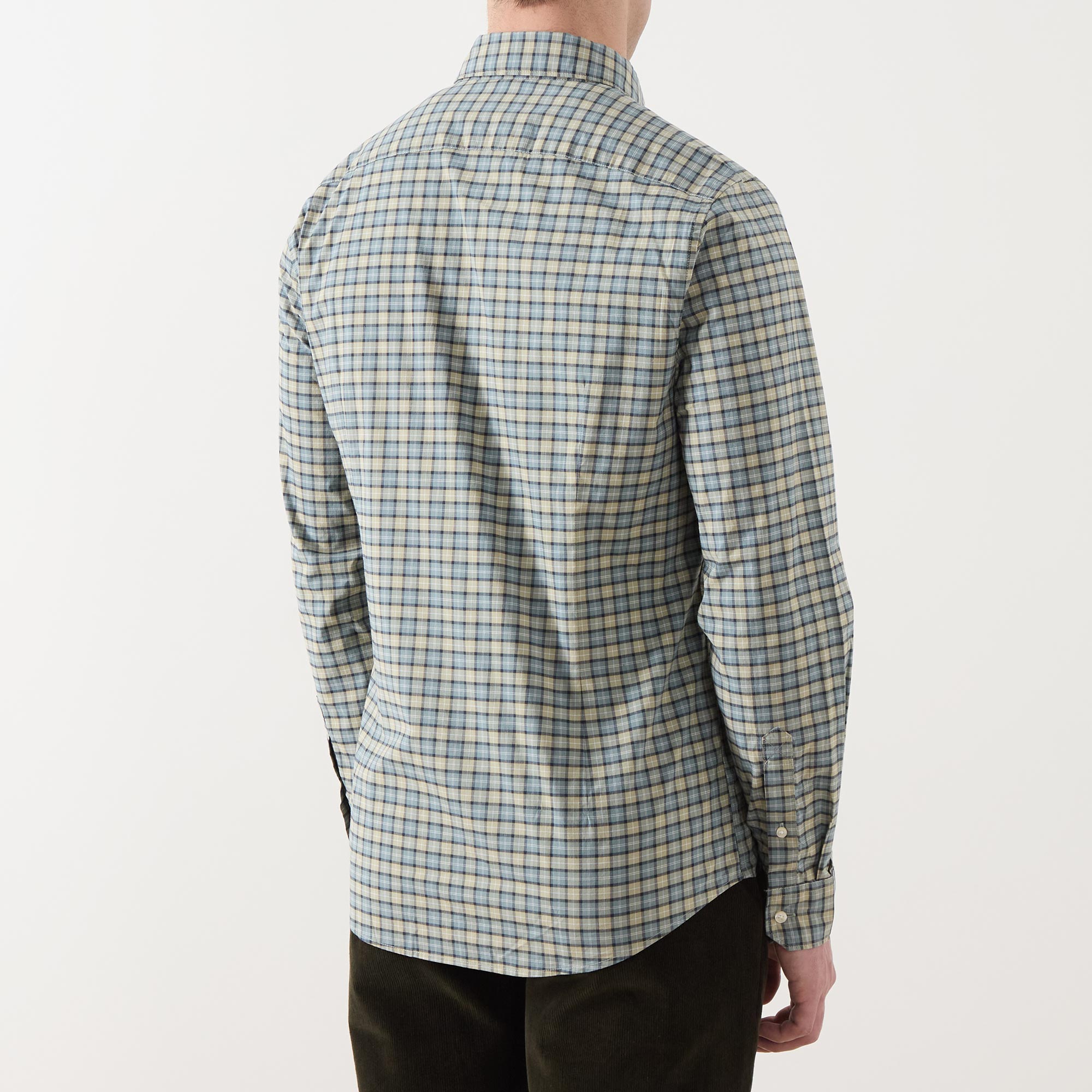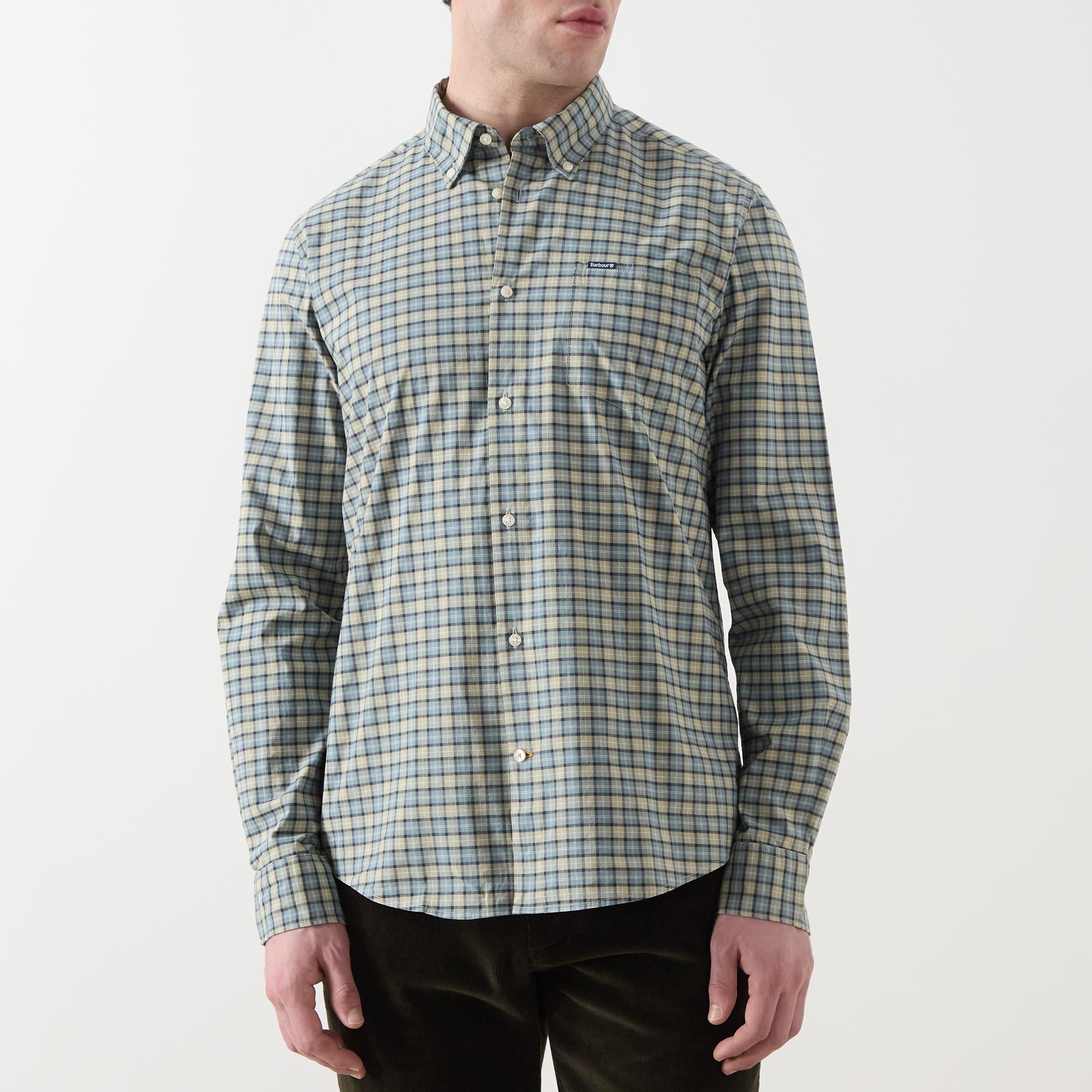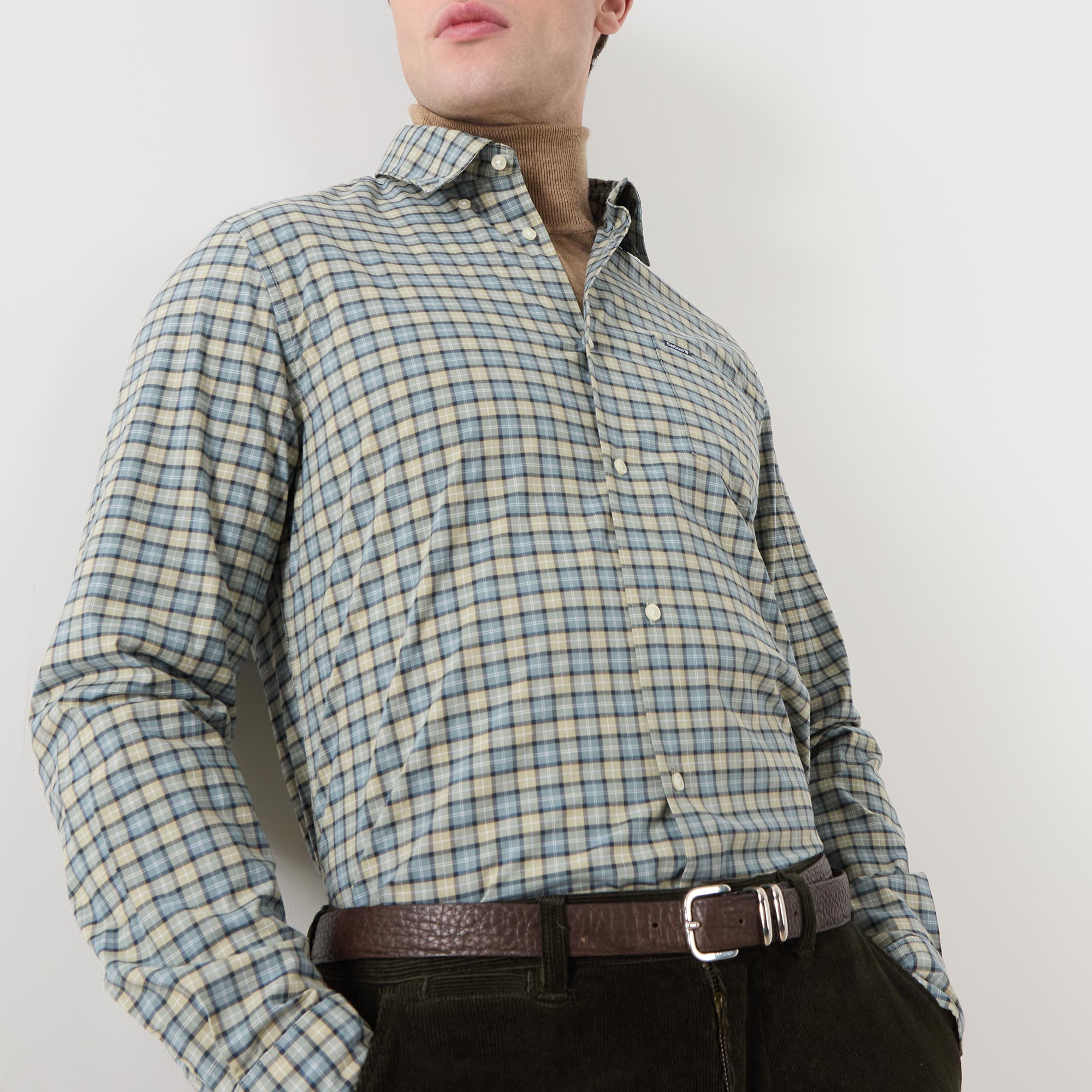 - Button-down point collar, long sleeves, buttoned cuffs, front button placket, one chest patch pocket, curved hem, rear box pleat, logo detail, tonal stitching, check design