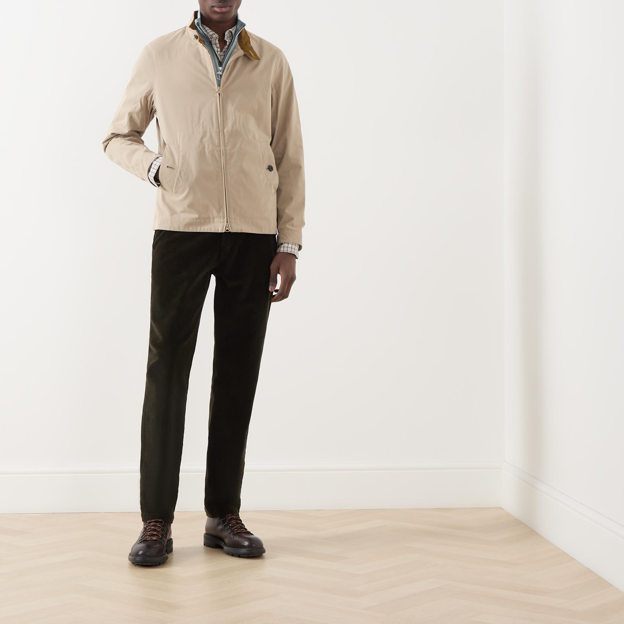 - Stand collar, button fastening, long sleeves, two-way front zip fastening, branded zipper pull, two angled pockets with button fastenings, straight adjustable hem, contrast binding, soft peached finish