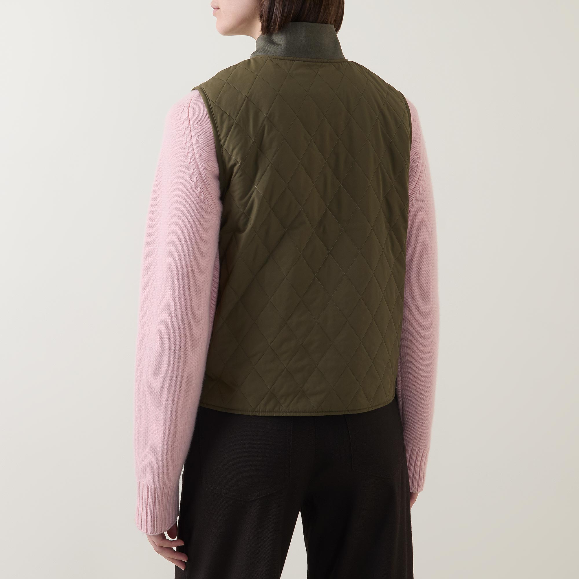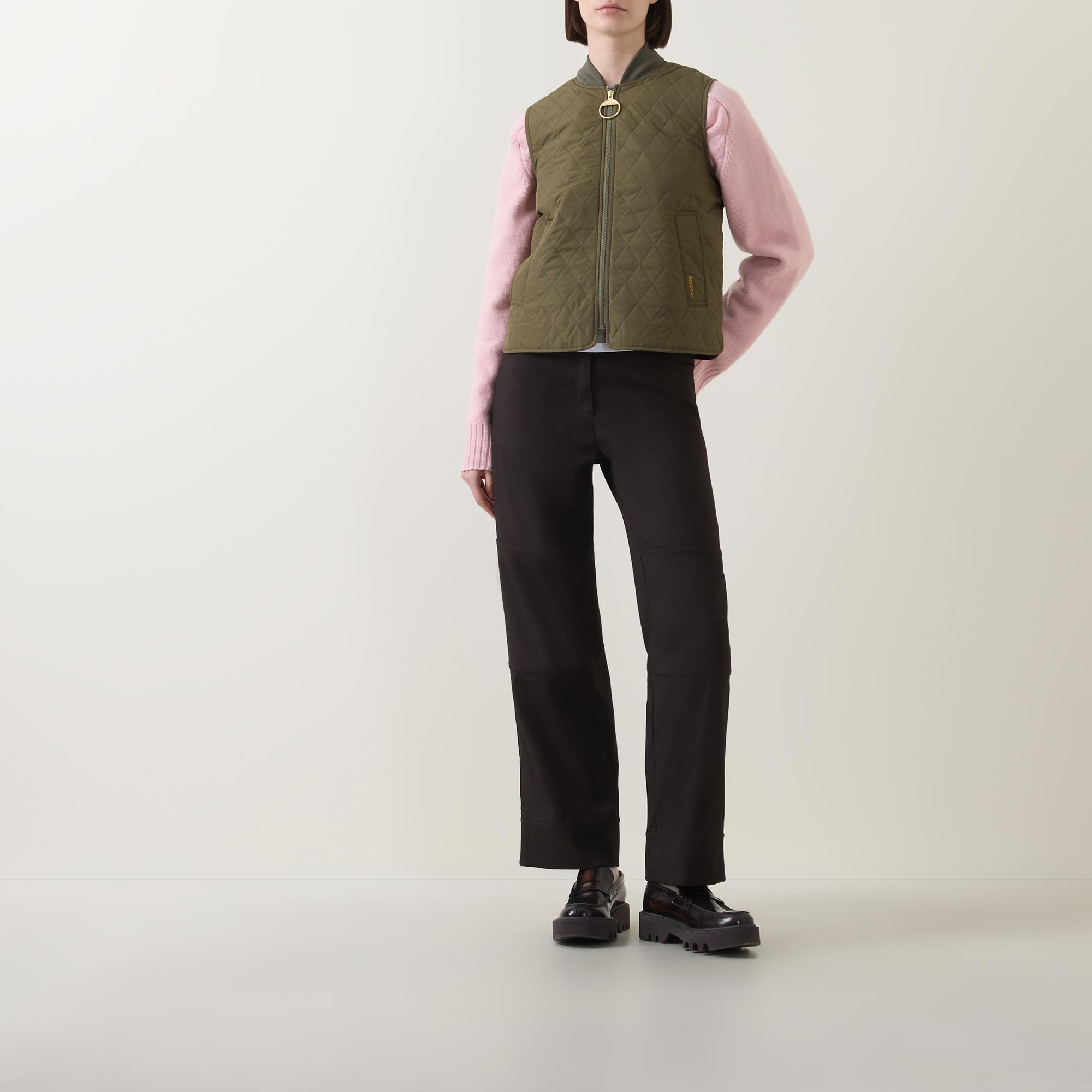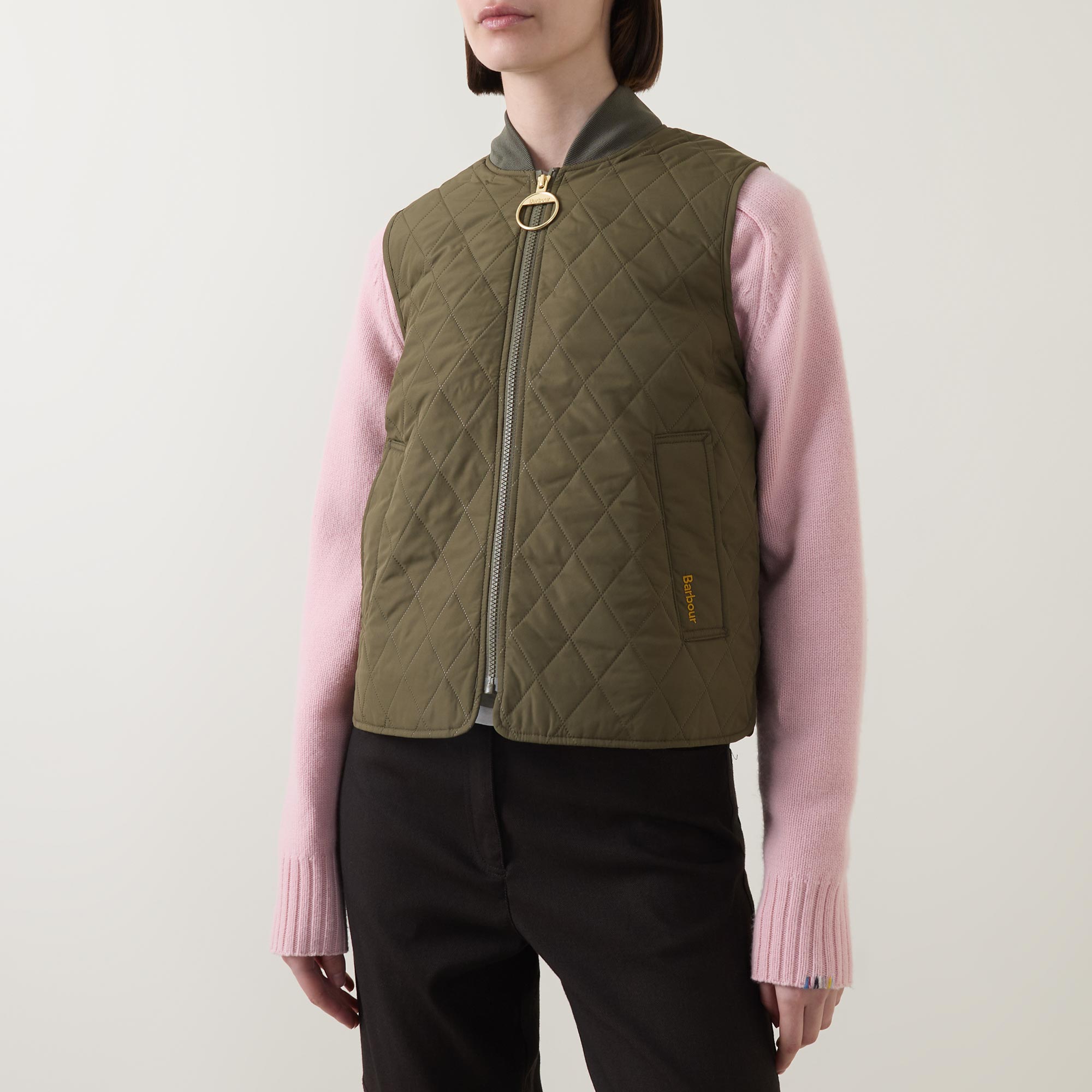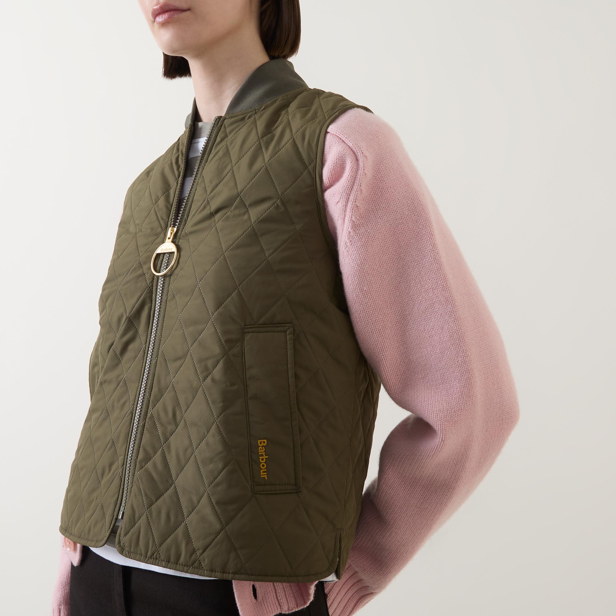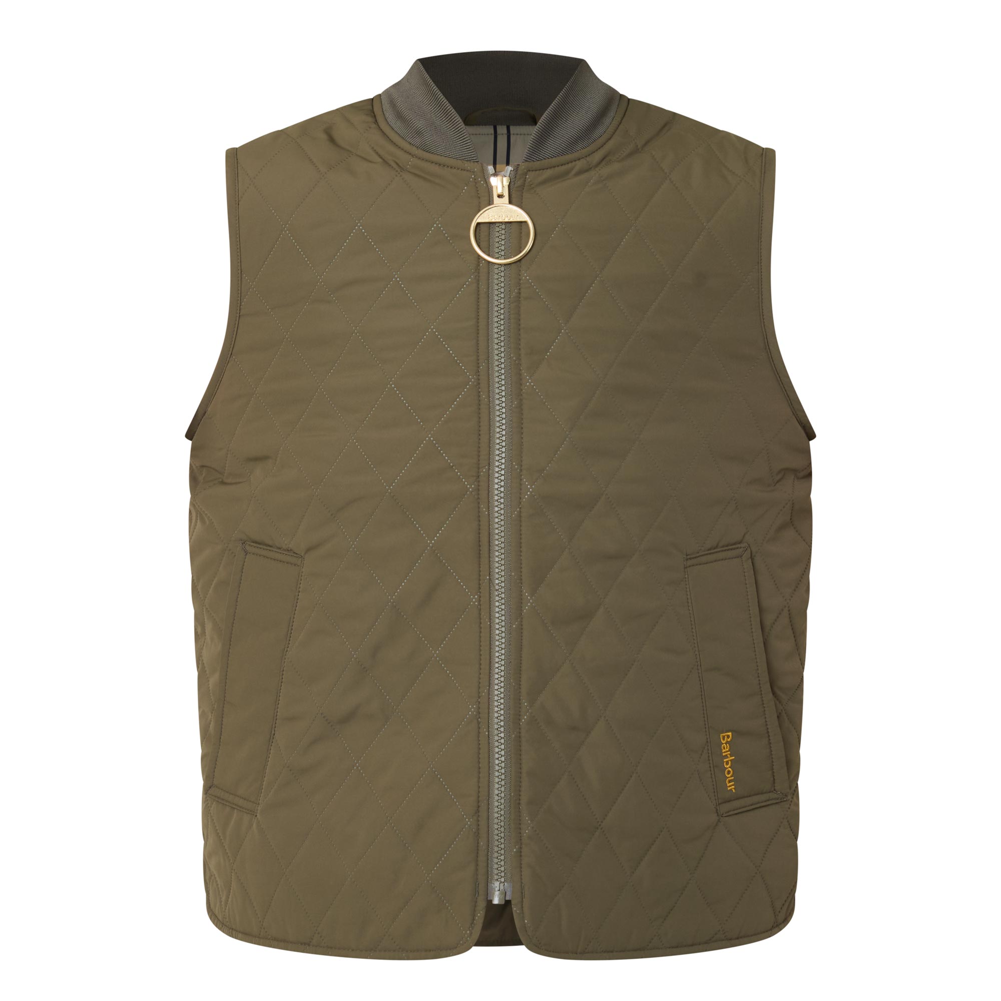 - Gilet style, quilted design, ribbed trims, smooth welt pockets, chunky zip fastening, oversized ring pull tab, curved side split hem, signature tartan buggy lining, brand logo details, sleeveless, shawl neckline