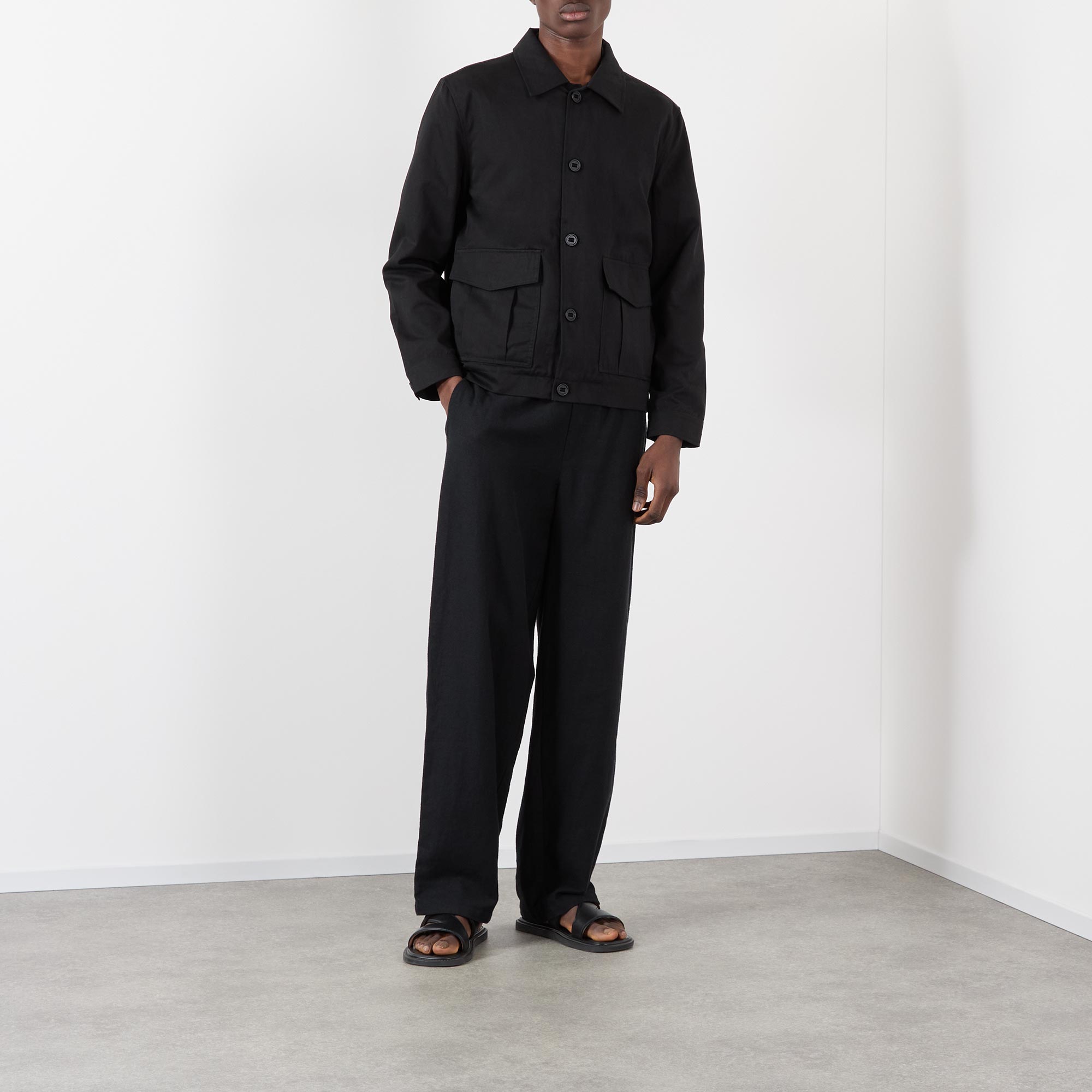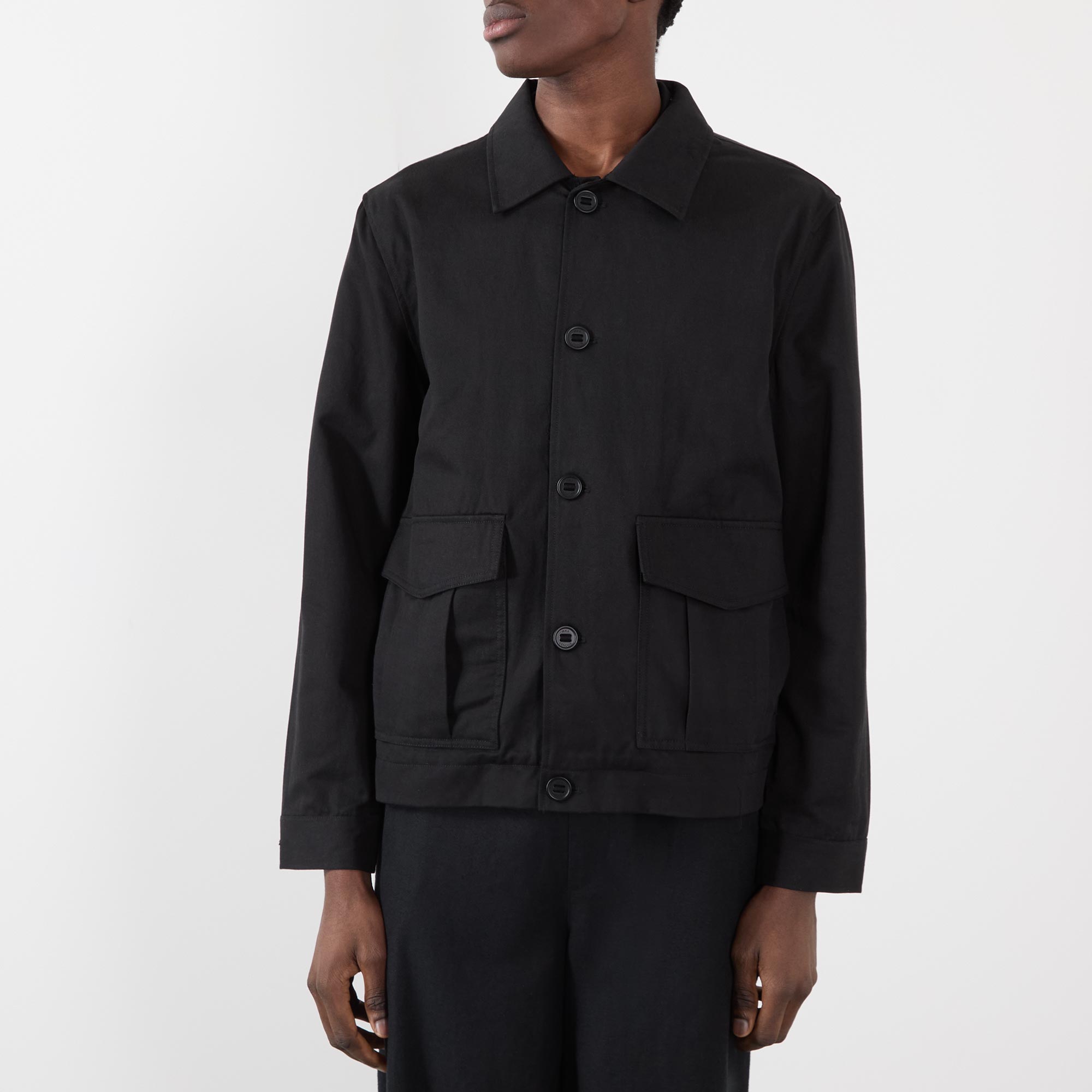 - Point collar, long sleeves, buttoned cuffs, front button fastening, two large flap pockets, straight hem