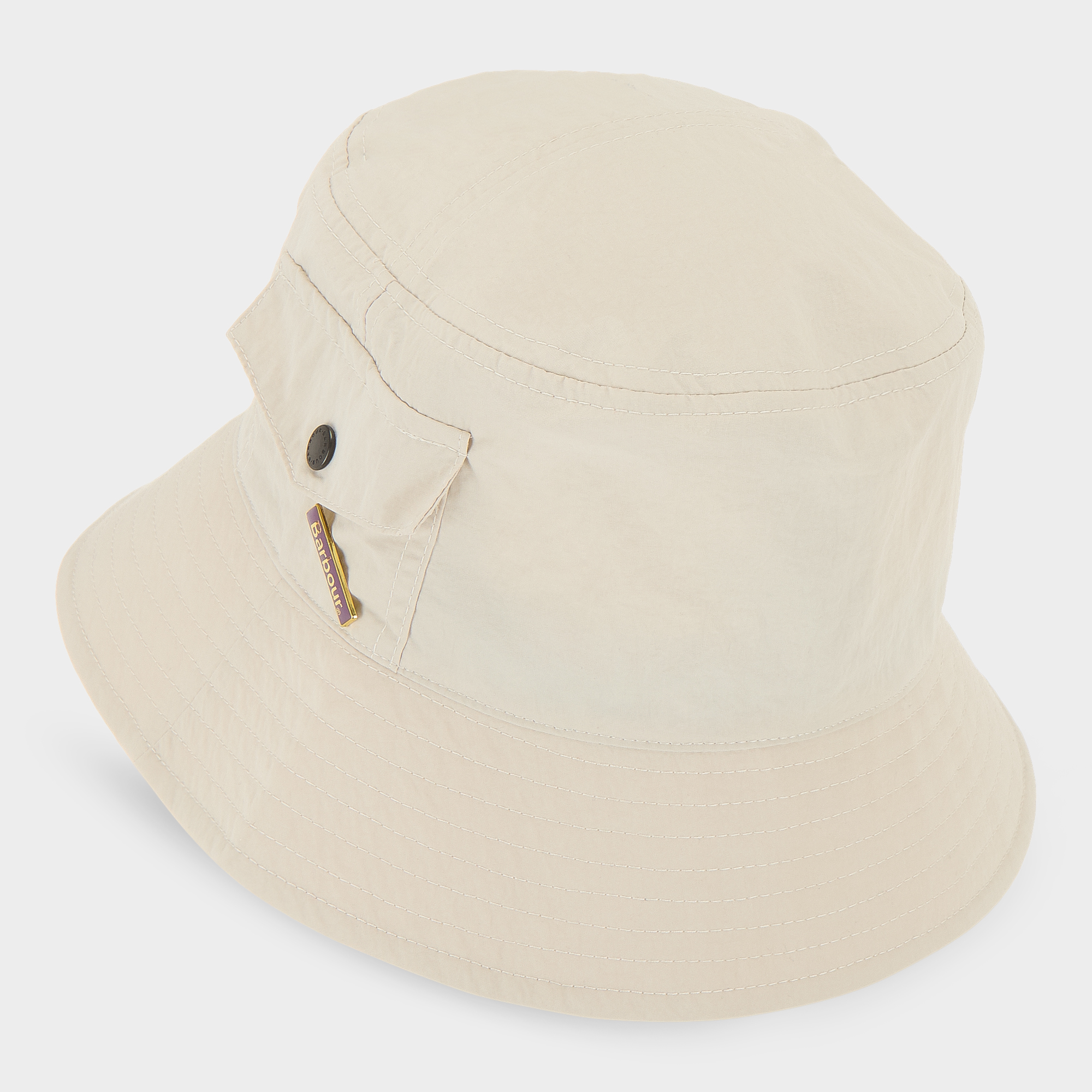 - Bucket style, pocket detail at side, logo details, showerproof finish