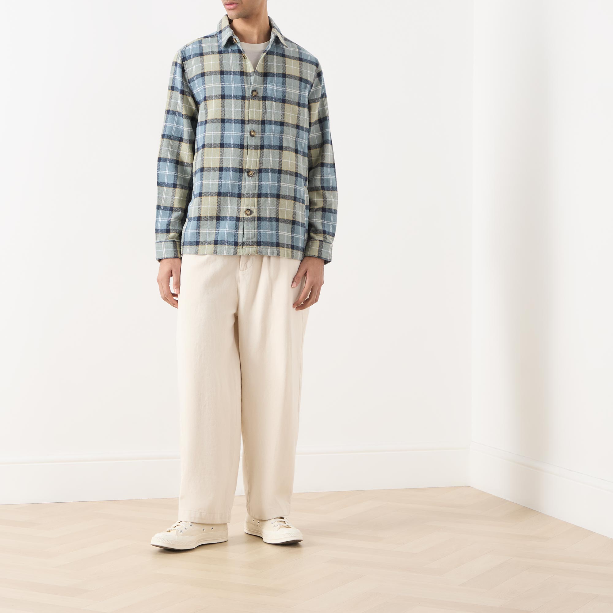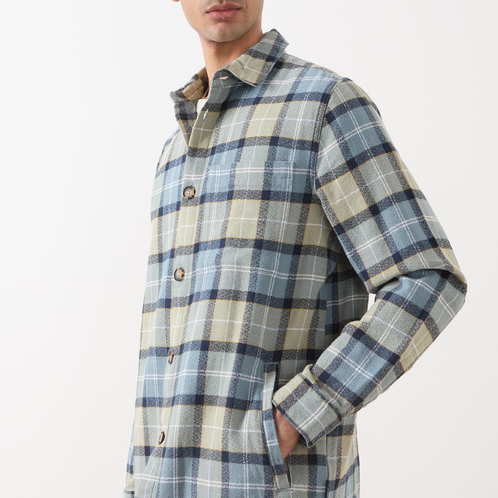 - Point collar, long sleeves, buttoned cuffs, front button fastening, two side welt pockets, straight hem, logo tag, tartan print, textured crepe finish