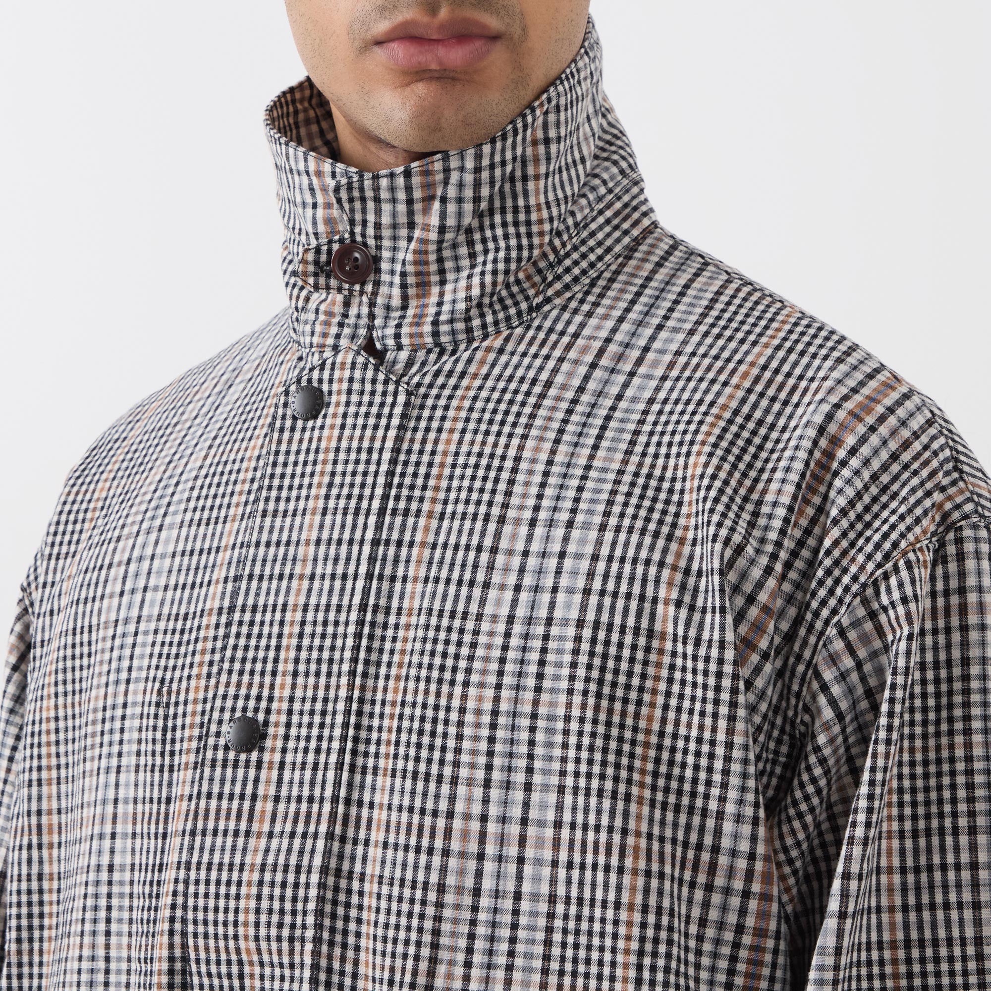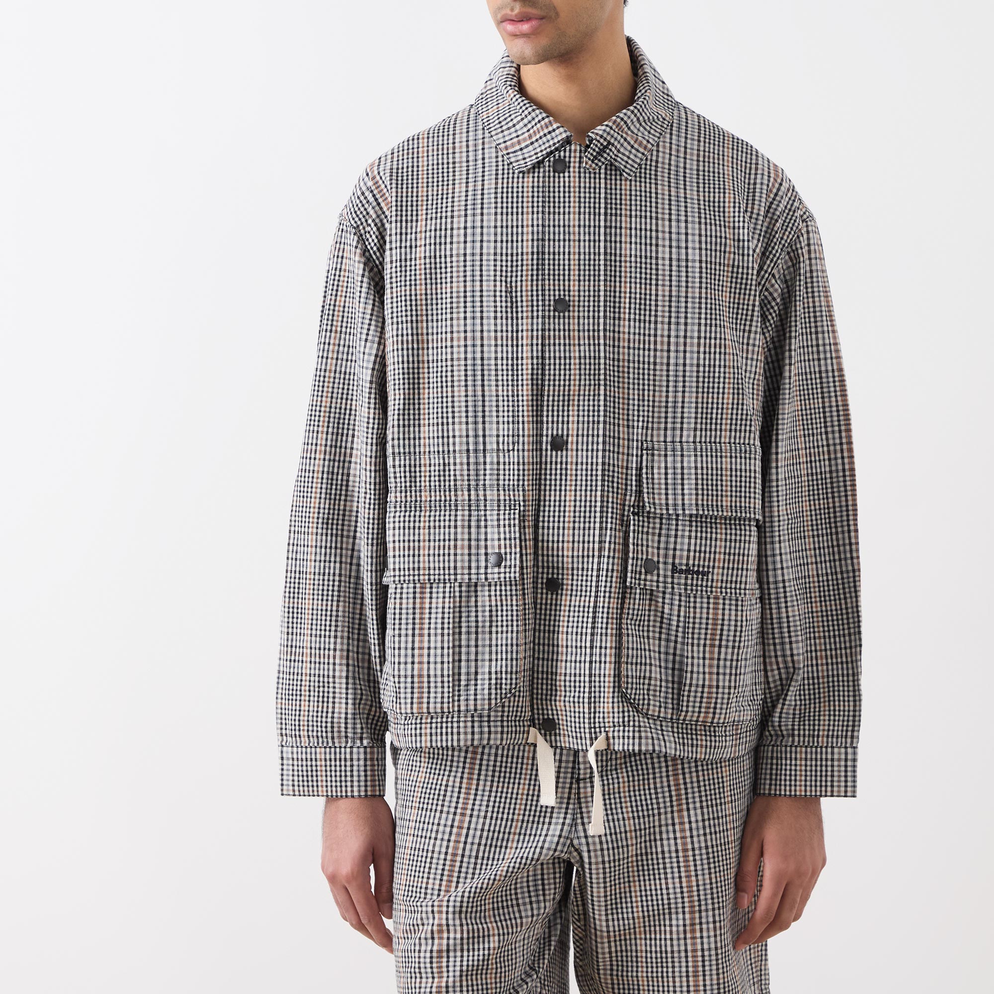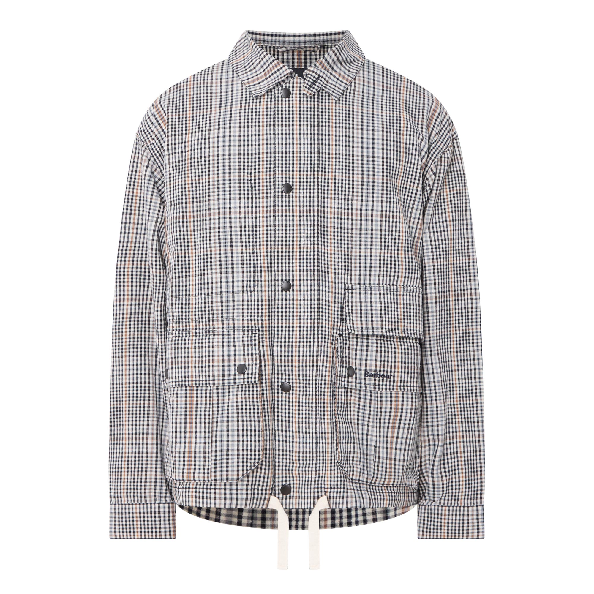 - Point collar, dropped shoulders, long sleeves, snap button cuffs, front zip fastening, additional snap button placket, two large flap pockets with snap button closures, straight hem with adjustable drawstring fastening, tartan print, embroidered logo detail