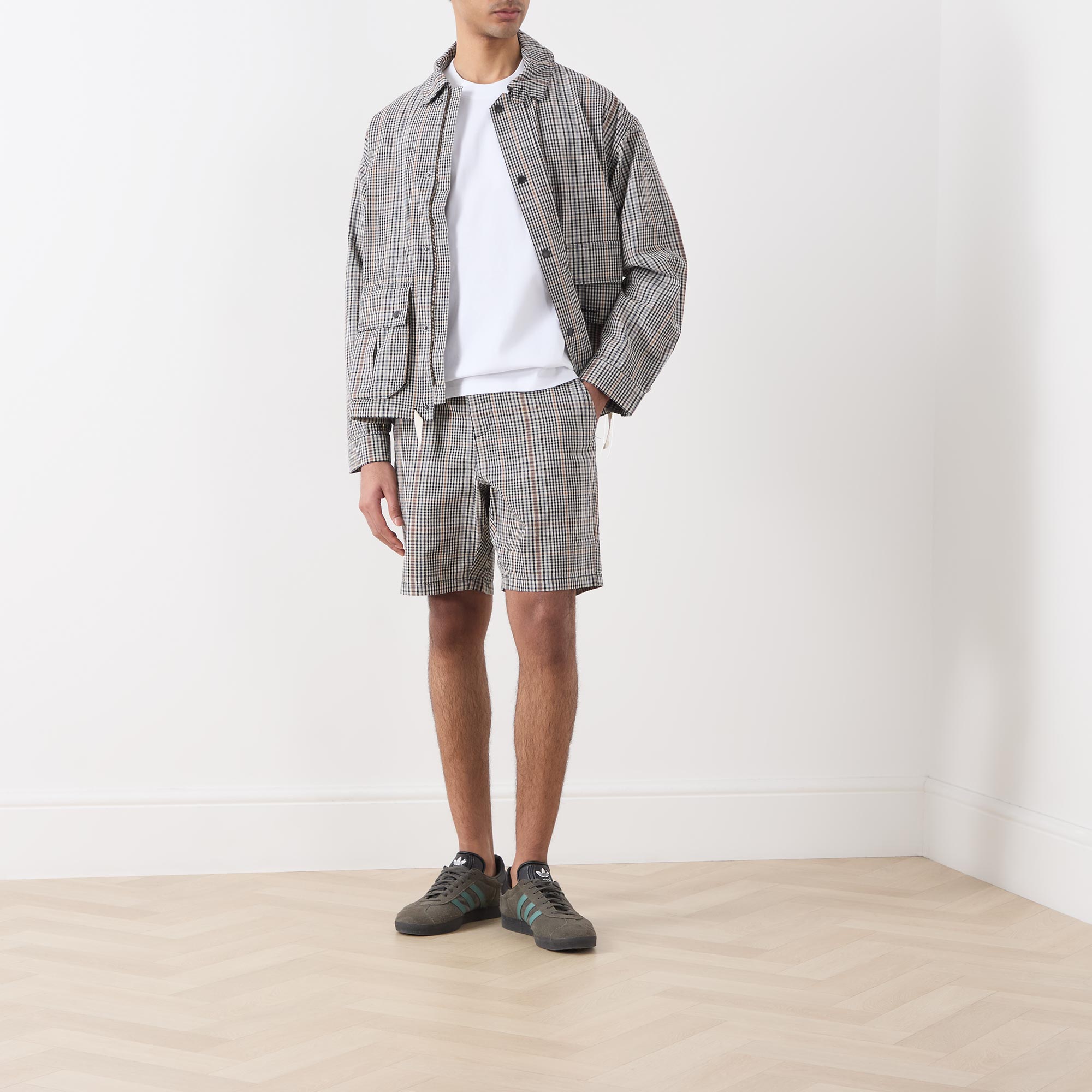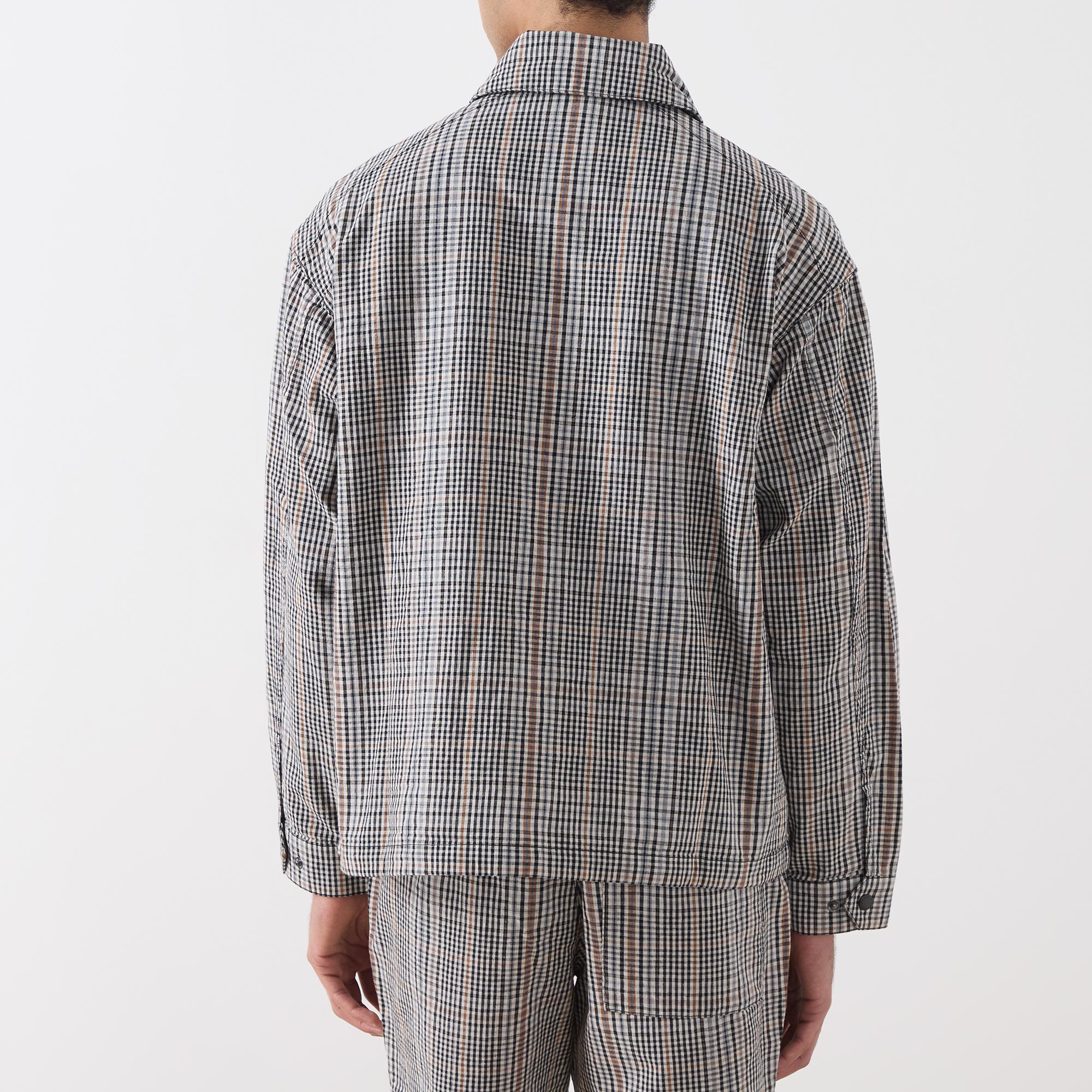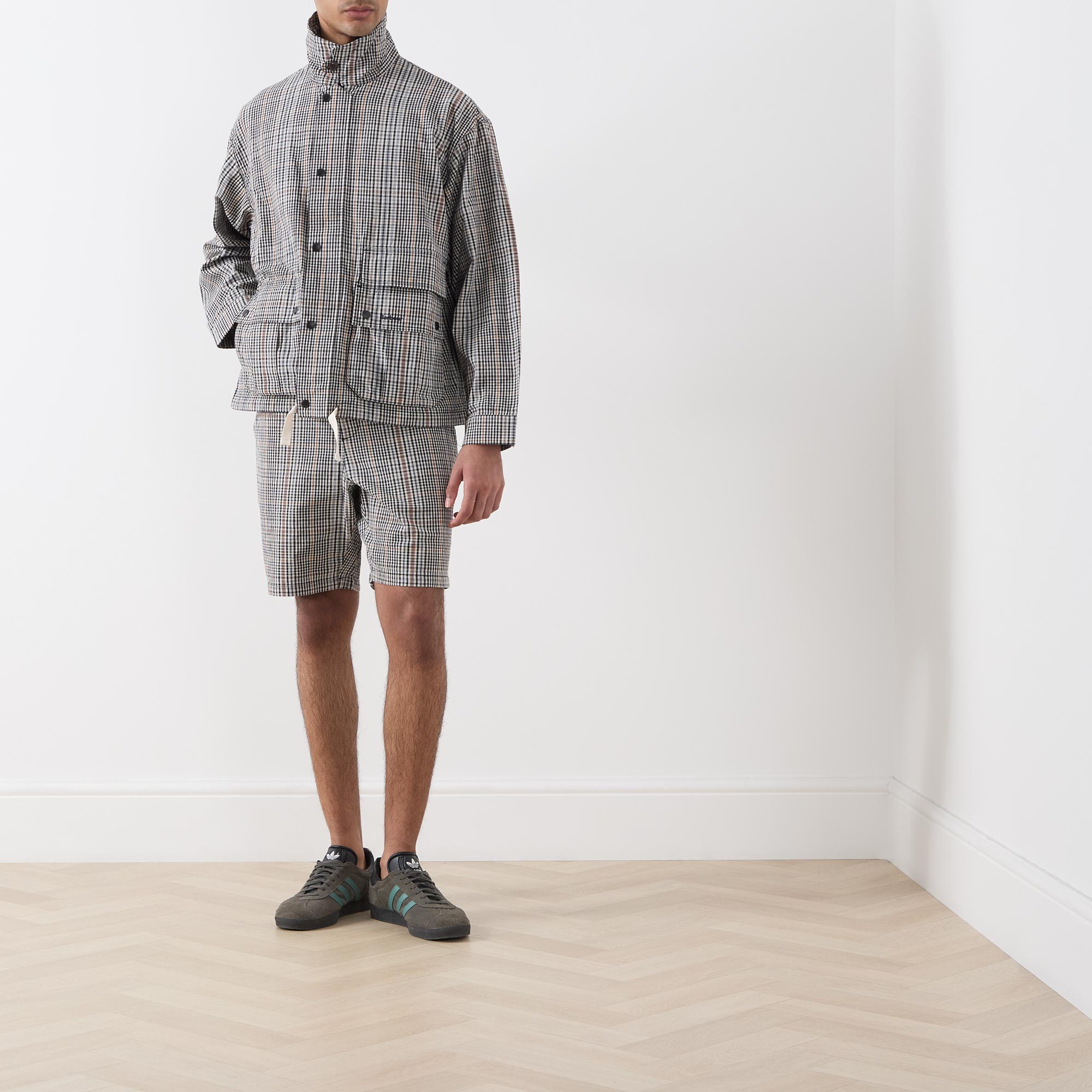- Point collar, dropped shoulders, long sleeves, snap button cuffs, front zip fastening, additional snap button placket, two large flap pockets with snap button closures, straight hem with adjustable drawstring fastening, tartan print, embroidered logo detail