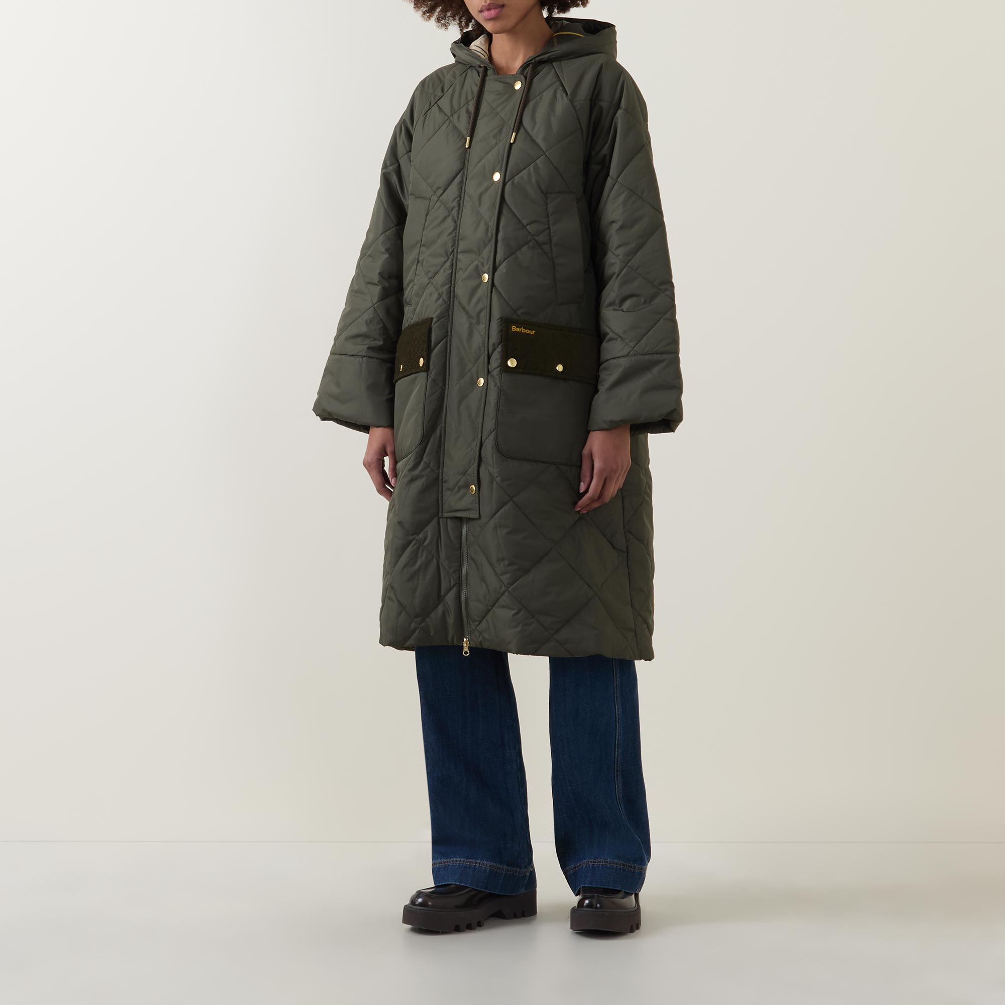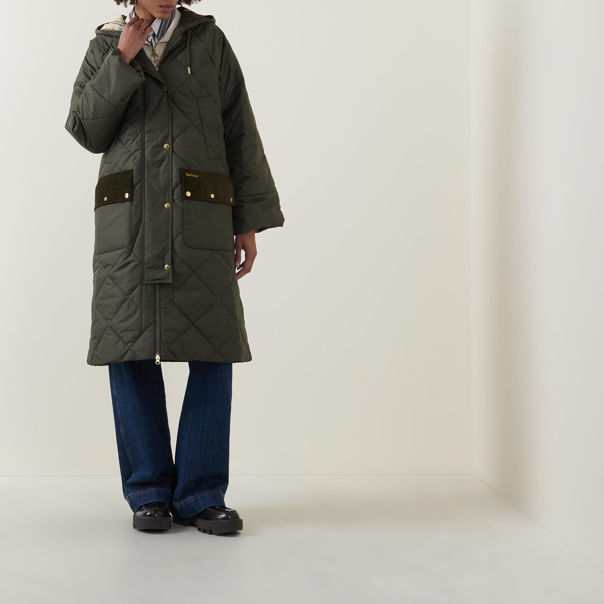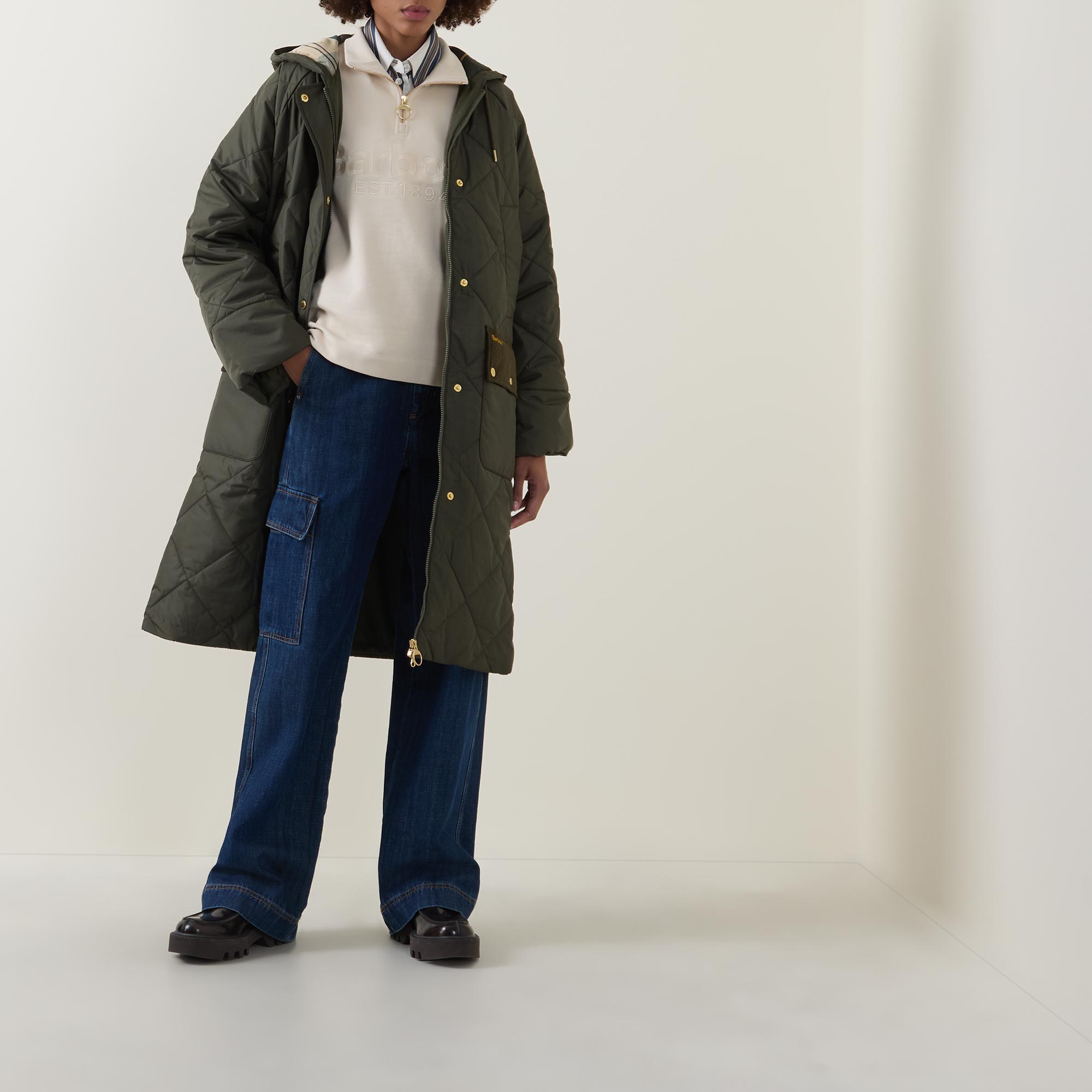 • Long sleeves, concealed zip and button fastening, front flap pockets, logo detail, drawstring hood, quilted, longline length
