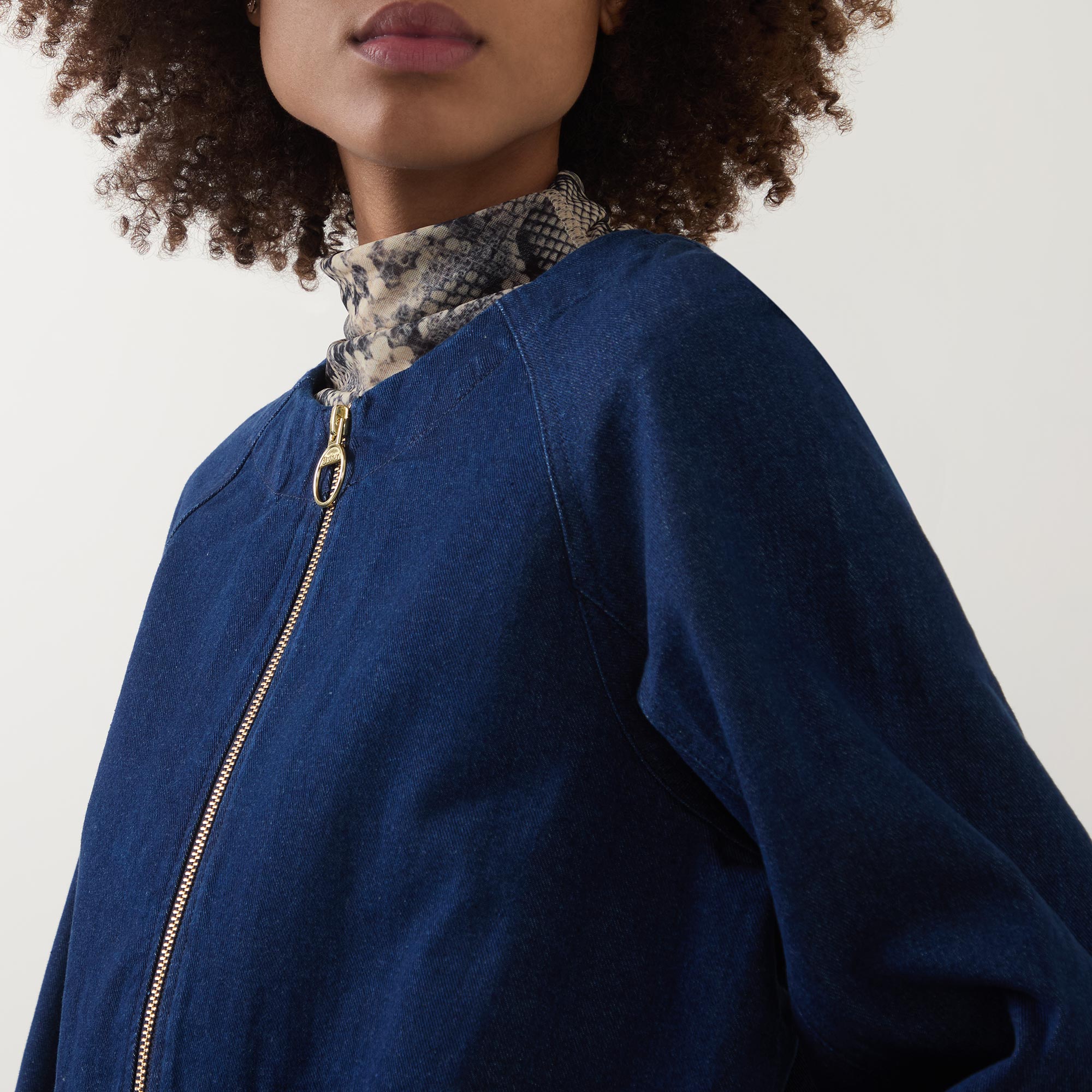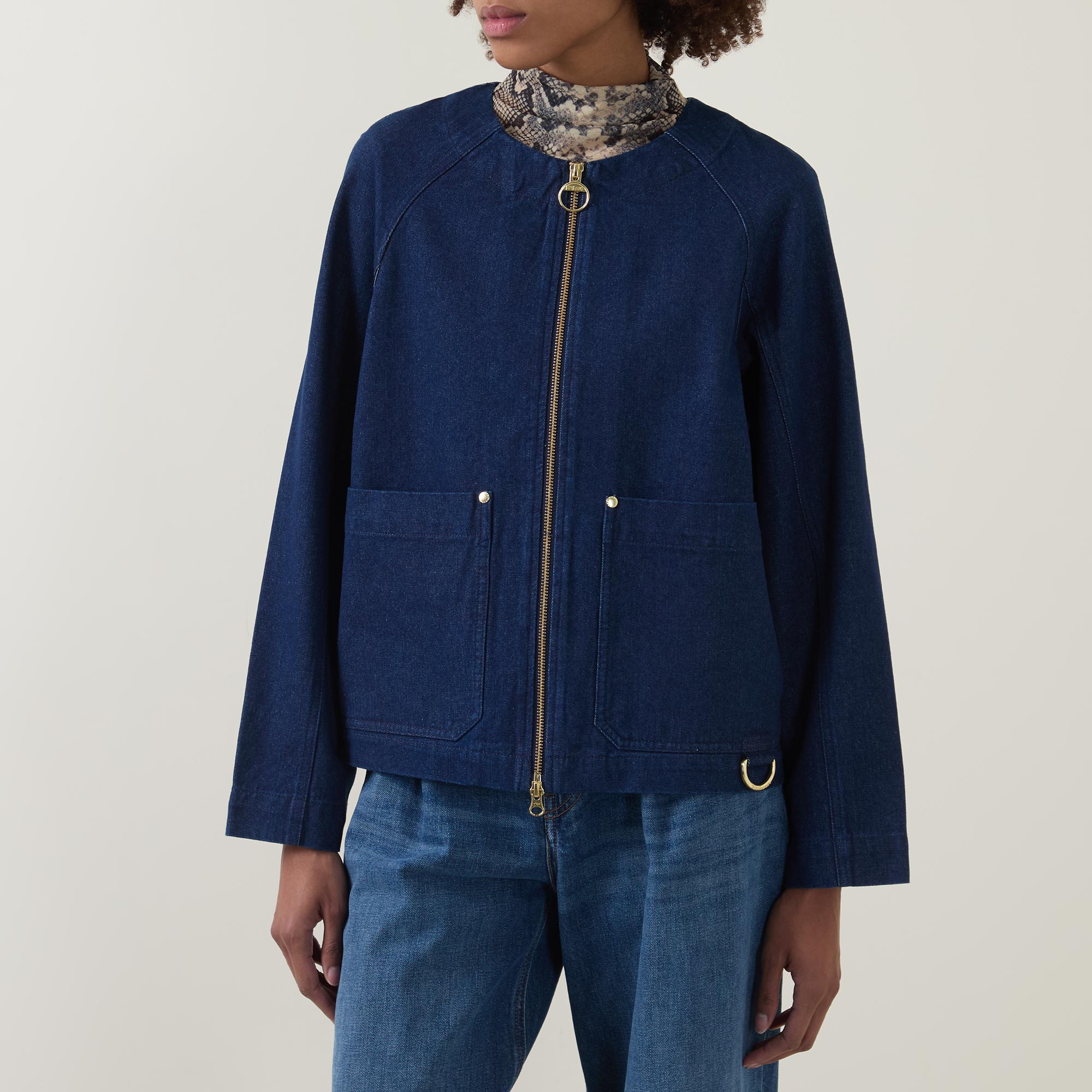 - Round neckline, long sleeves, zip fastening, denim design, front pockets, logo detail