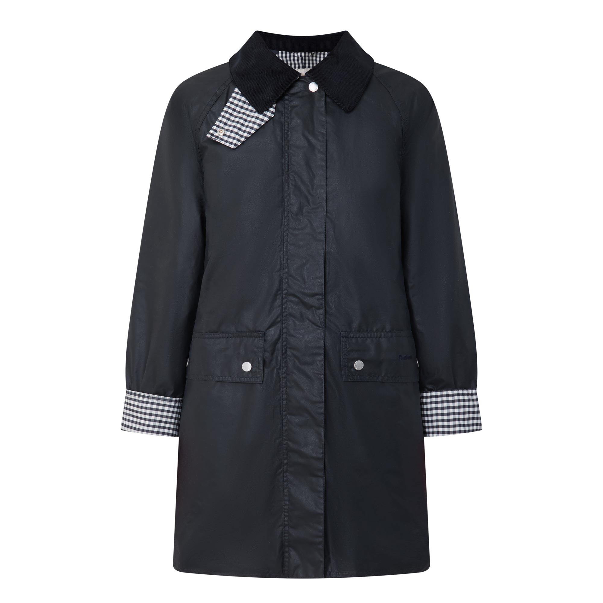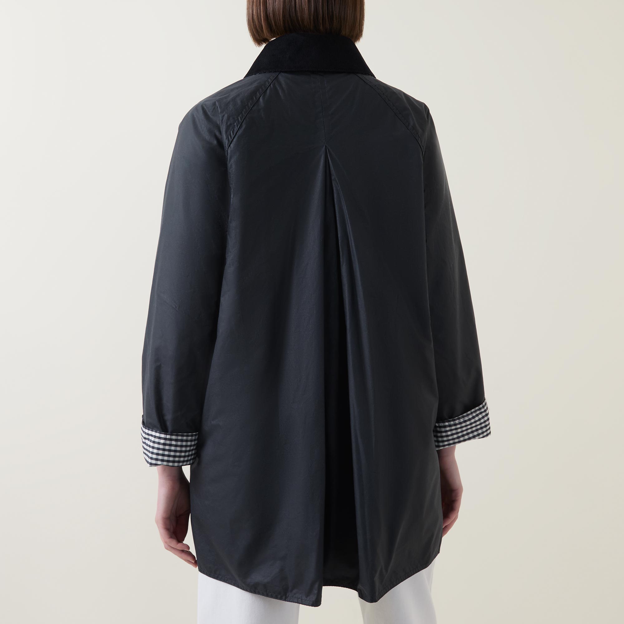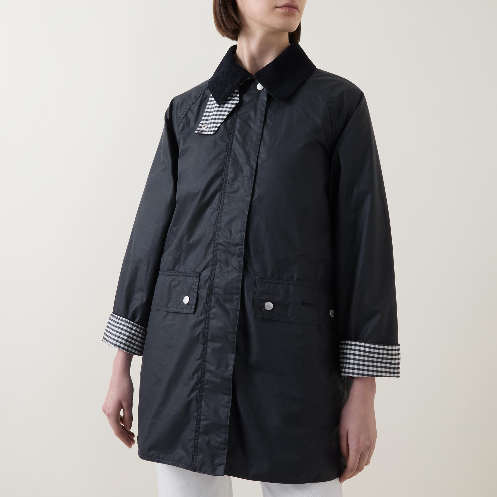 • Corduroy collar, gingham underlining, throat tab with snap button fastening, long sleeves, front zip fastening, additional snap button placket, two large flap pockets with snap button fastenings, straight hem, rear knife pleat, embroidered logo detail, longline design, waxed finish