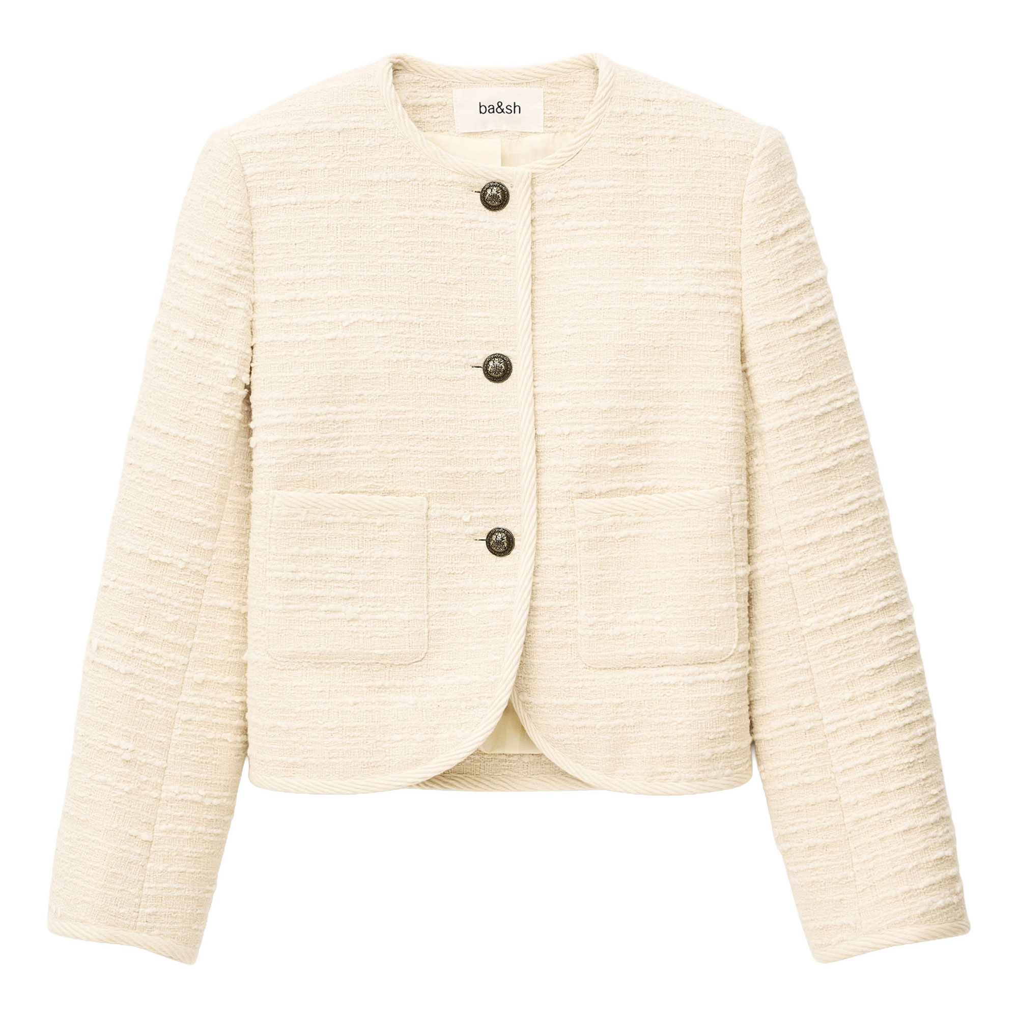 - Rounded shape, front button fastening, shoulder pads, patch pockets, trim detail, lining