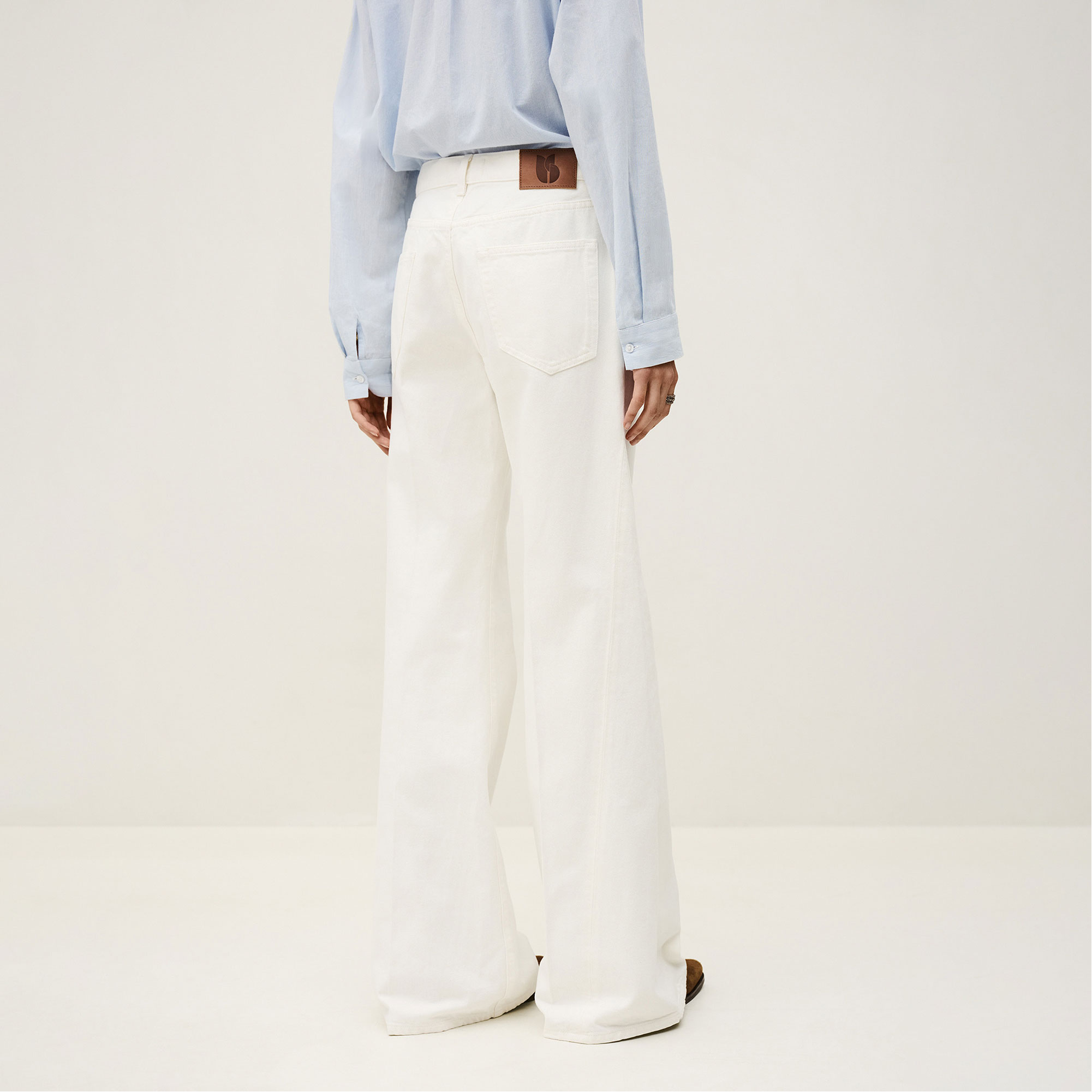 - Five-pocket style, flared cut, side yokes at bottom of leg, button fly, belt loops
