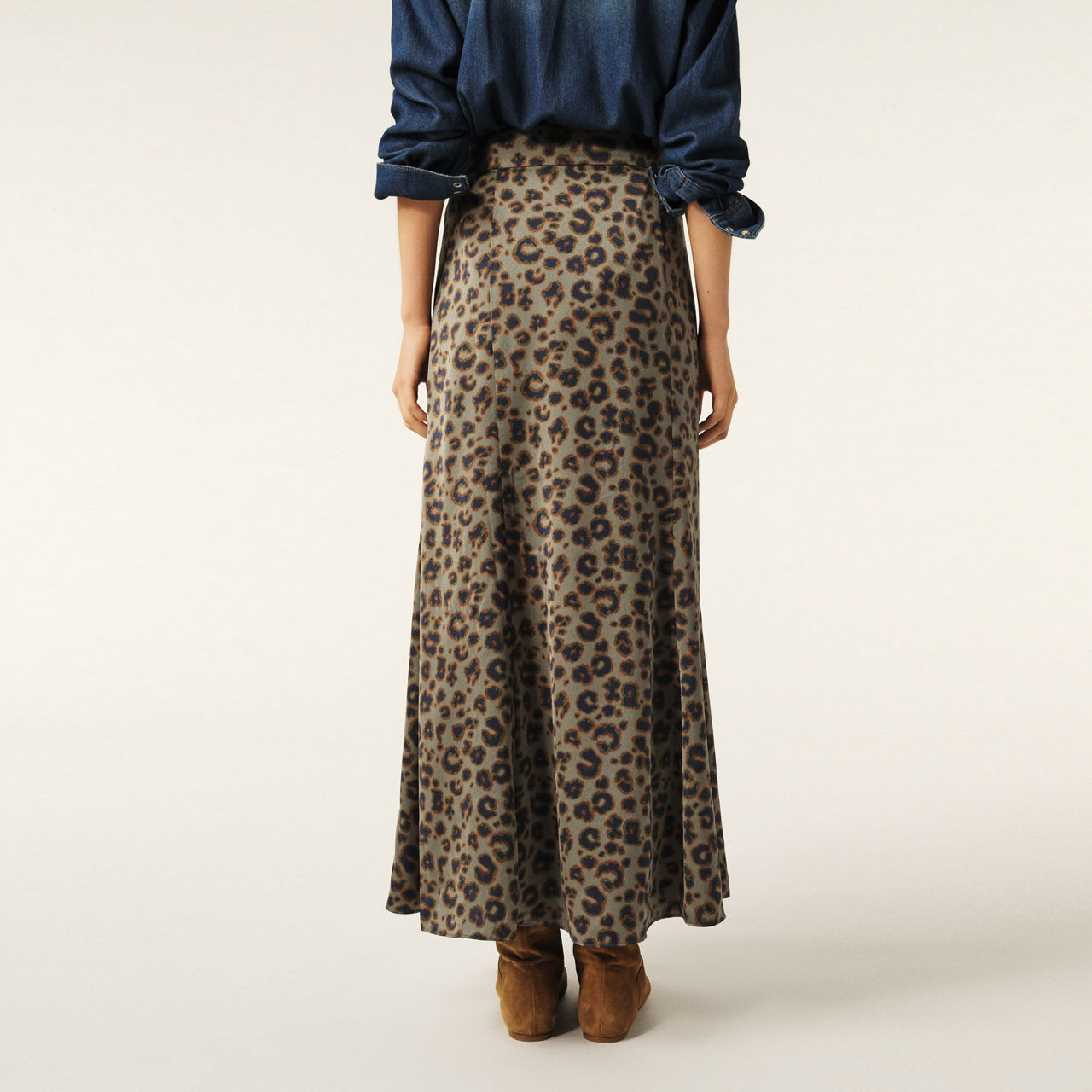 - Maxi length, leopard print, triangular cut at waist, side zip fastening
