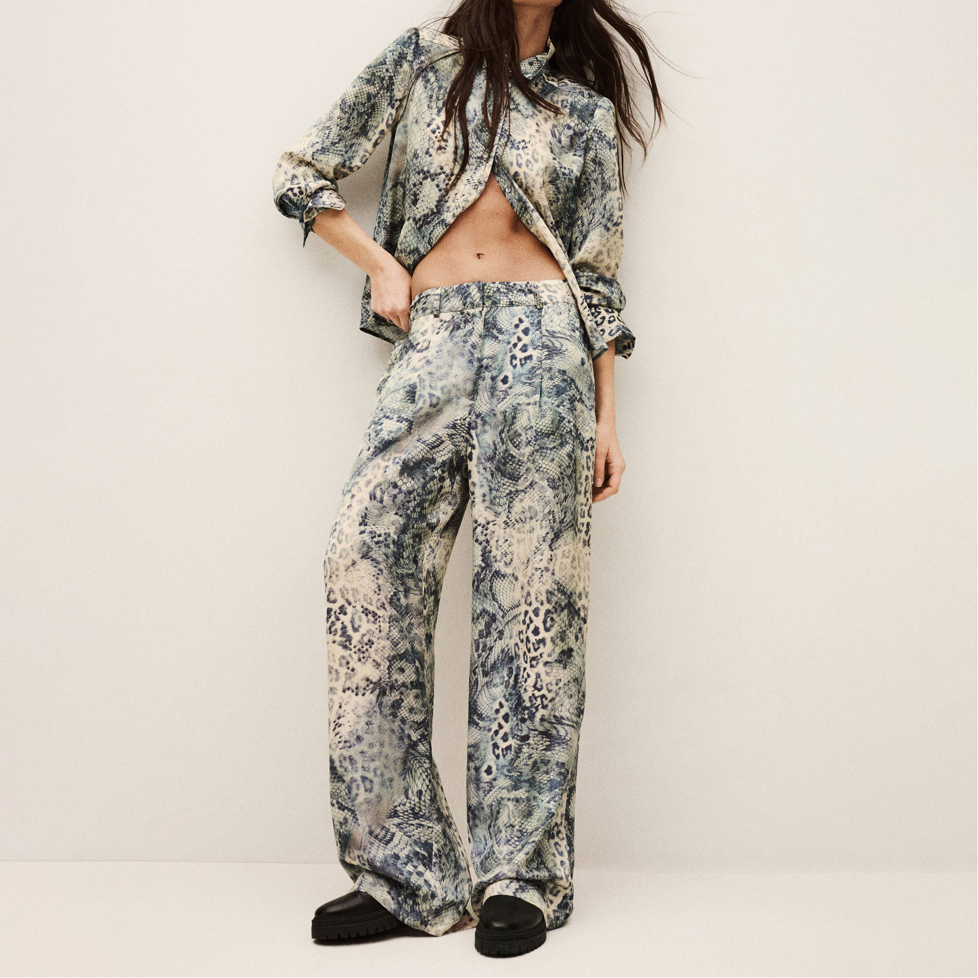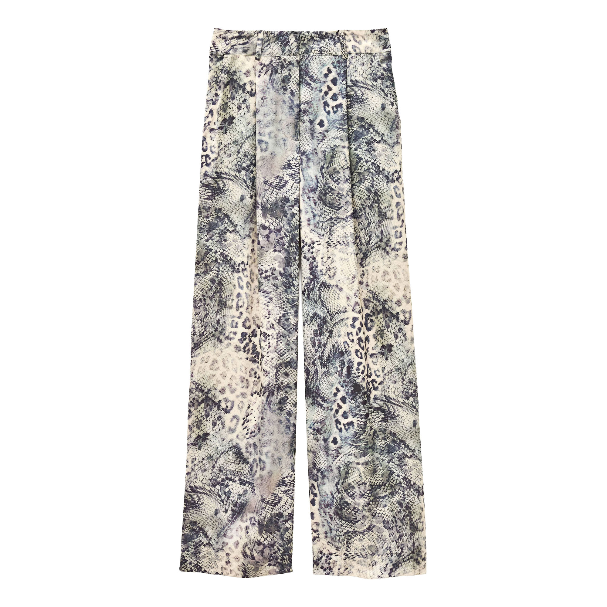 - Wide-leg, front pleats, slant front pockets, piped back pocket, clean hems, snake print pattern