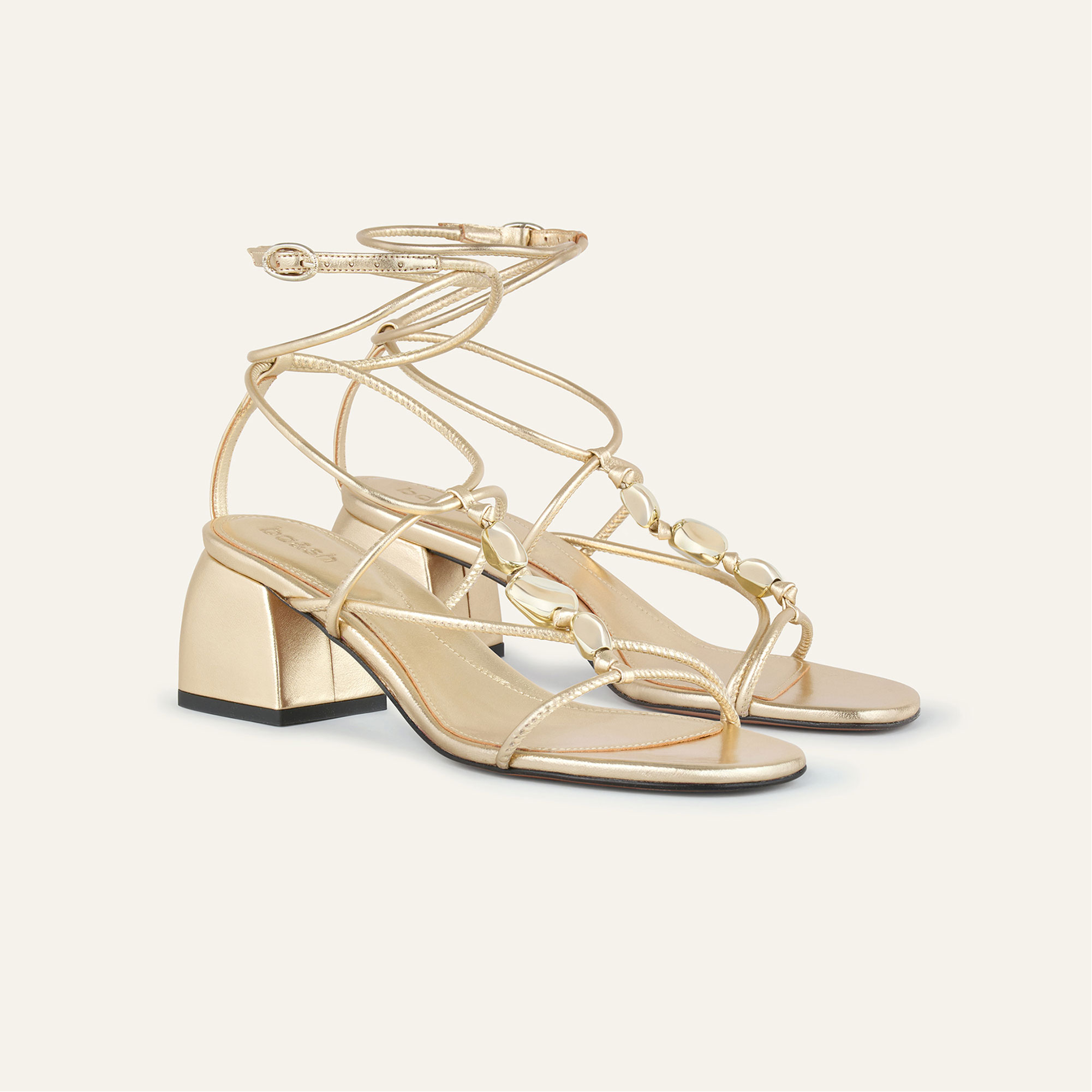• Lambskin leather, block heel, fine tubular straps, bead embellishment, signature buckle fastening, foam-padded insole