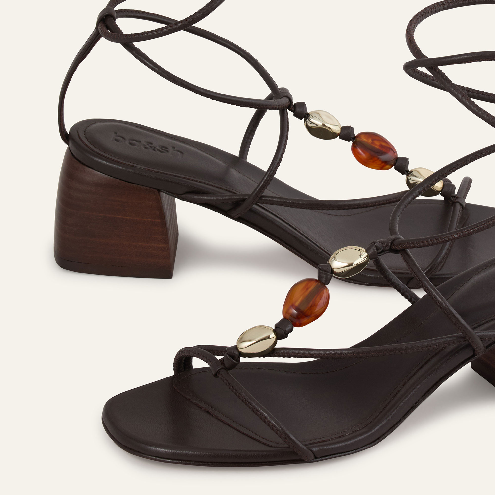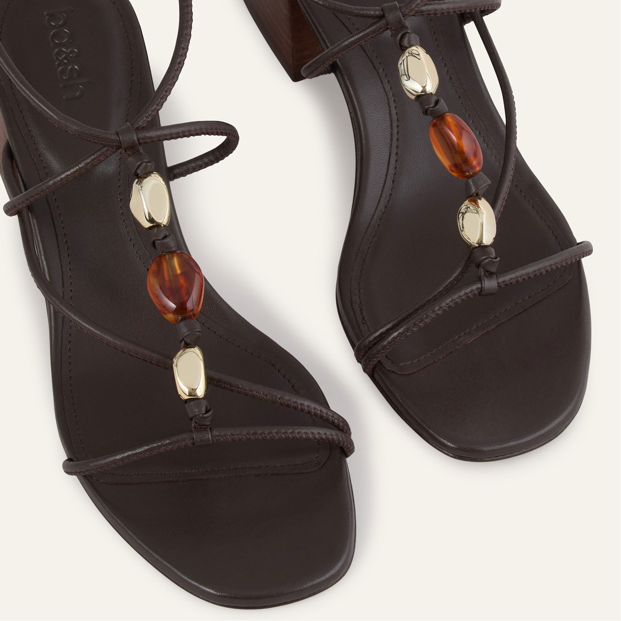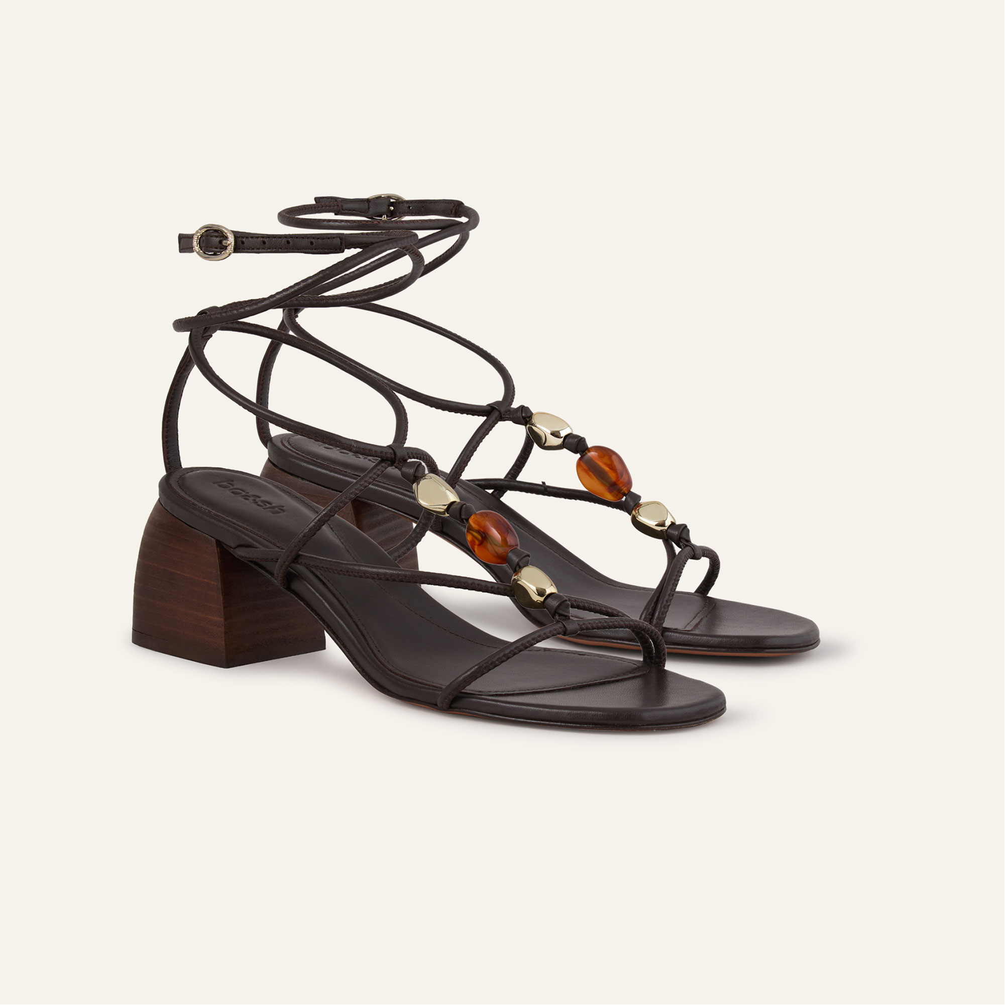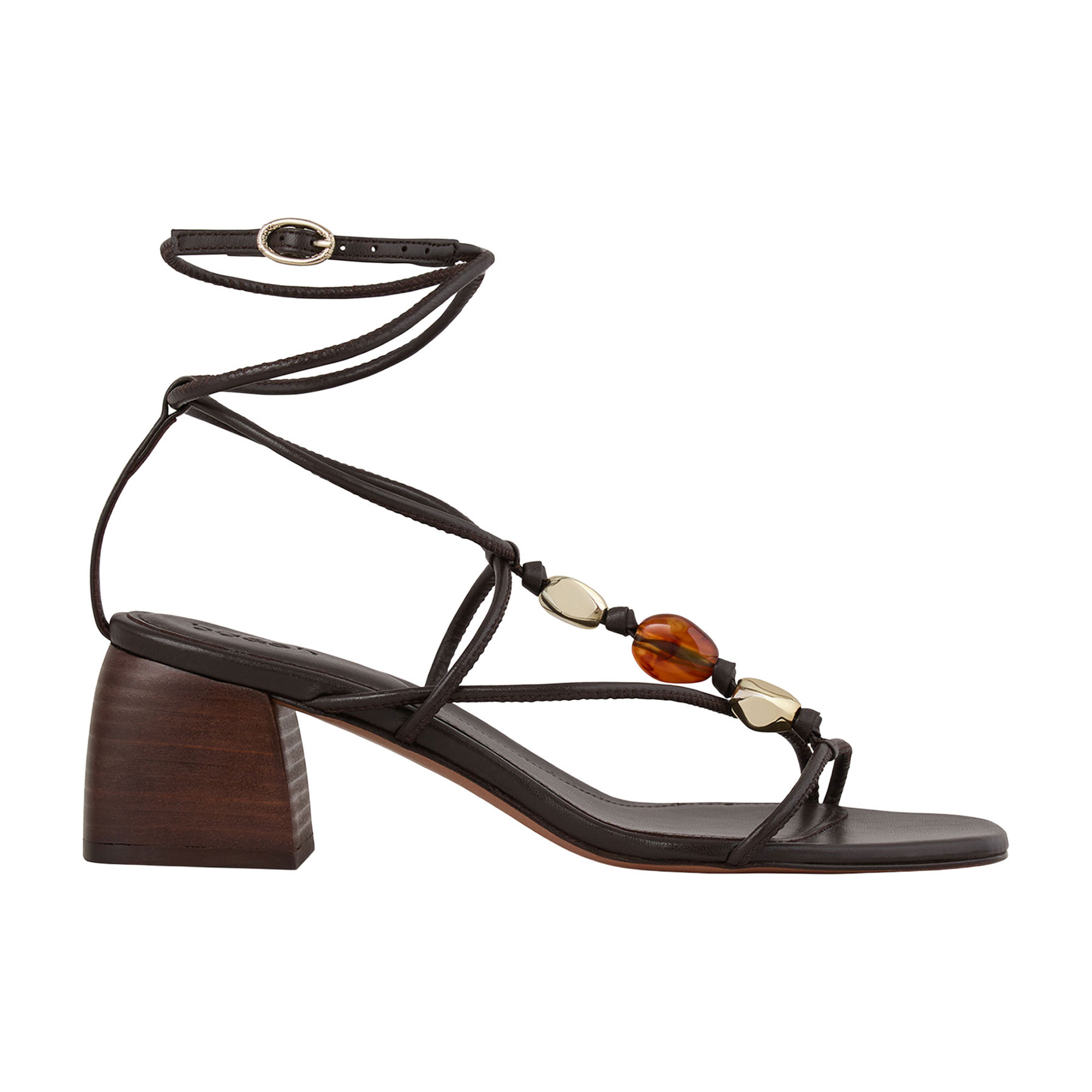 - Lambskin leather, block heel, fine tubular straps, bead embellishment, signature buckle fastening, foam-padded insole