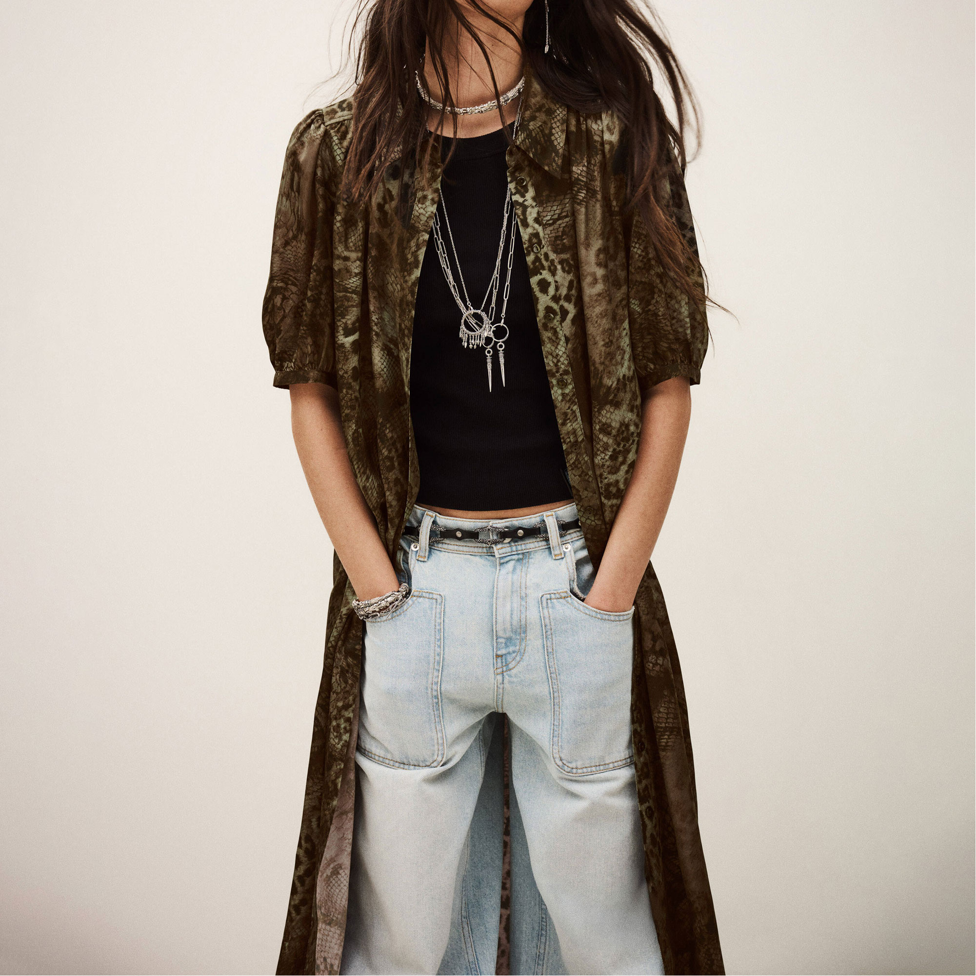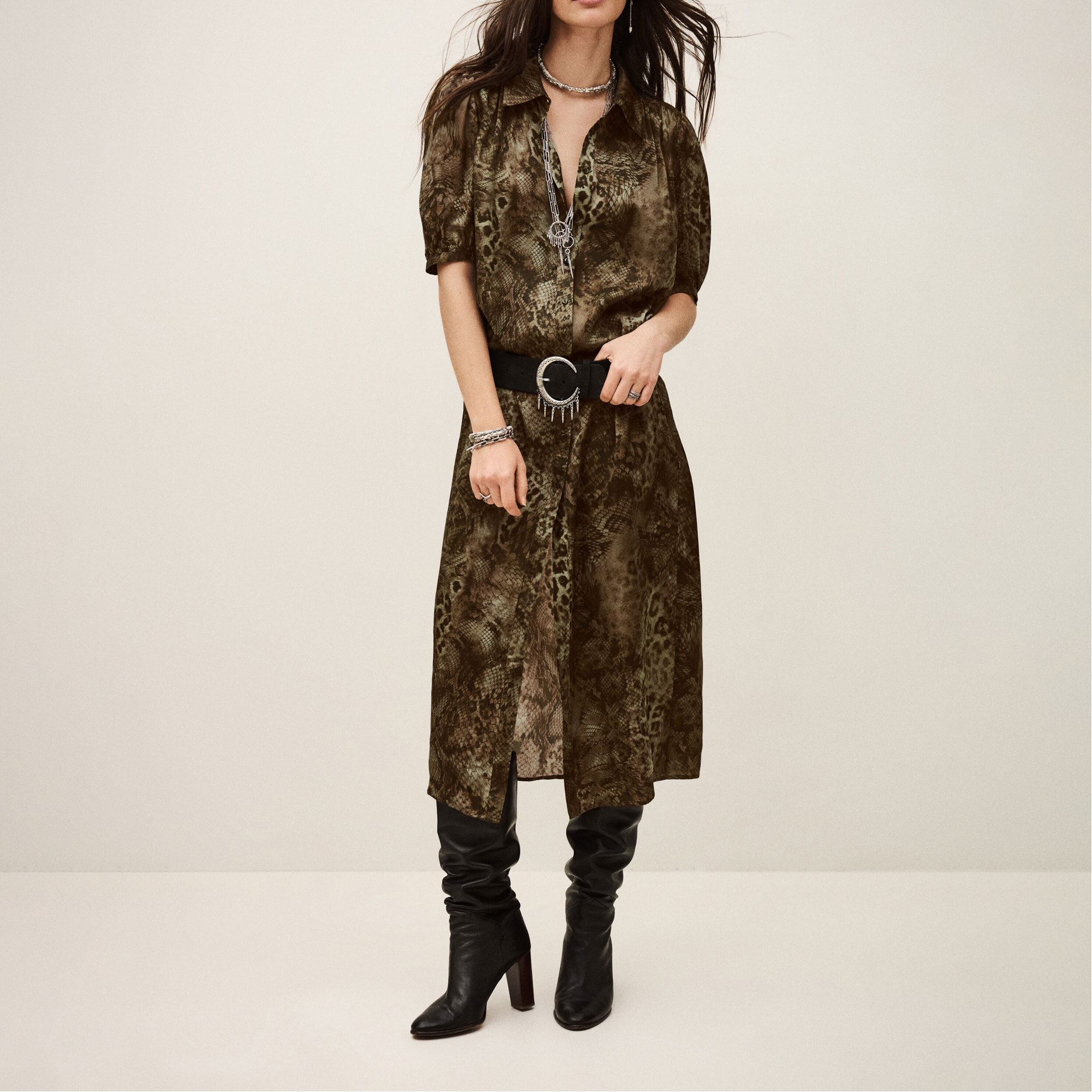 • Short balloon sleeves, straight silhouette, belted design, midi length, snake print