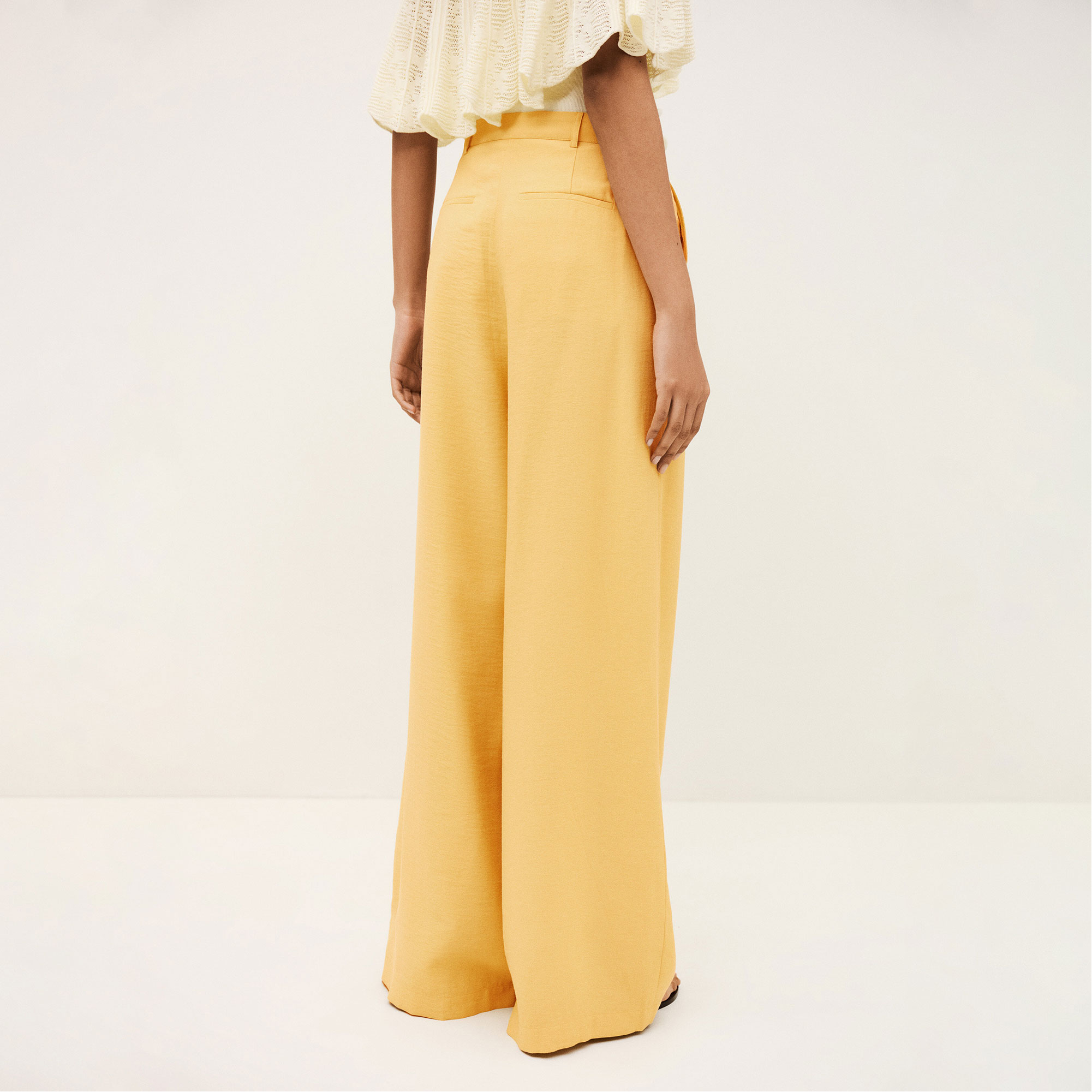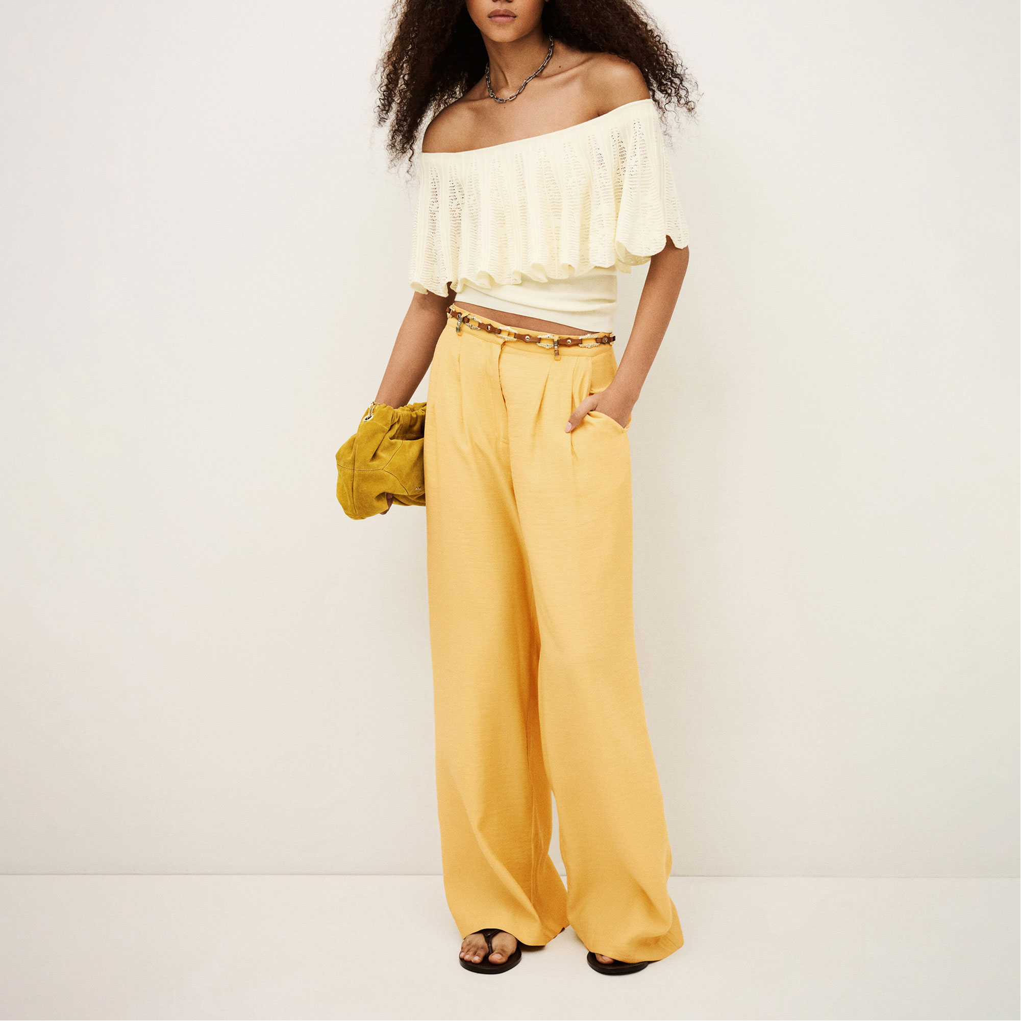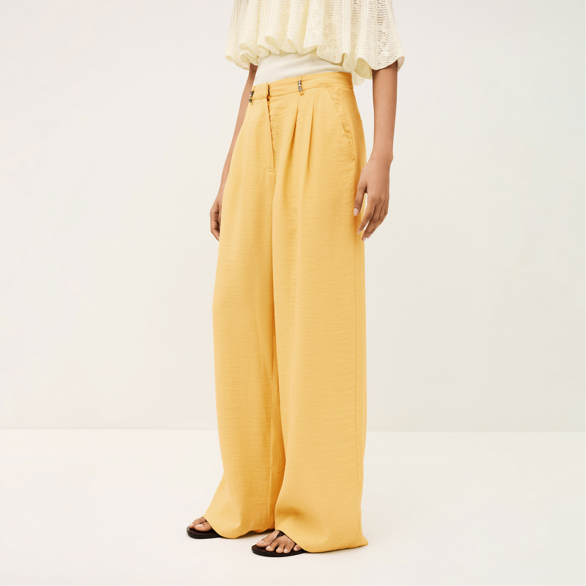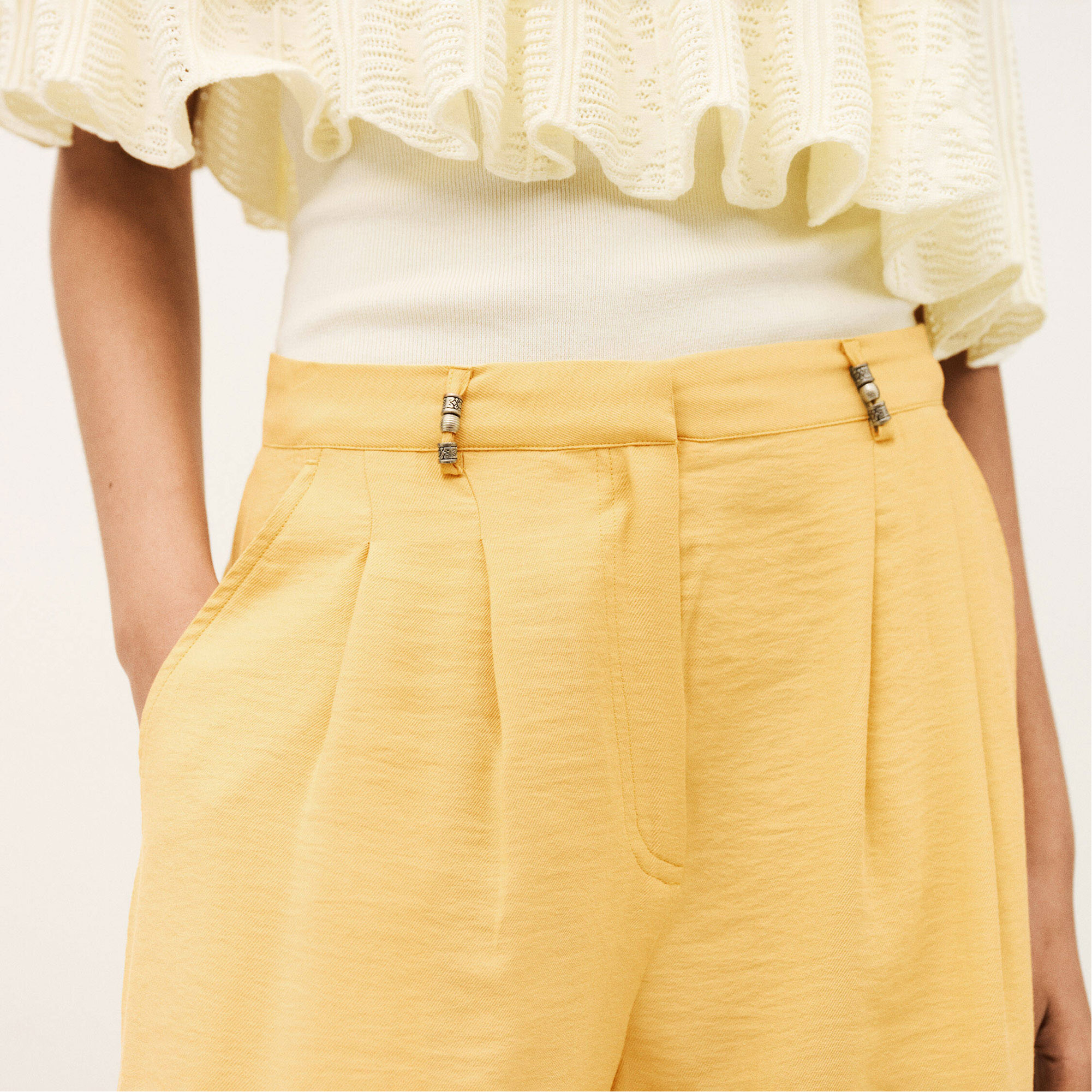 - Wide-leg silhouette, tailored cut, front pleats, loops with hammered beads, piped back pockets, jewel detail