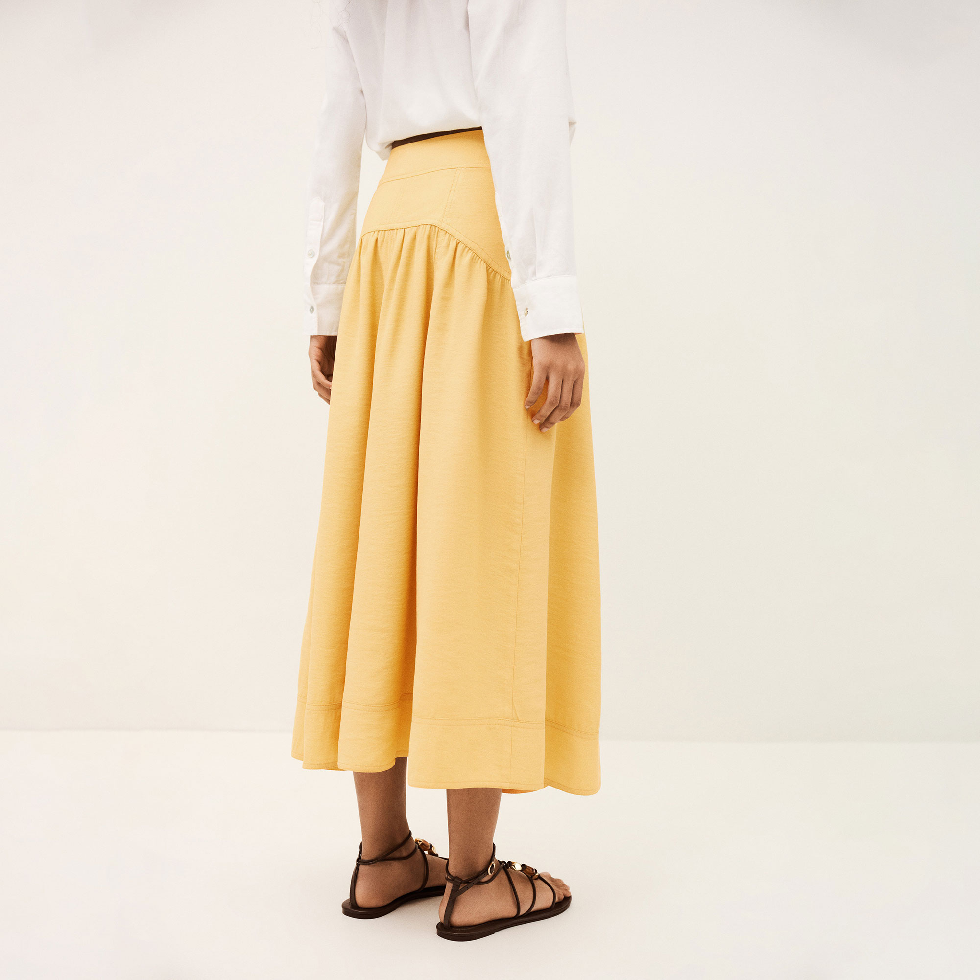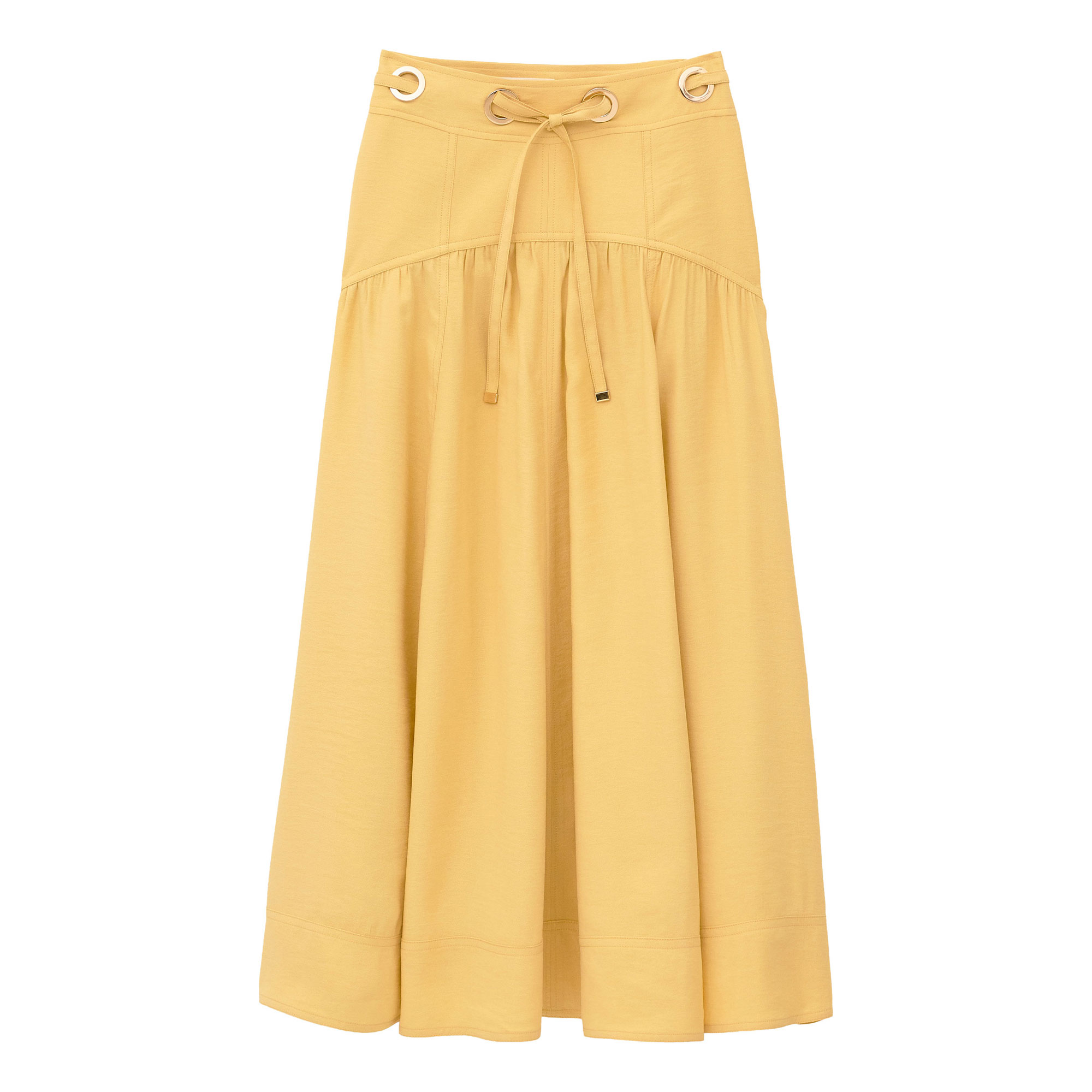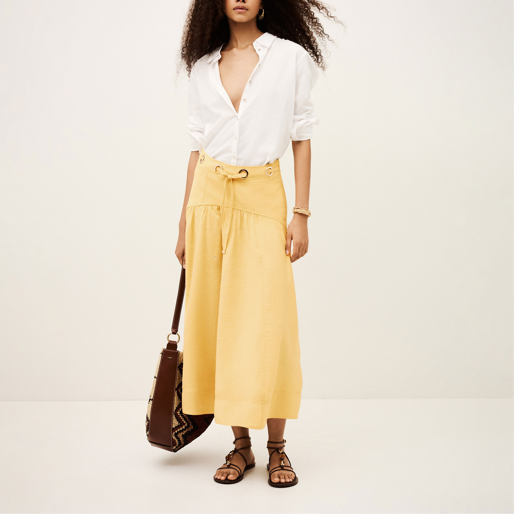 • Structural yoke, eyelets, tie waistband, concealed side zip fastening, fringing tassels
