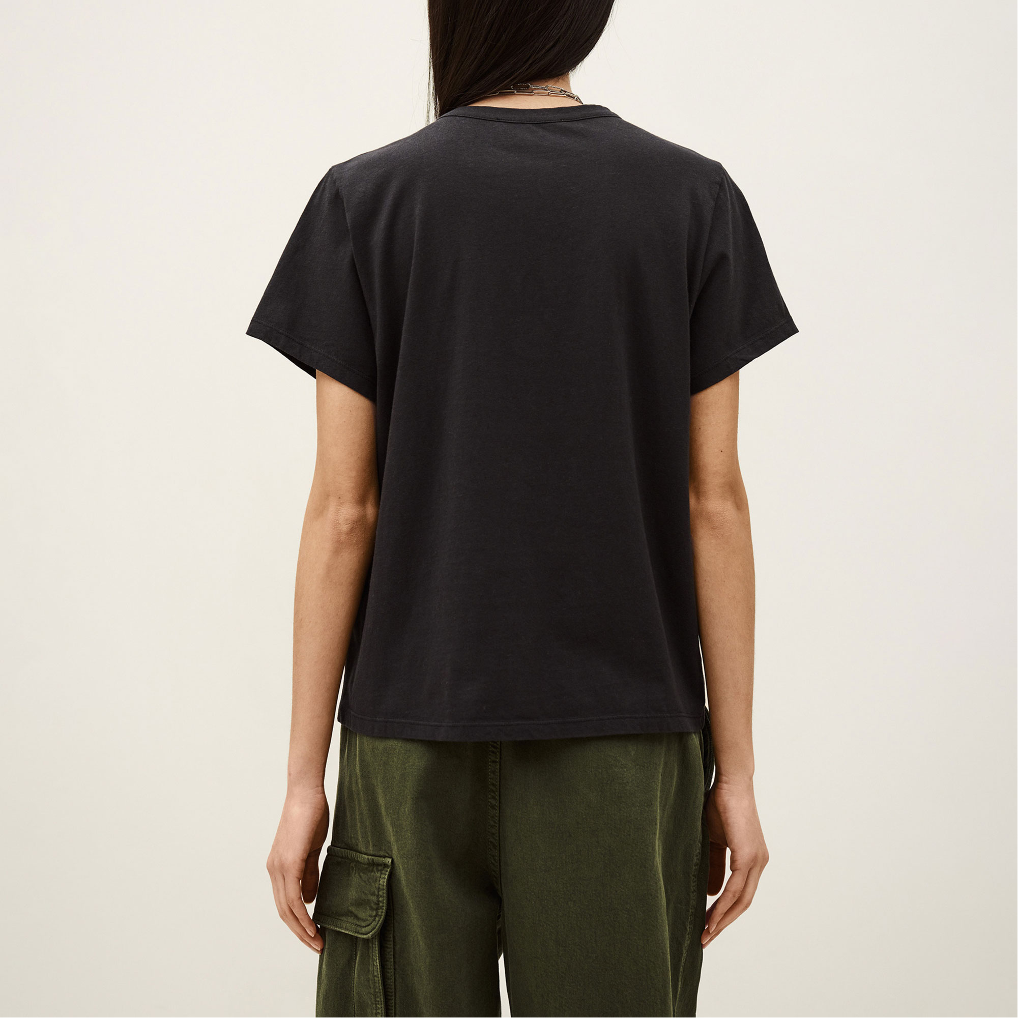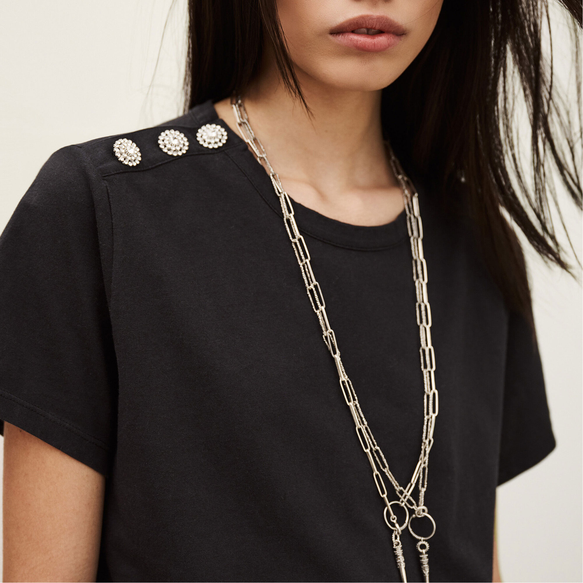 • Short-sleeved t-shirt, round neck, straight cut, jewellery button