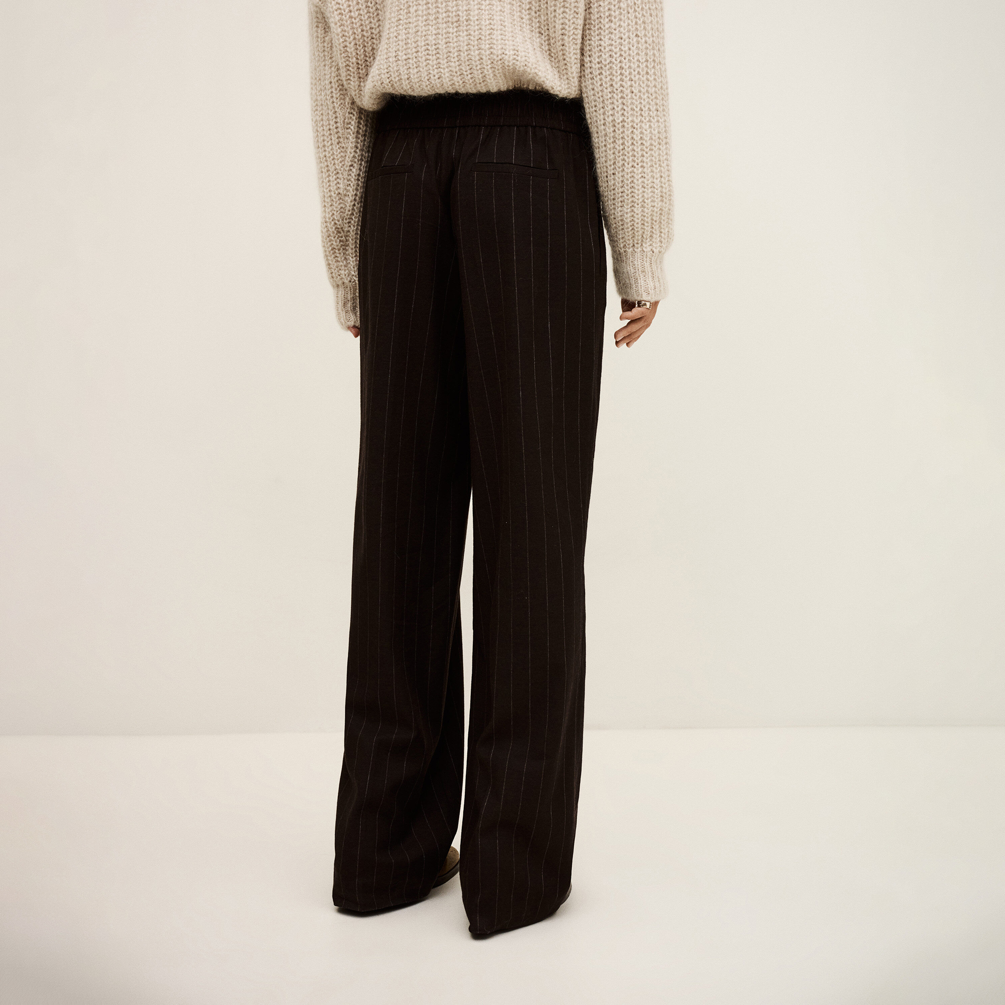 - Pleats at the front and back, elasticated waist, two slanted pockets, welt pockets on back