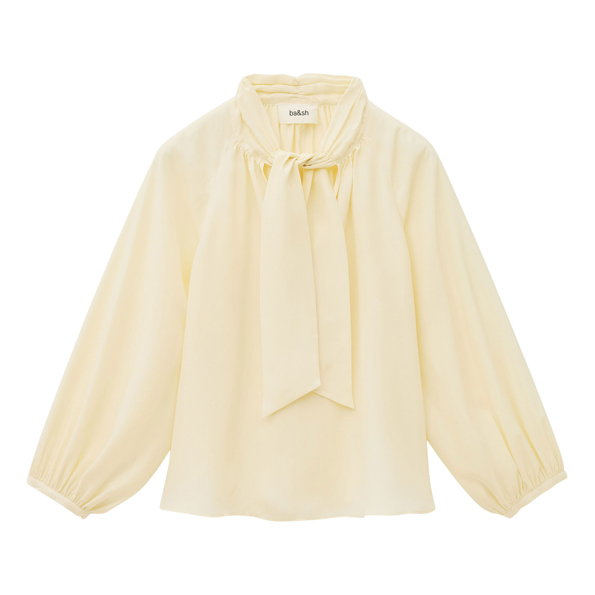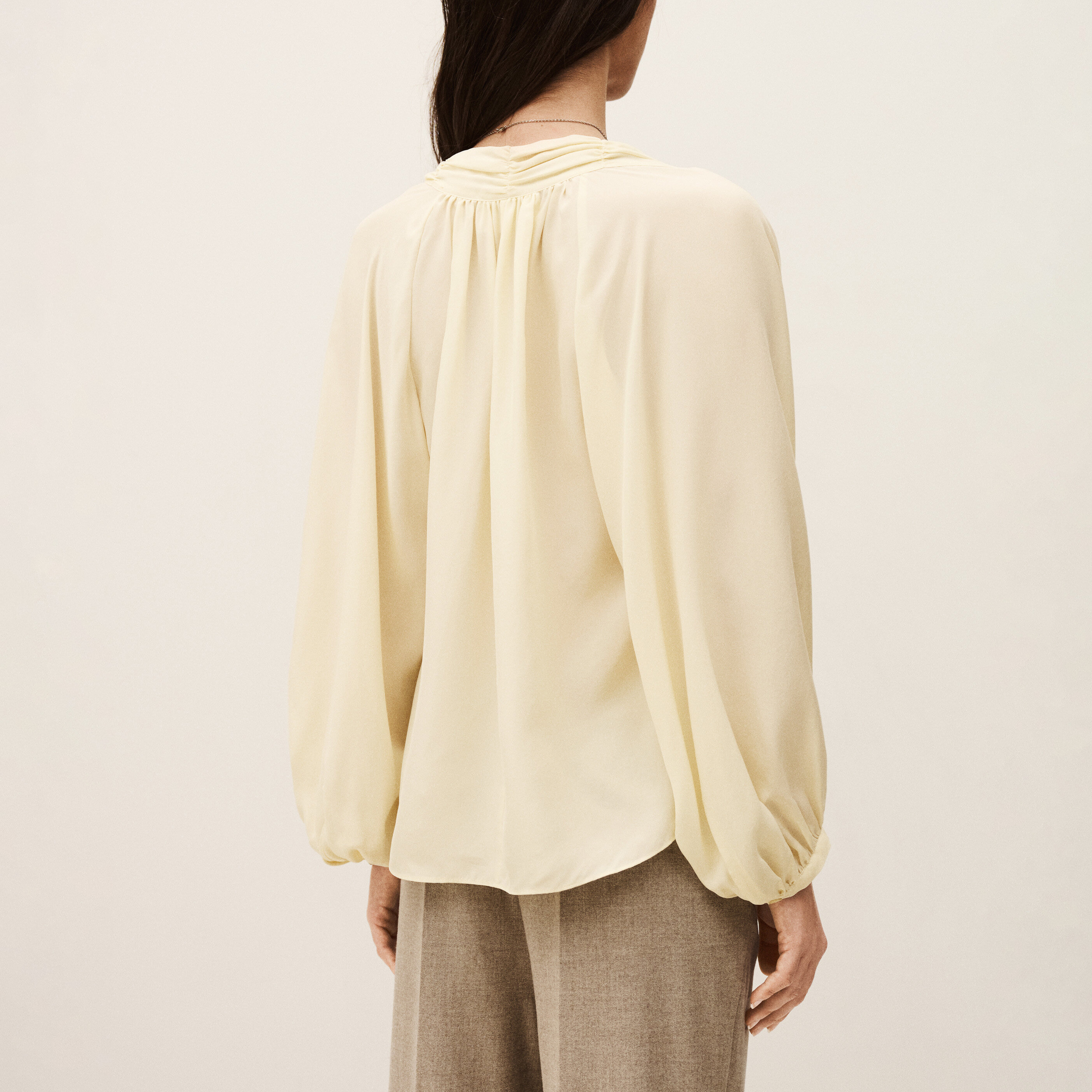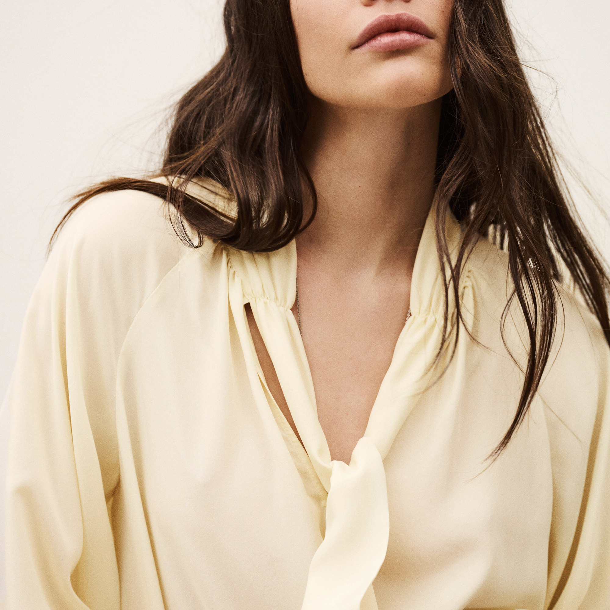 - Tie neck fastening, pleated bib detailing, long sleeves, buttoned cuffs, concealed button fastening, slightly voluminous cut