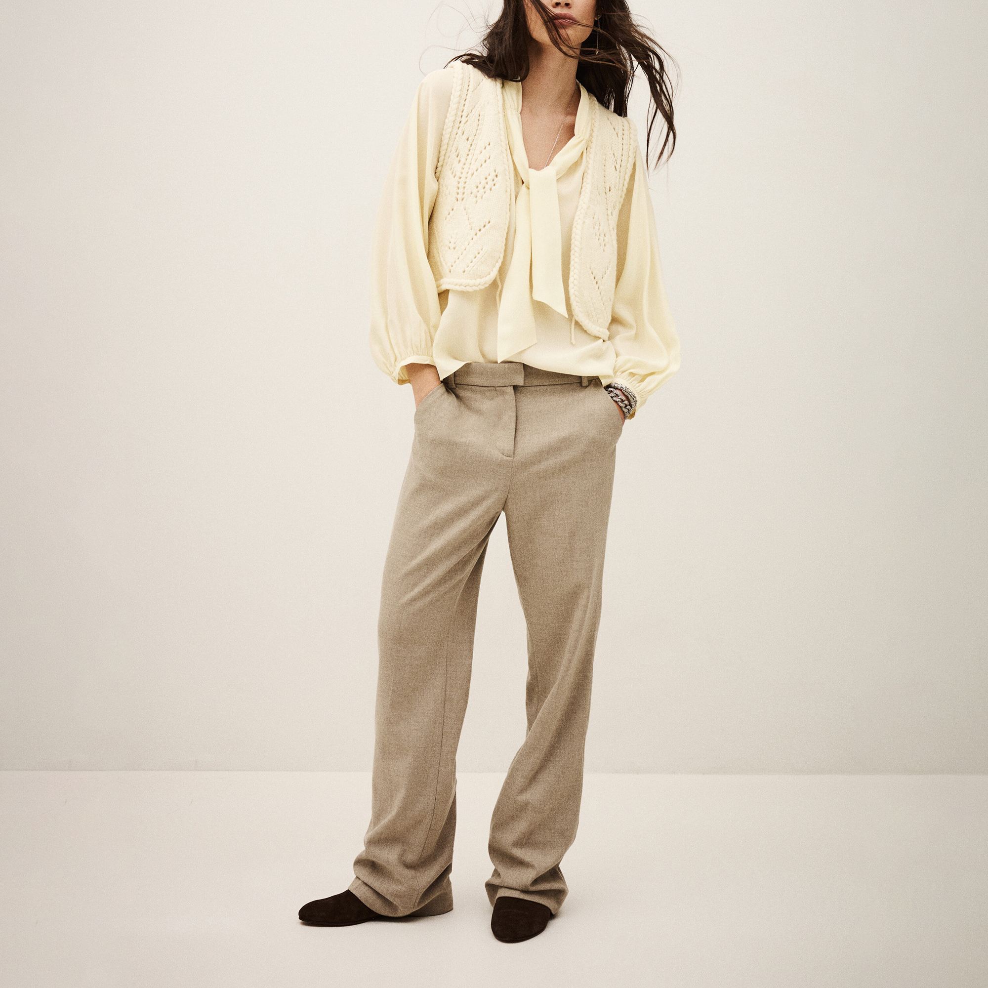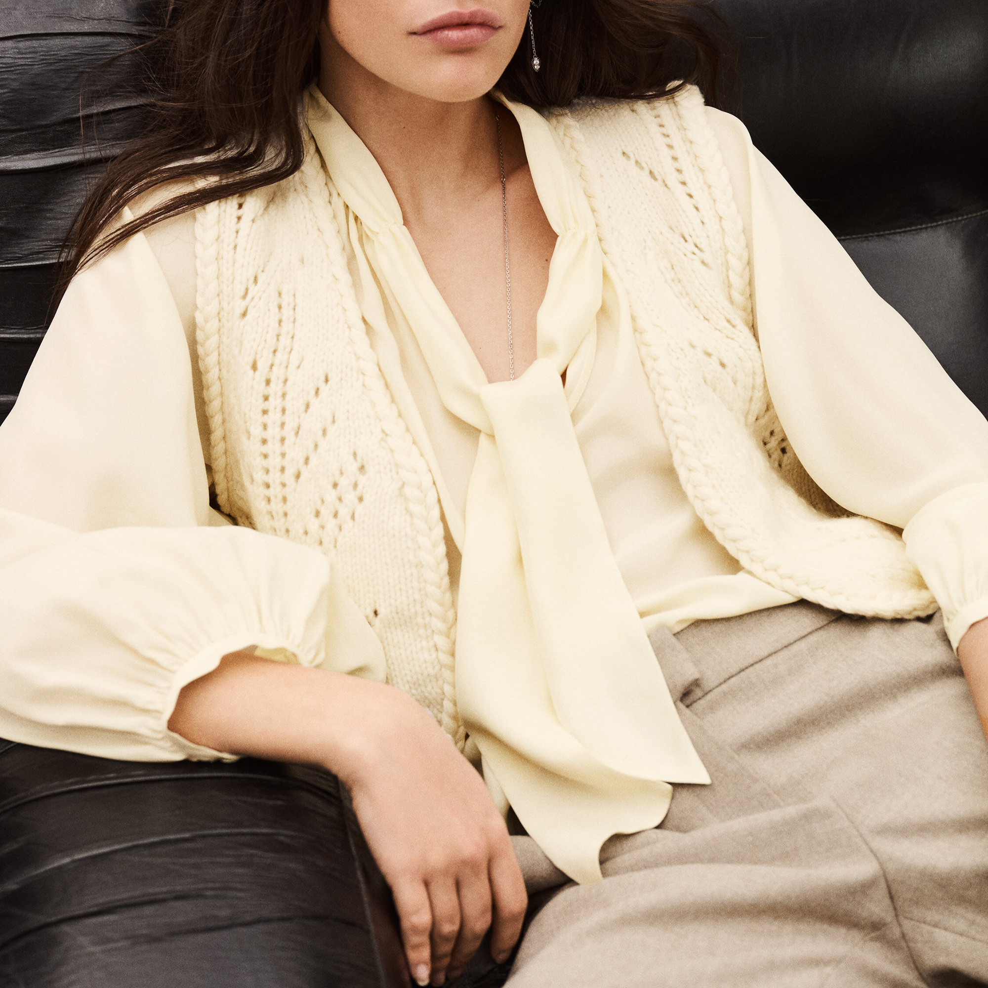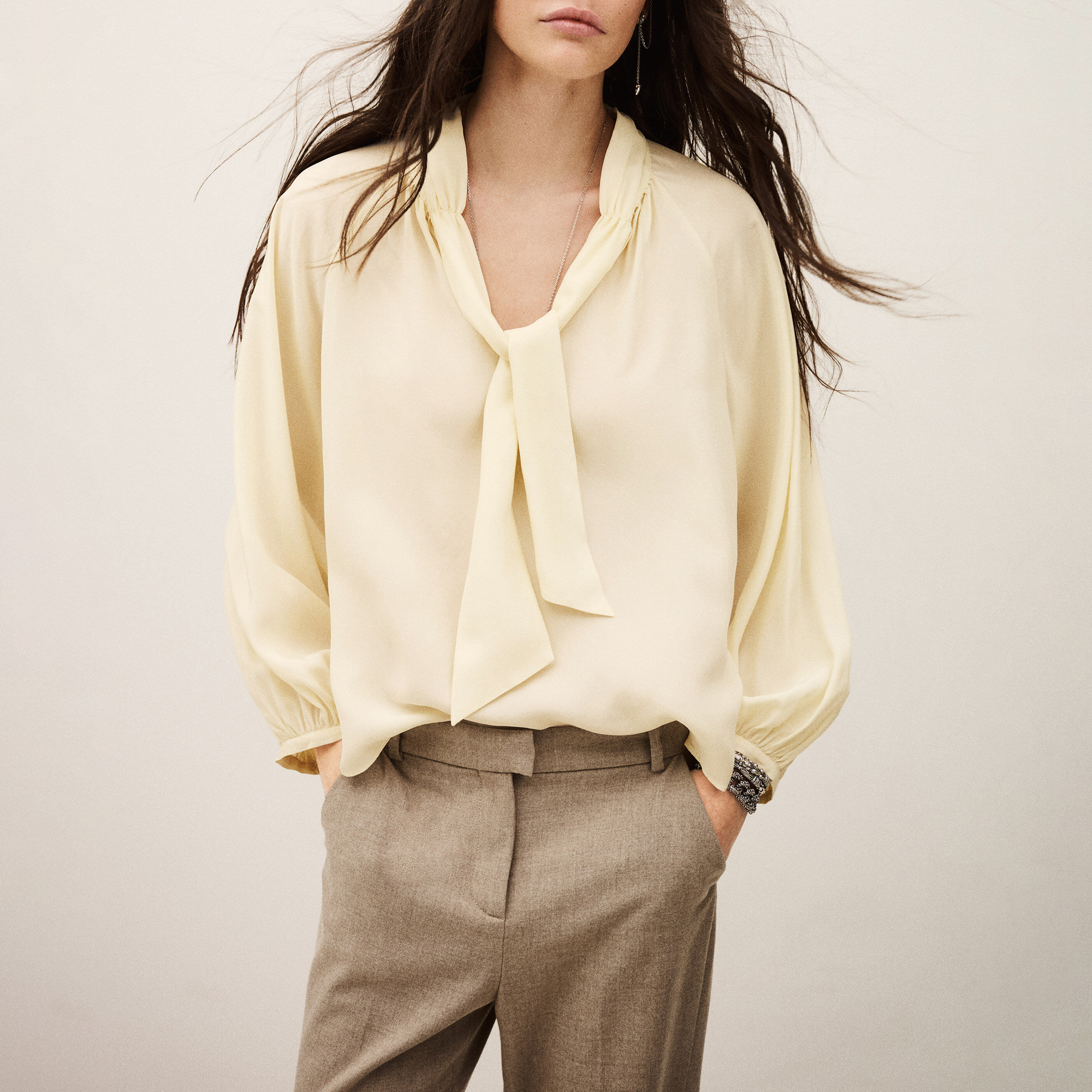 - Tie neck fastening, pleated bib detailing, long sleeves, buttoned cuffs, concealed button fastening, slightly voluminous cut