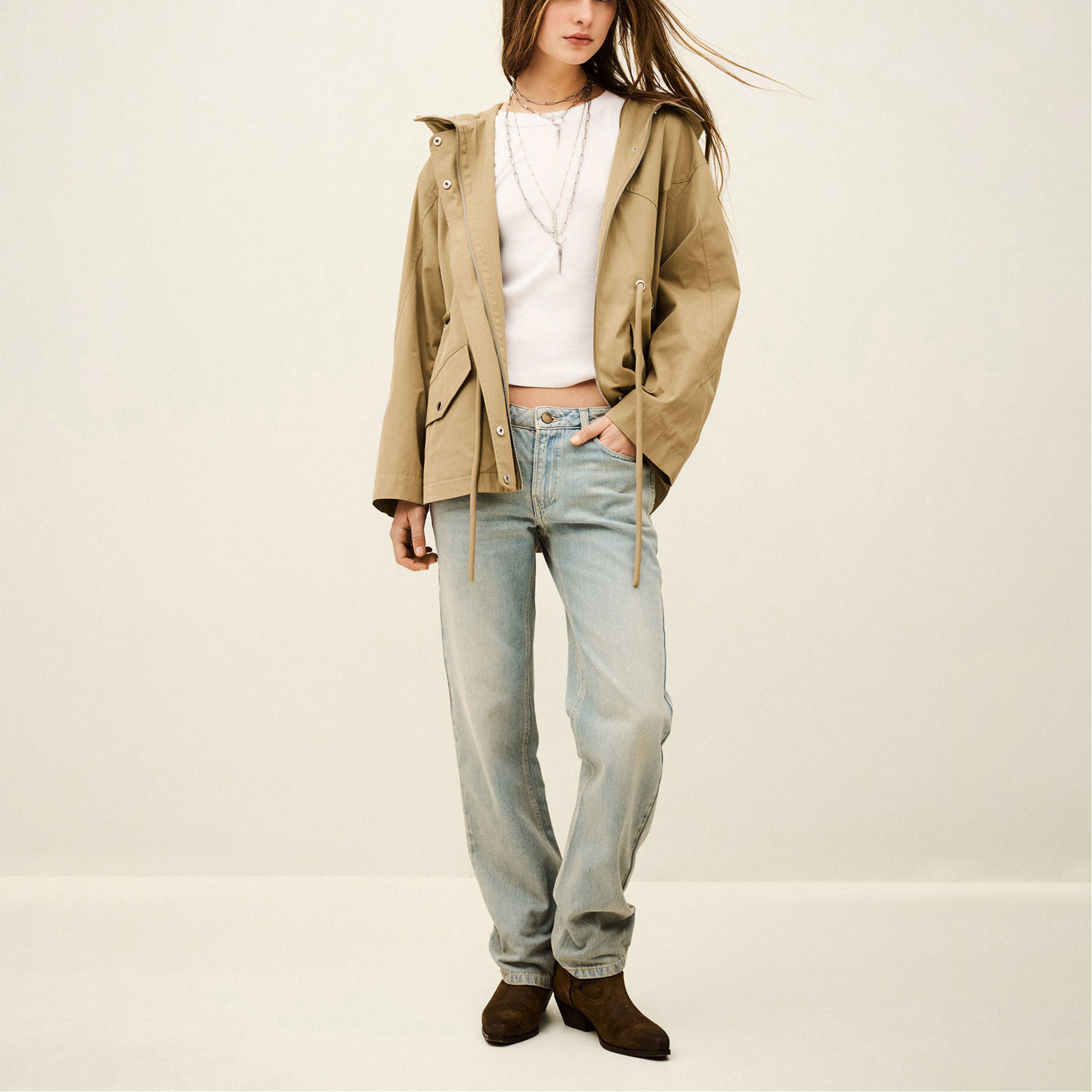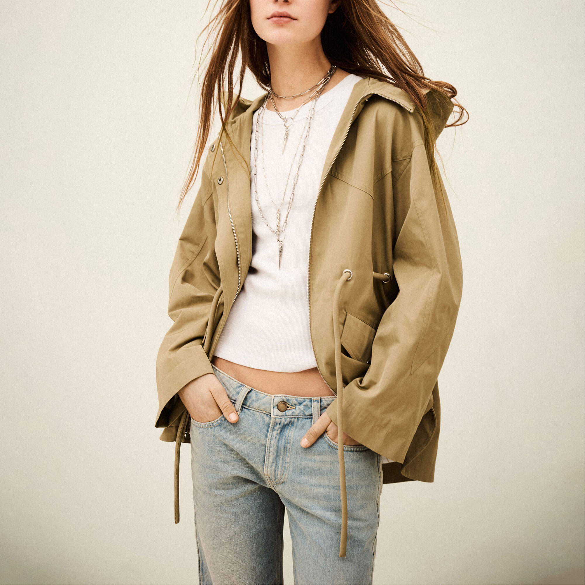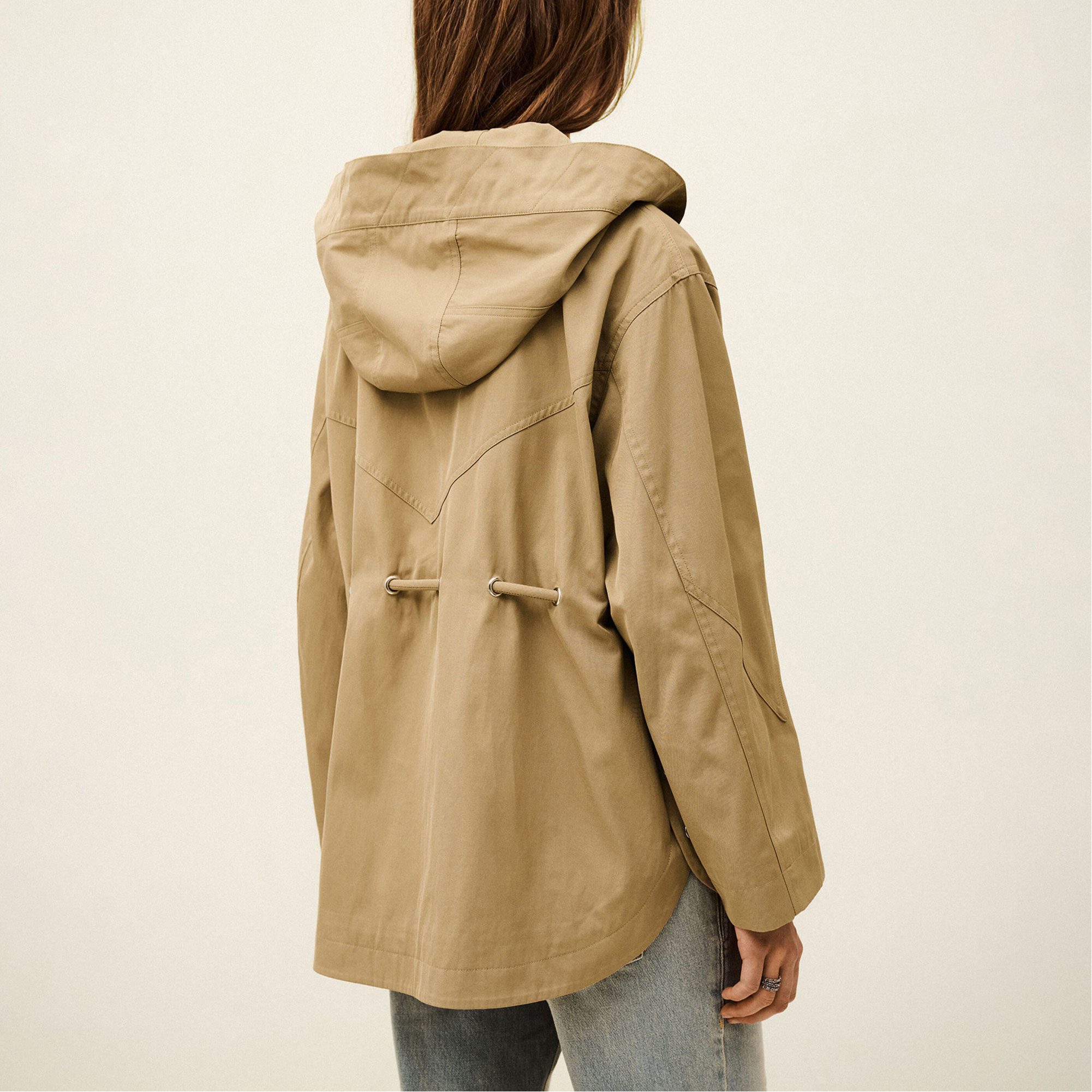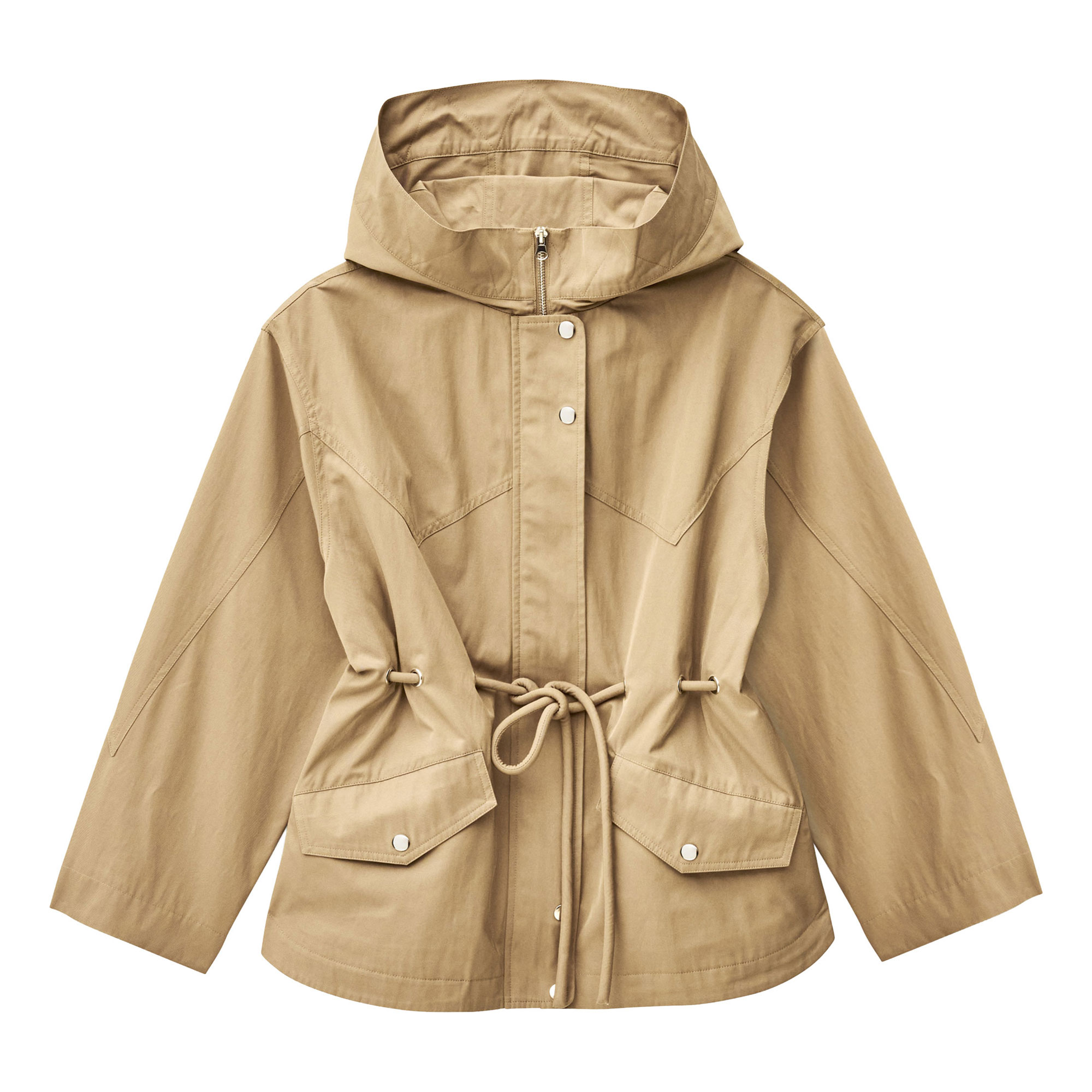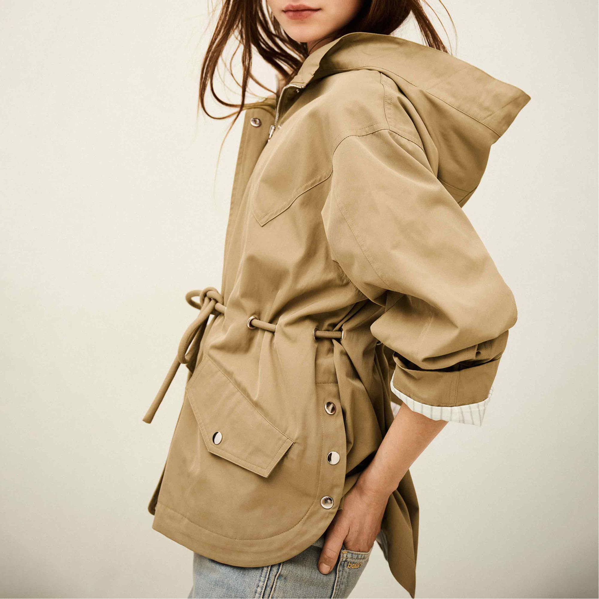 - Drawstring waist with eyelets, front zip and snap button fastening, flap pockets, mid-length design, belted parka style