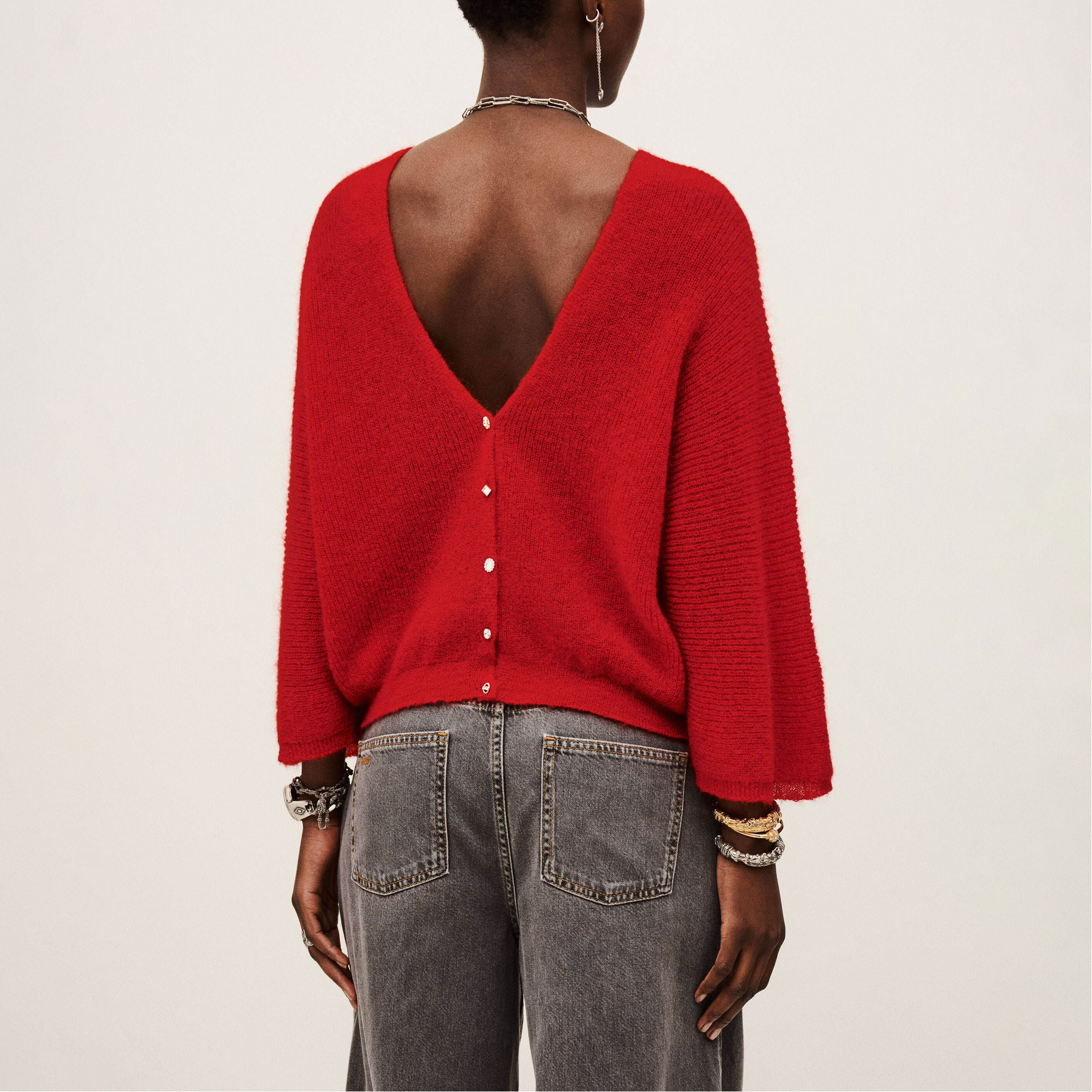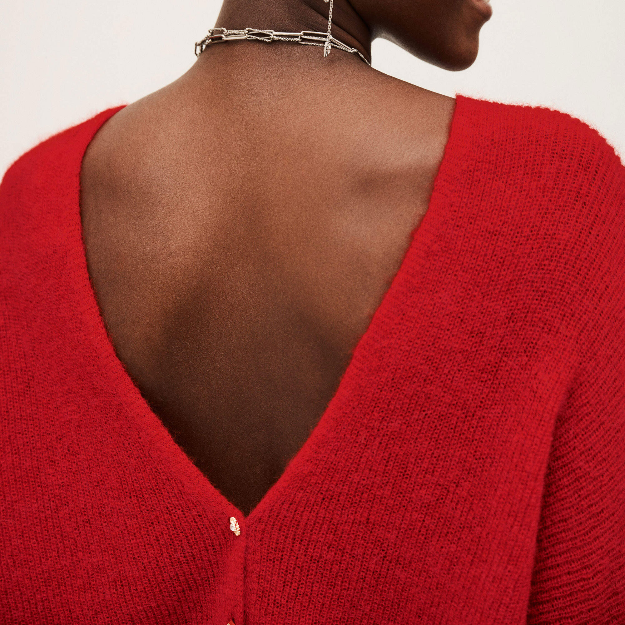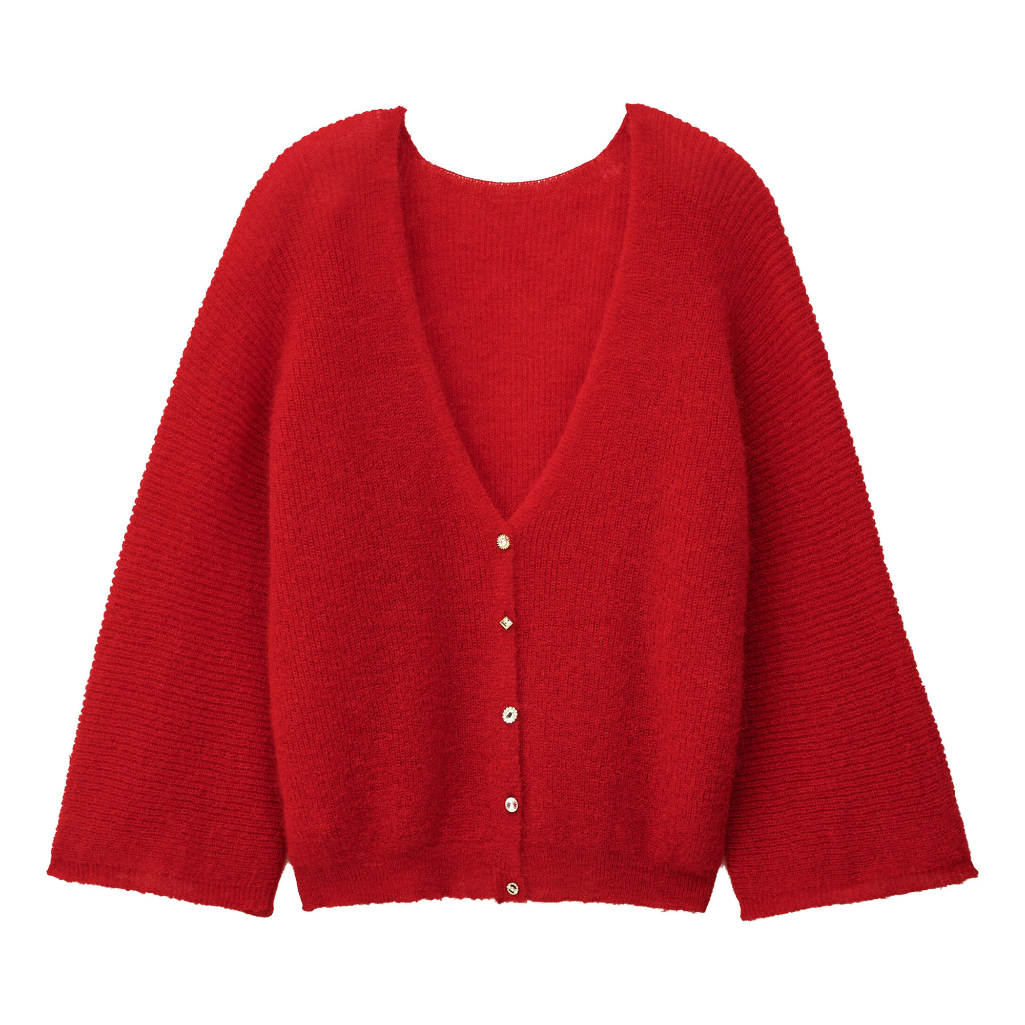 • V-neck back, fine beaded knit, seamless design, loose-fit mid-length sleeves, mismatched buttons