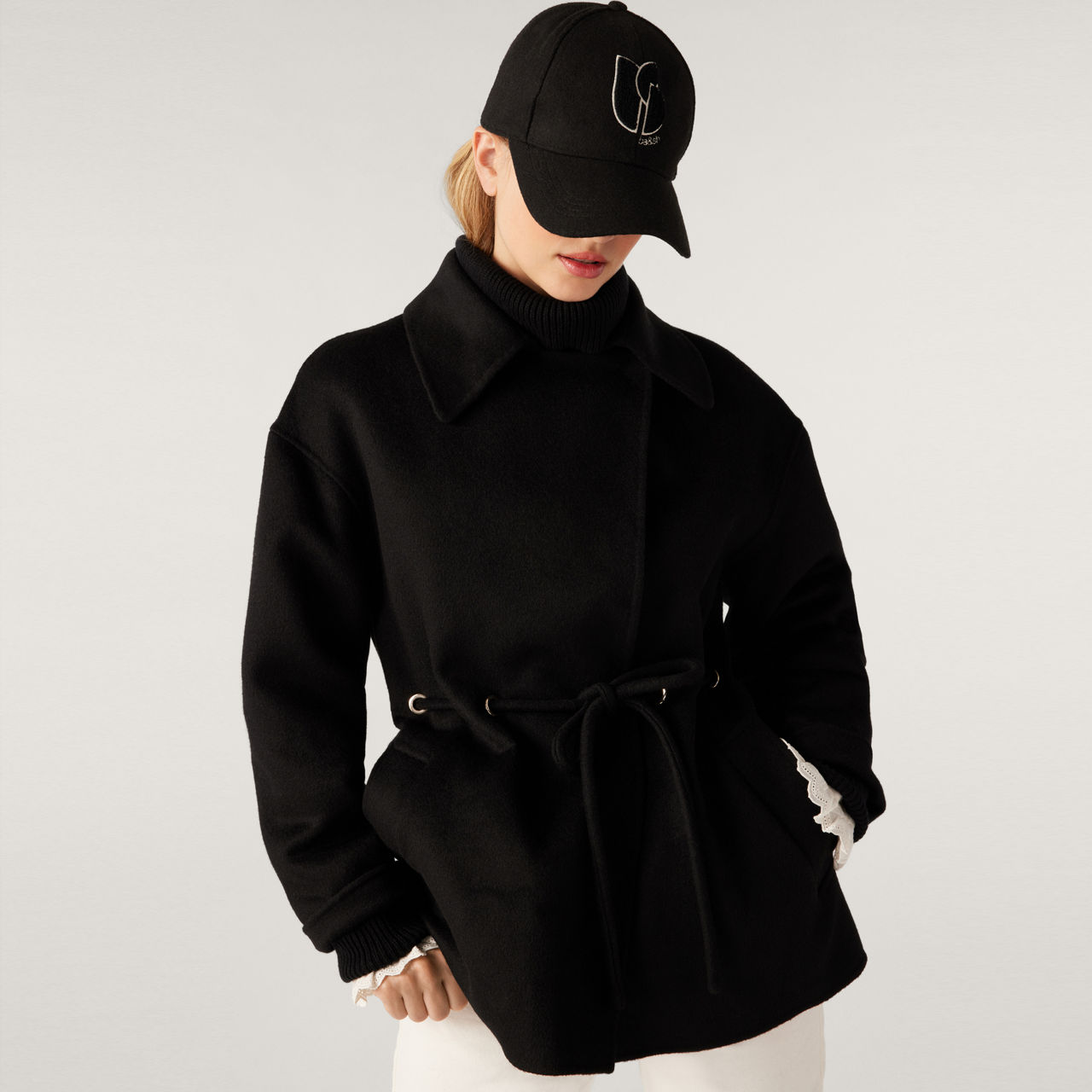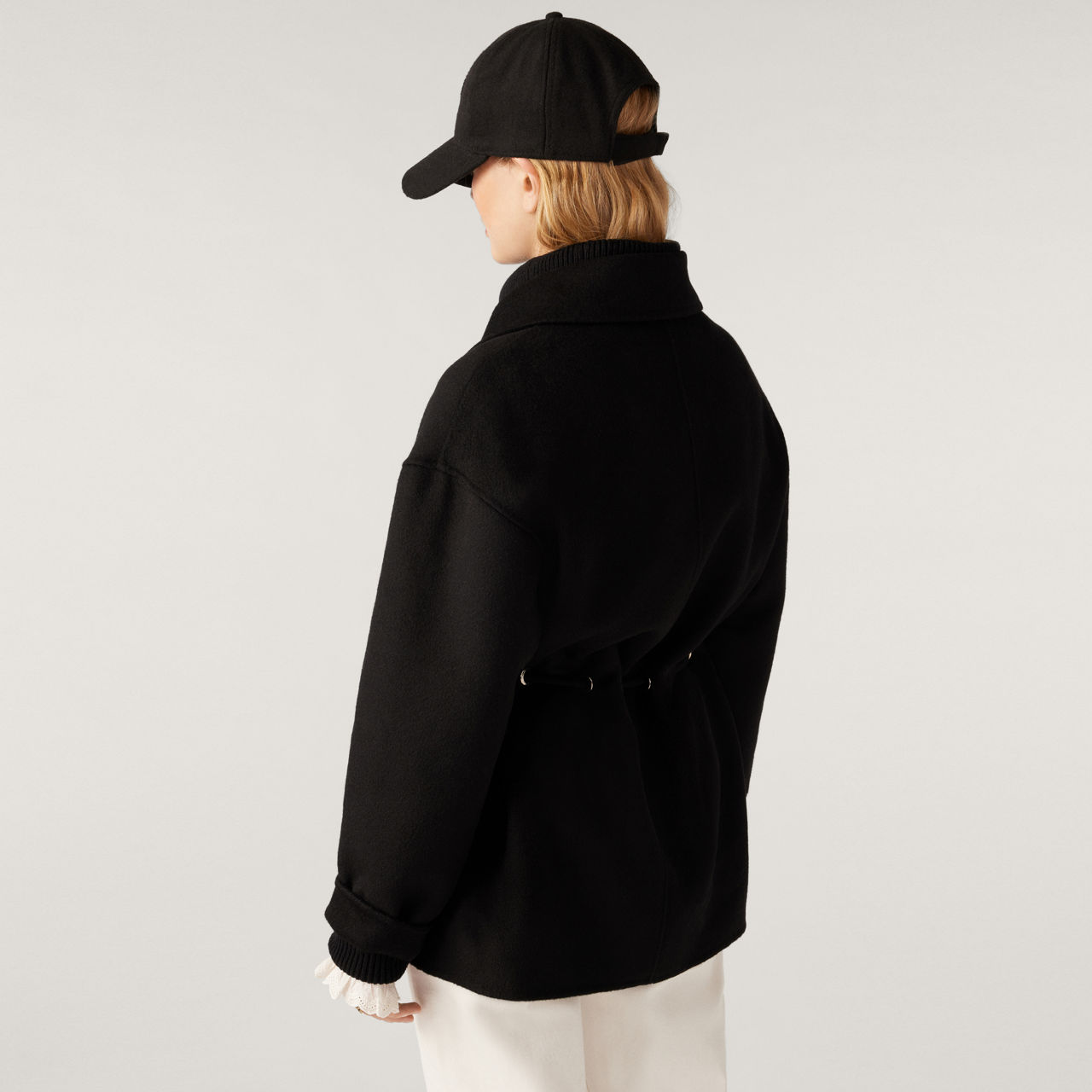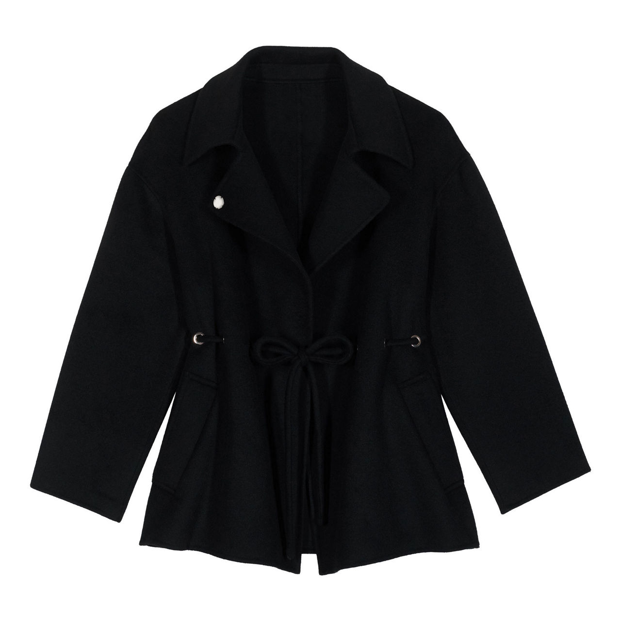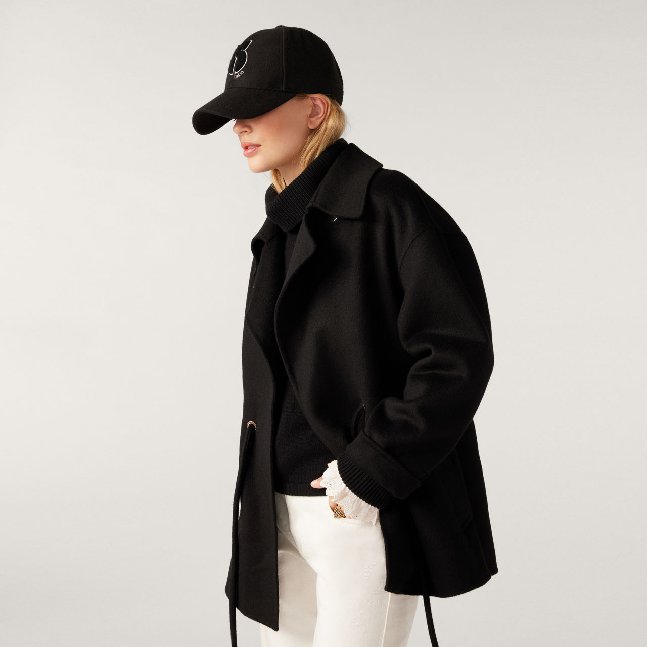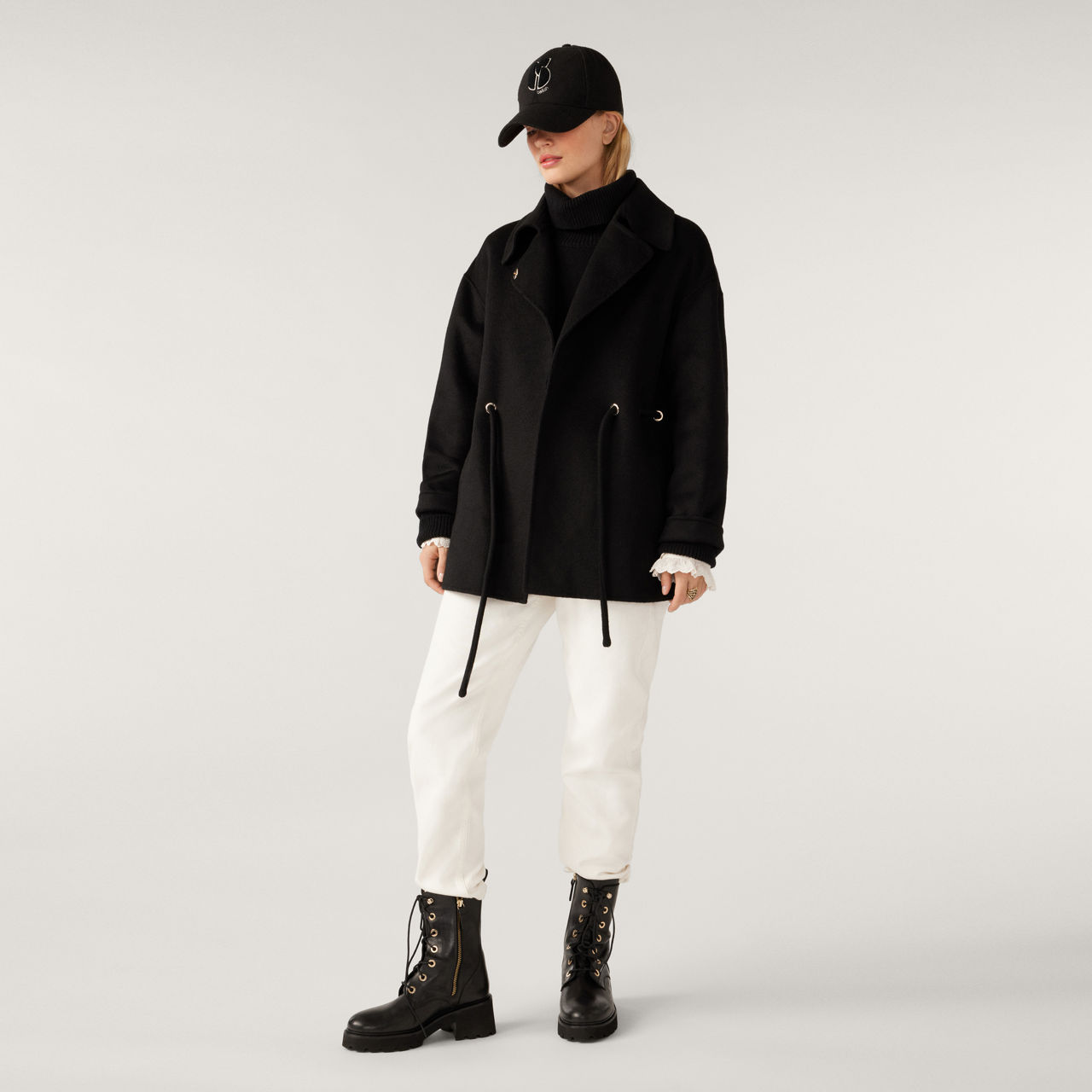 - Dropped shoulders, draw-string waist, notched lapel, side pockets