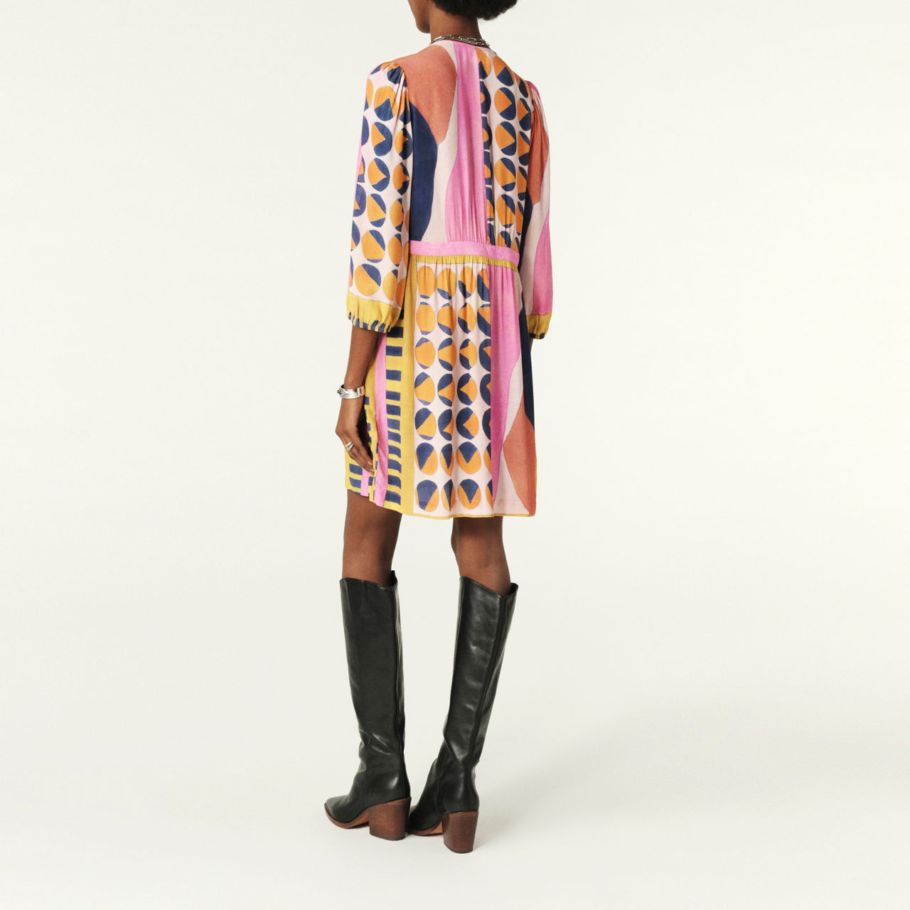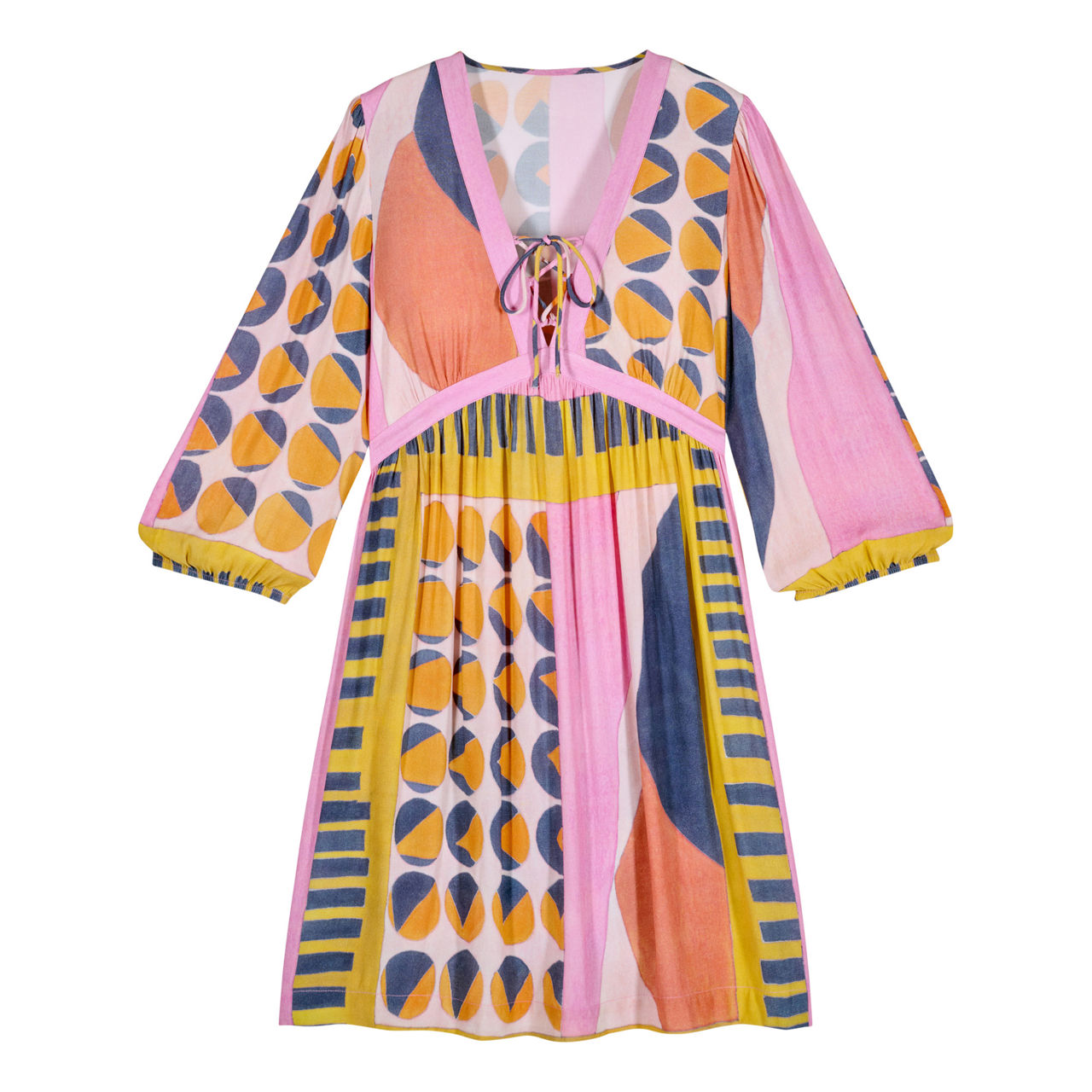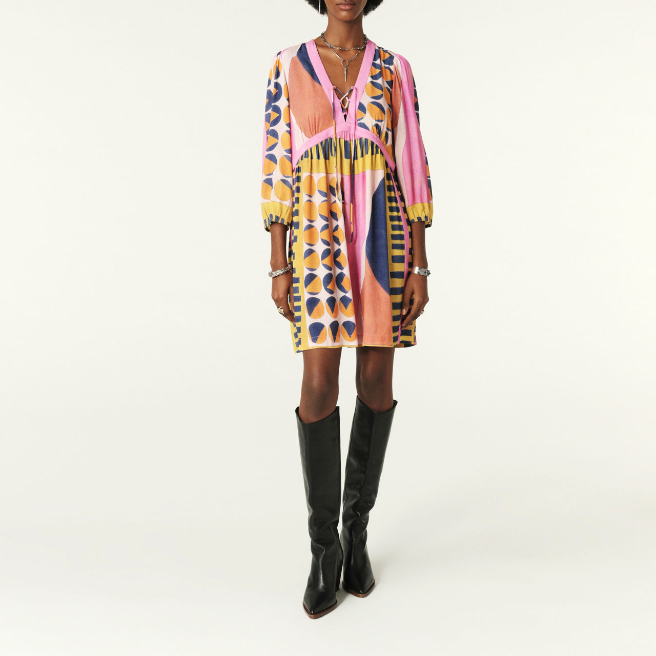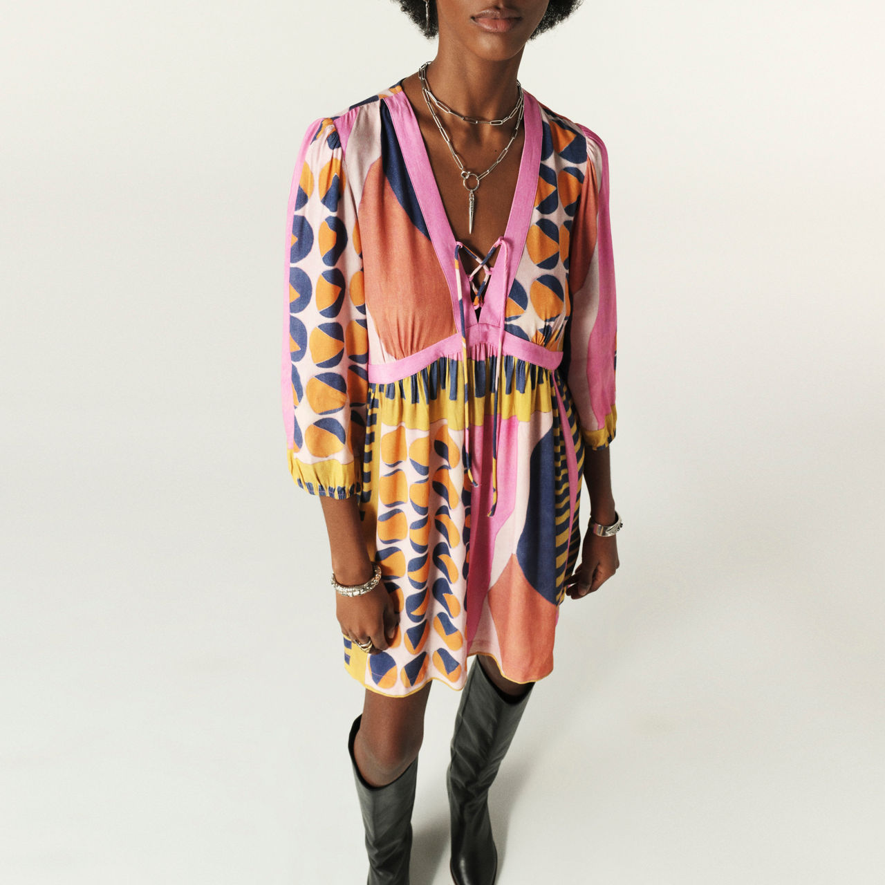 - Printed design, mini length, three-quarter length sleeves, gathered cuffs, panelled detailing, V-neckline with lace-up tie, flared silhouette