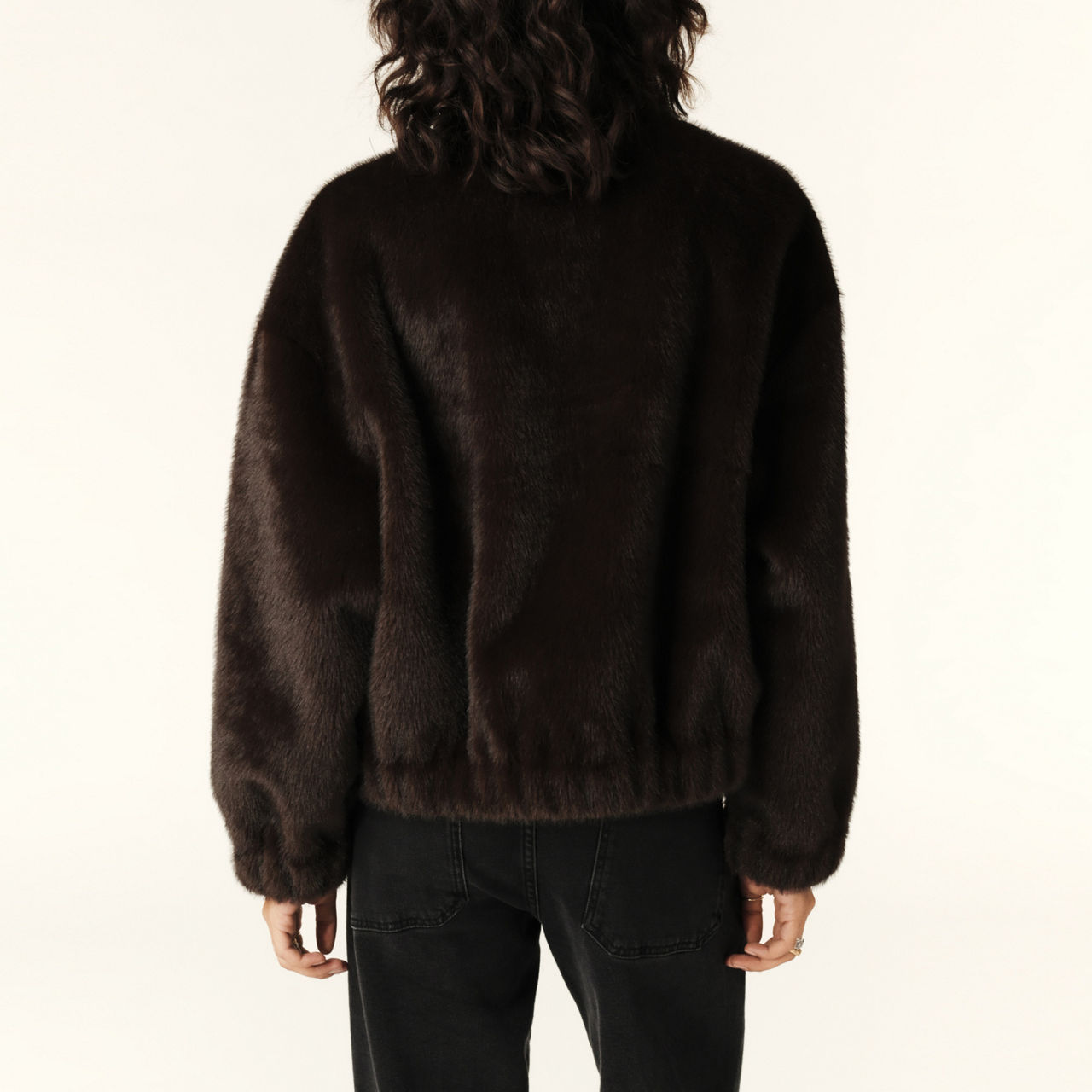 - Long sleeves, elasticated waistband, elasticated cuffs, high neckline, faux fur style, stand collar, long sleeves, snap-button fastenings, concealed button placket, two front flap pockets