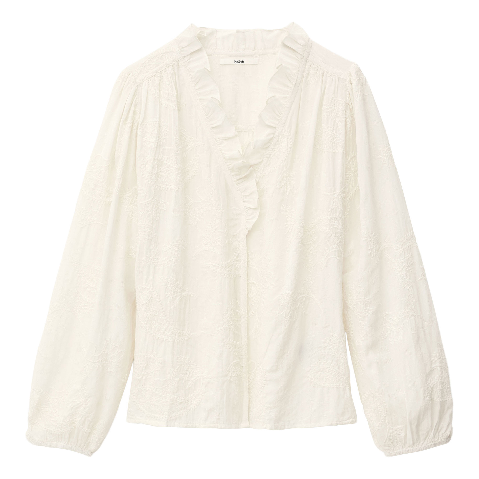 - Jacquard weave blouse, ruffle detail, V-neckline, buttoned slit cuffs, concealed snap fastenings