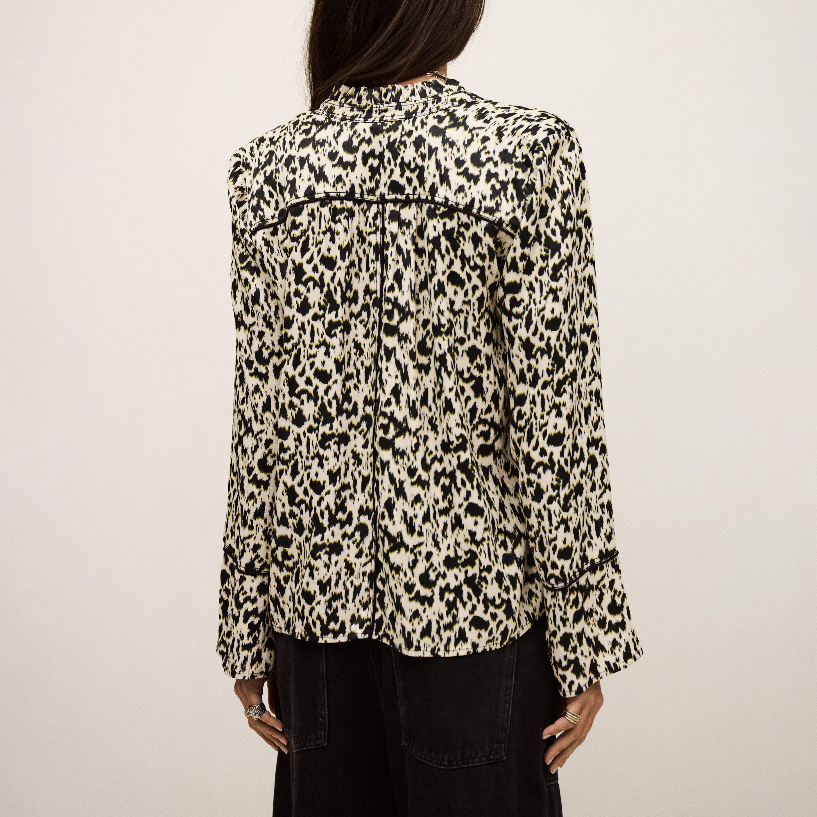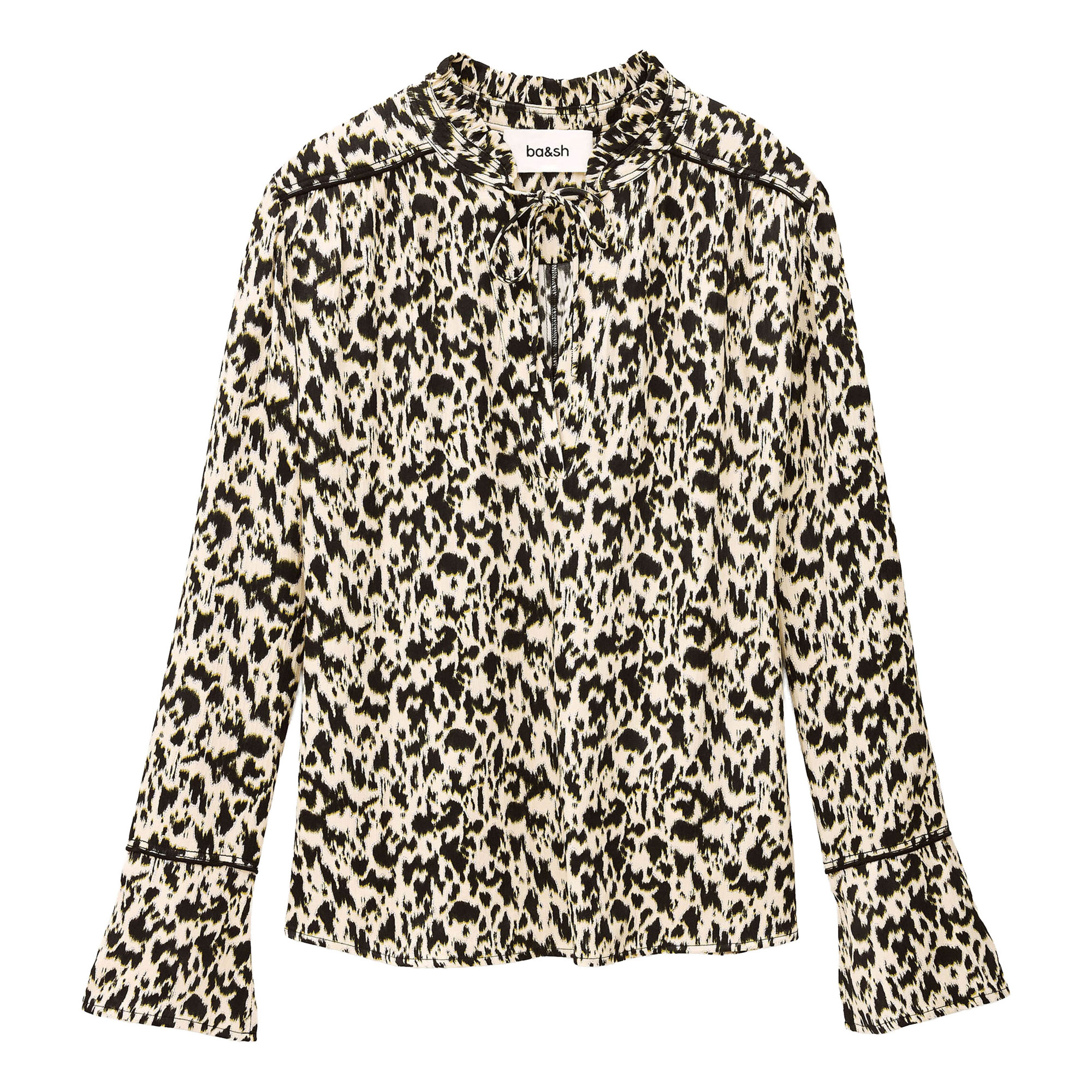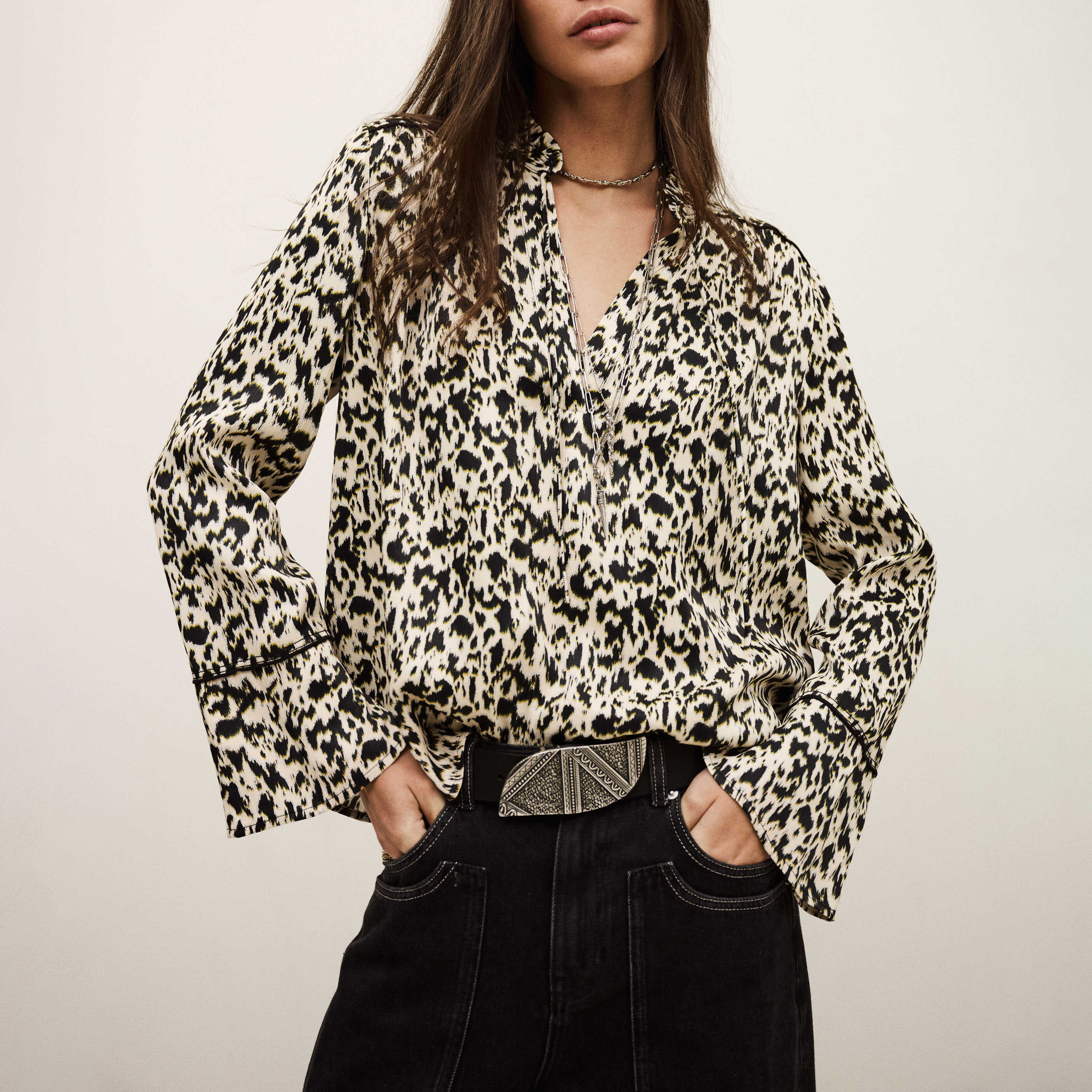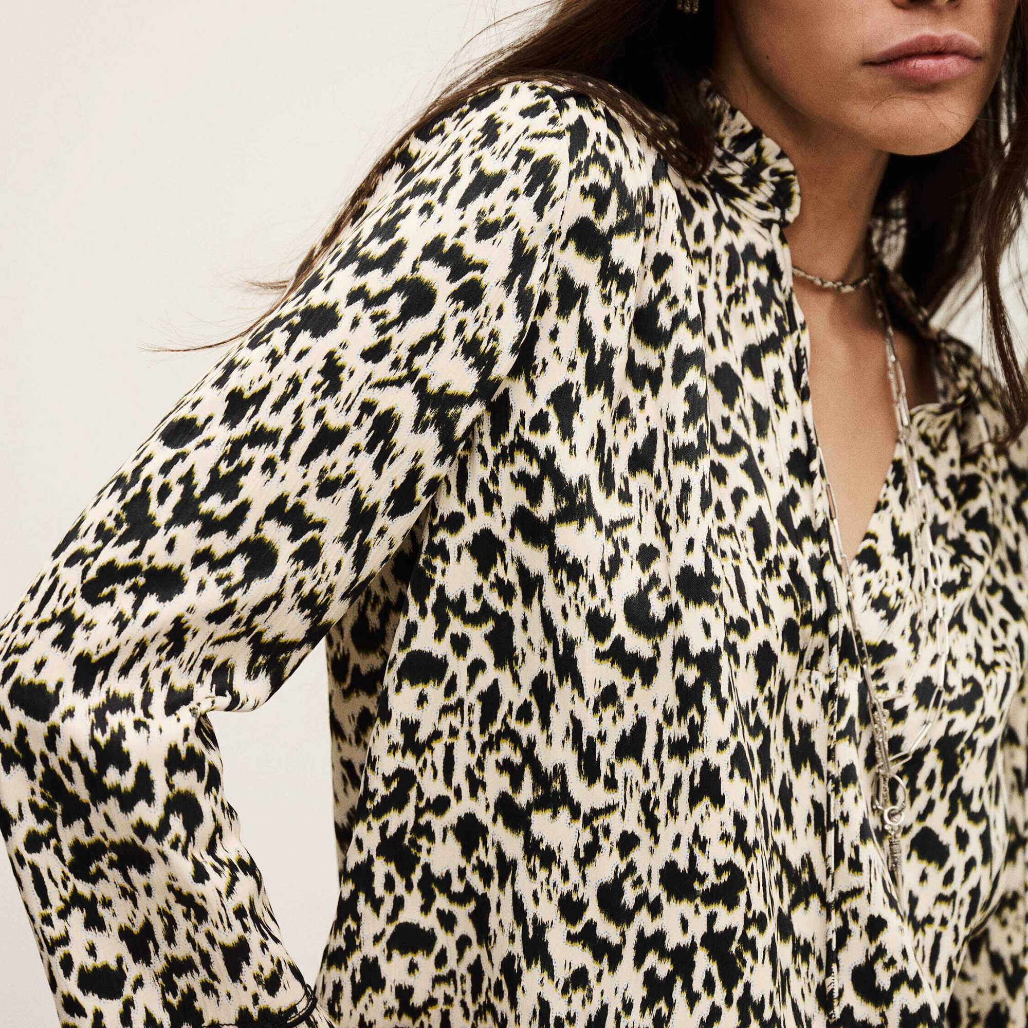 - Tie neck fastening, shoulder detailing, long sleeves, flared hem, flowy silhouette, contrasting seams, printed finish