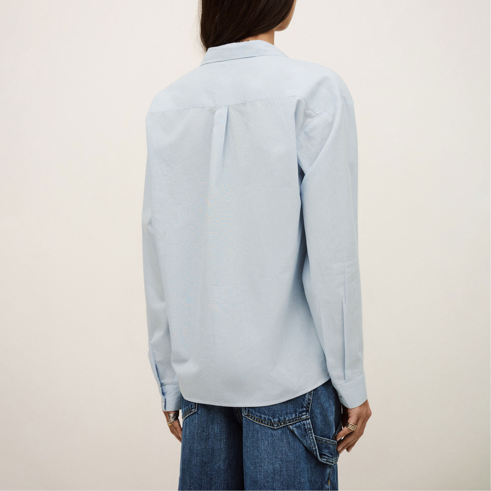 - Shirt collar, long sleeves, front button placket, mitred flap pockets, shoulder and back yoke, back pleat detail