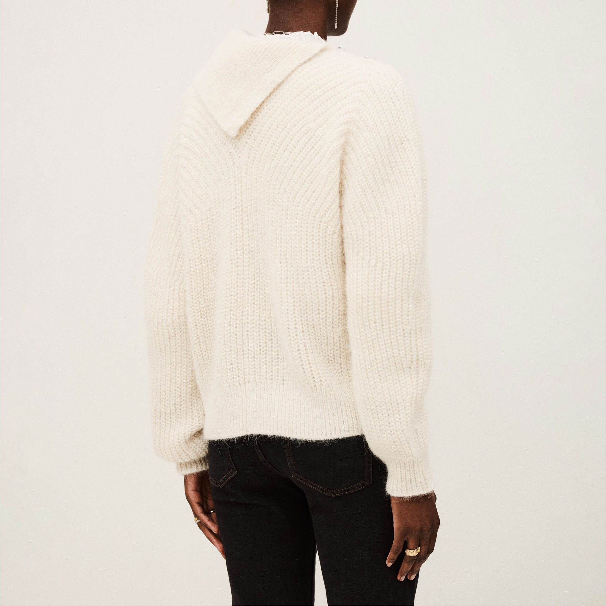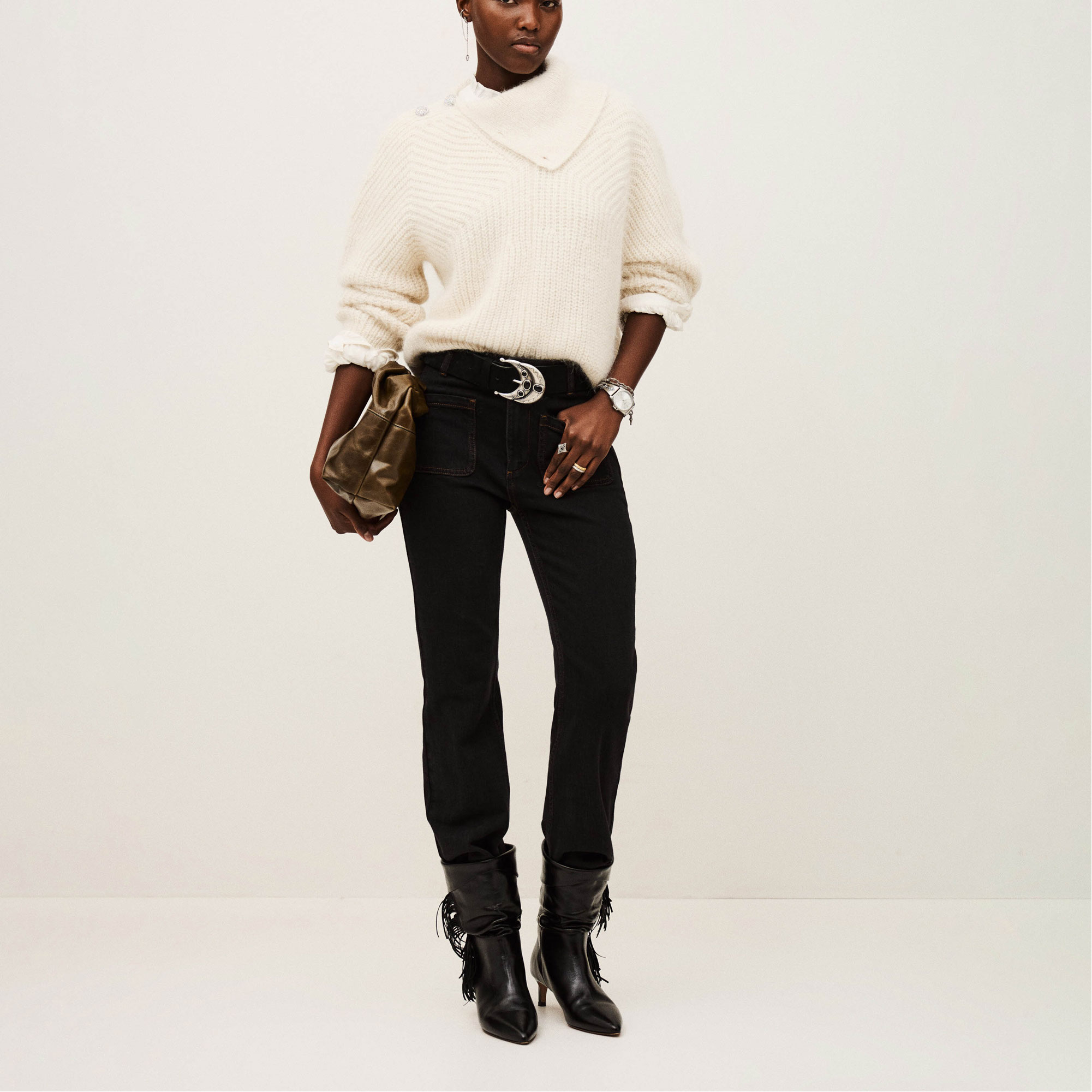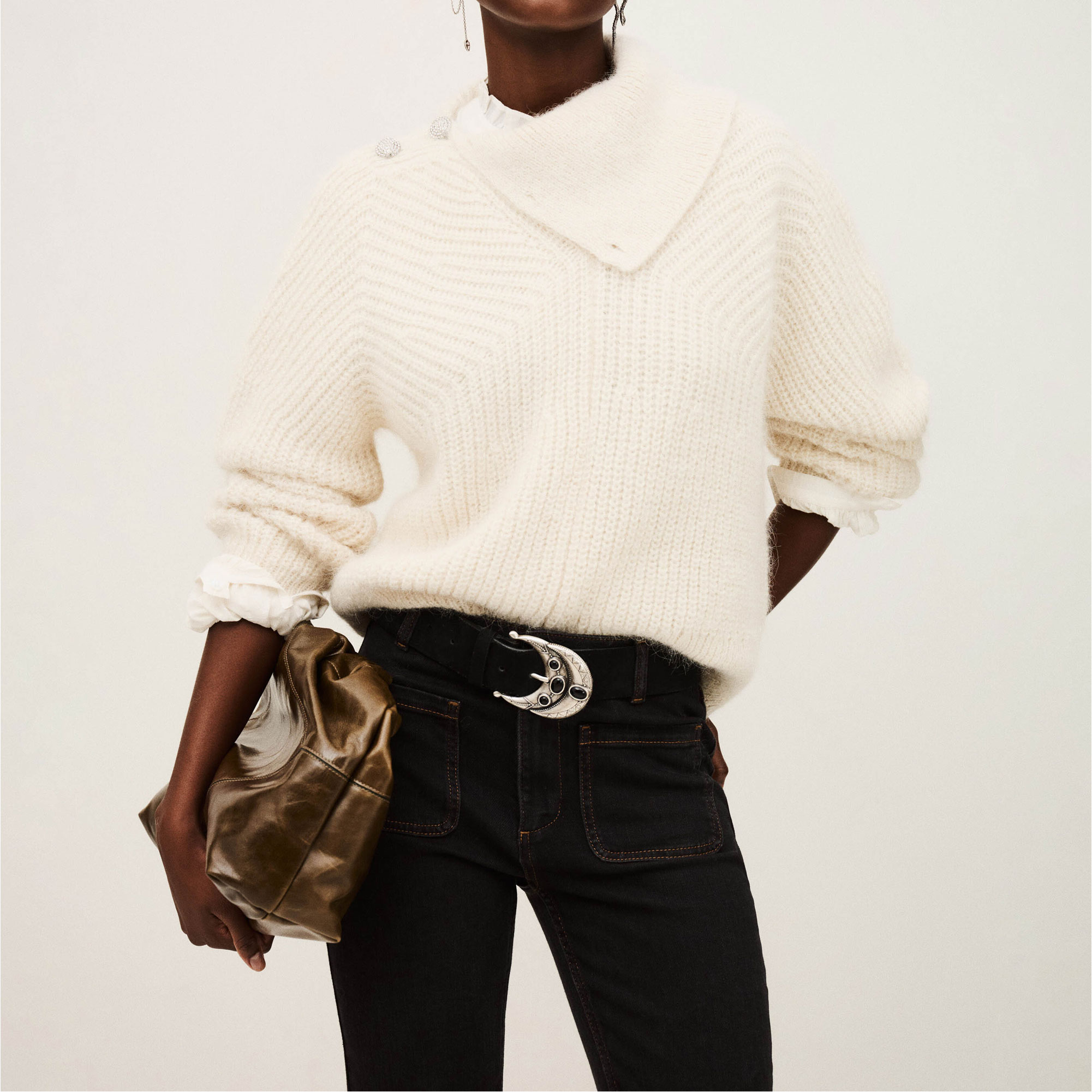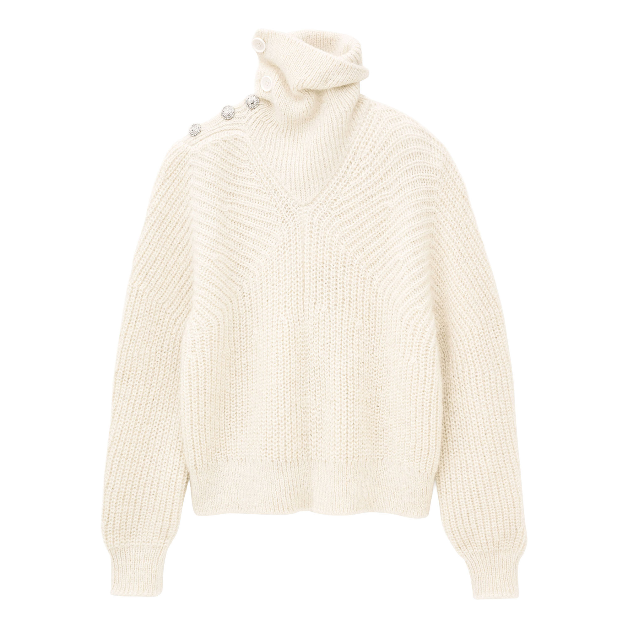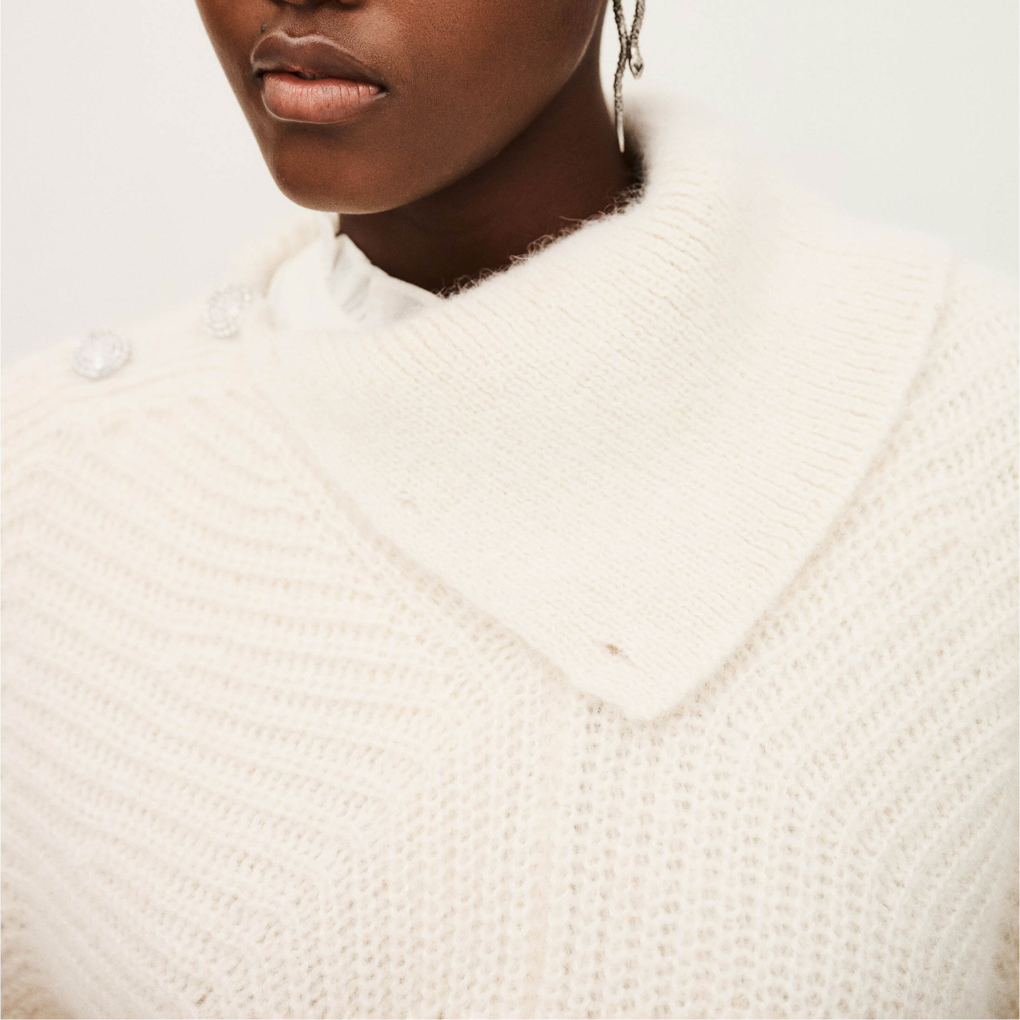 - Purl knit, high roll-neck, rounded sleeves with generous volume, button placket on shoulder, jewelled buttons