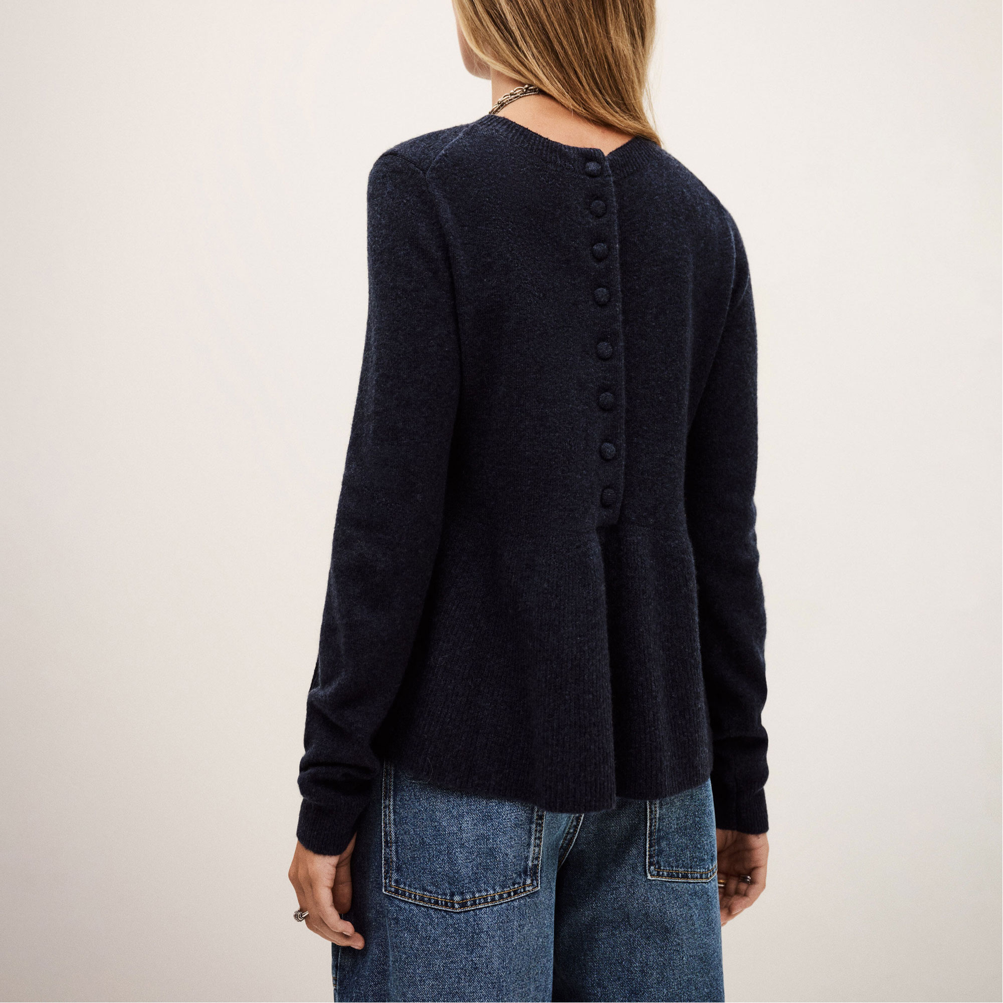 - Crew neckline, long sleeves, ribbed peplum hem, covered button fastening at the back