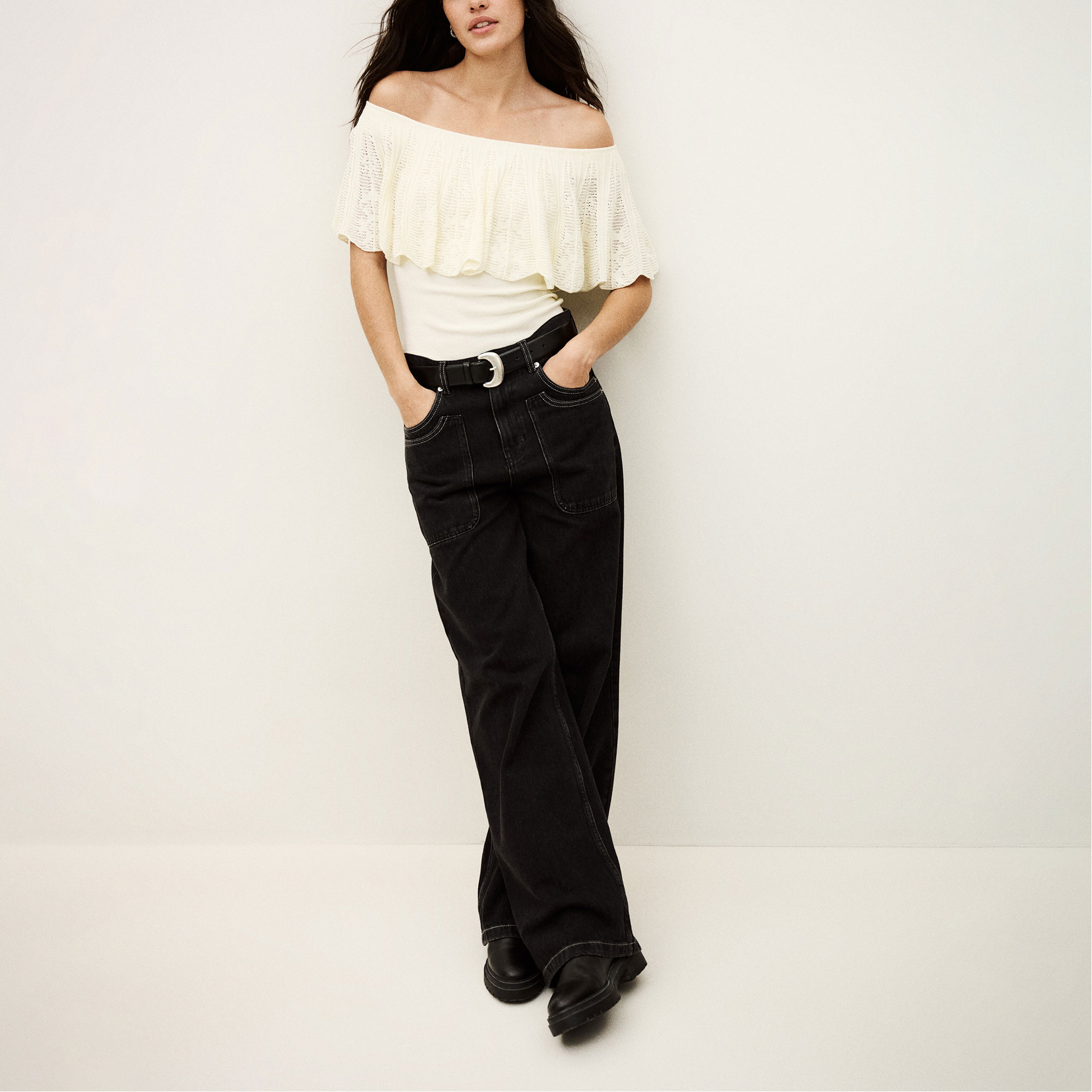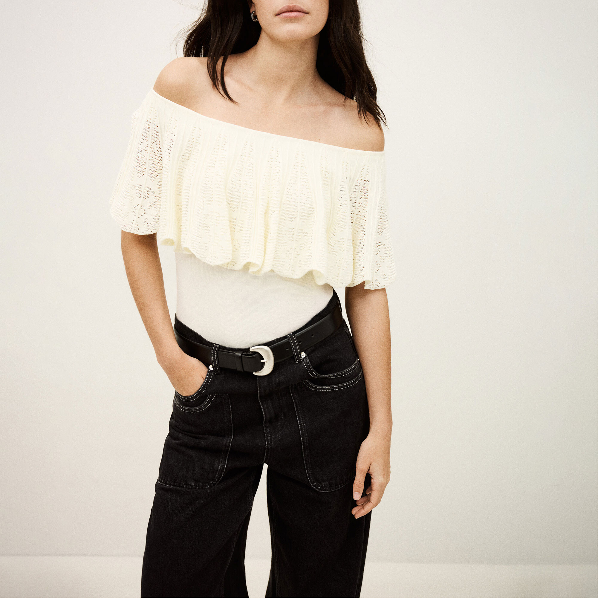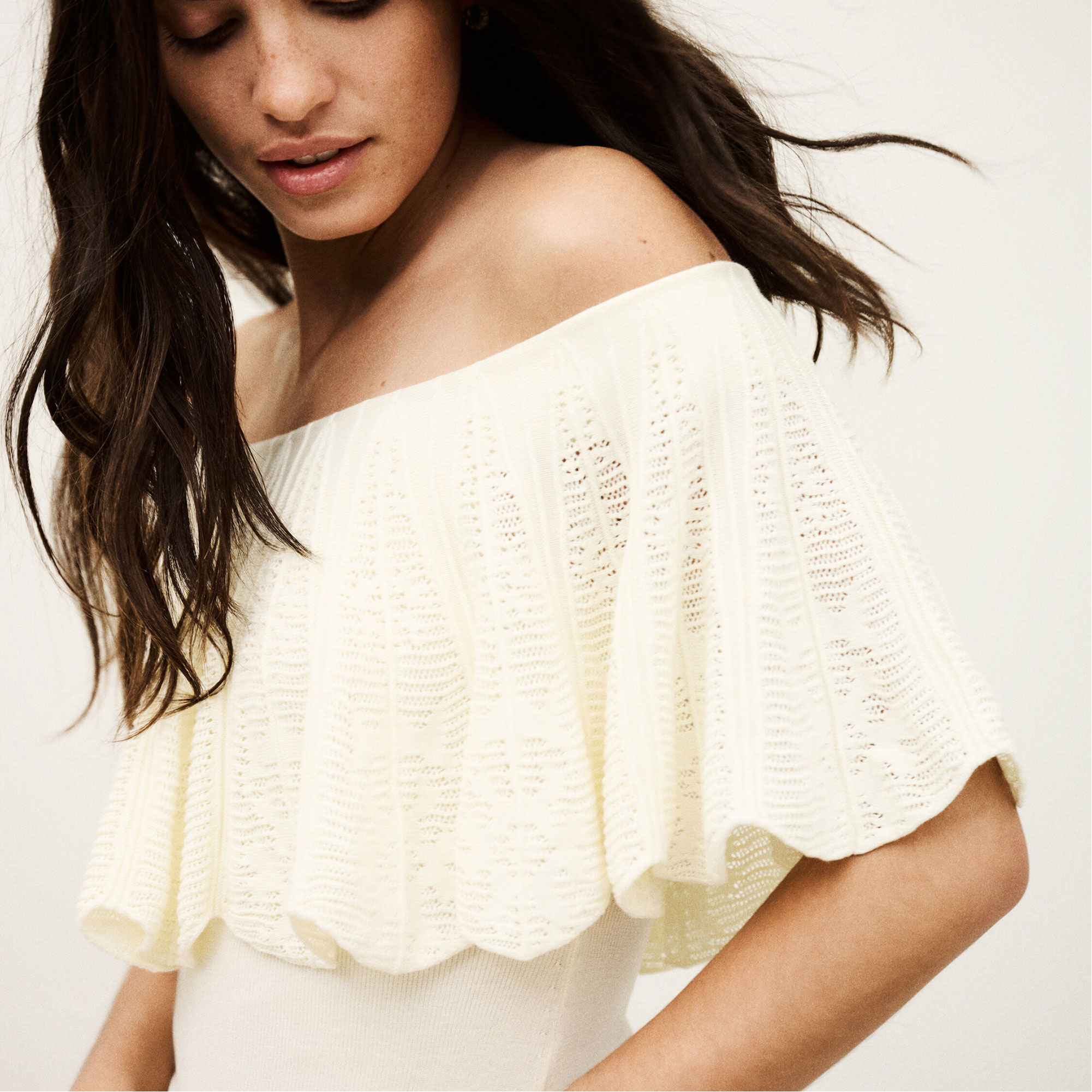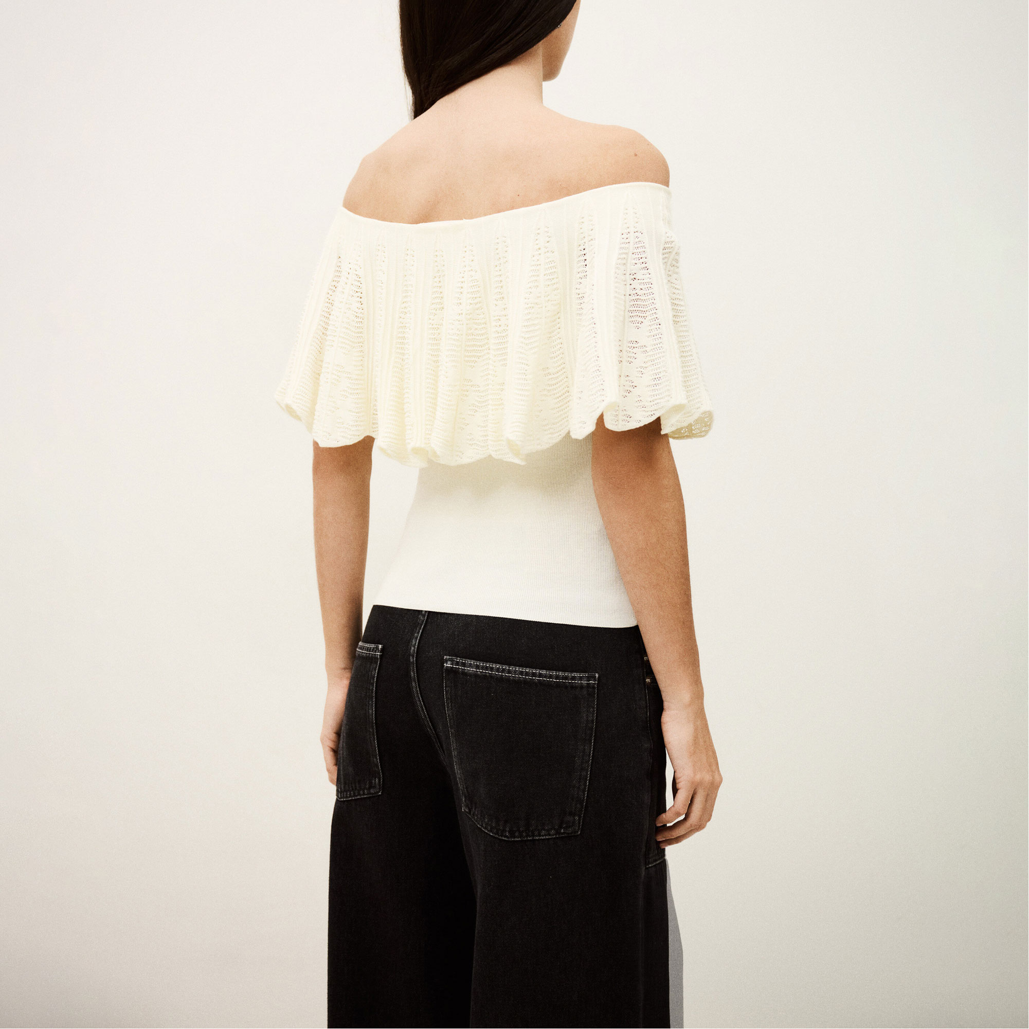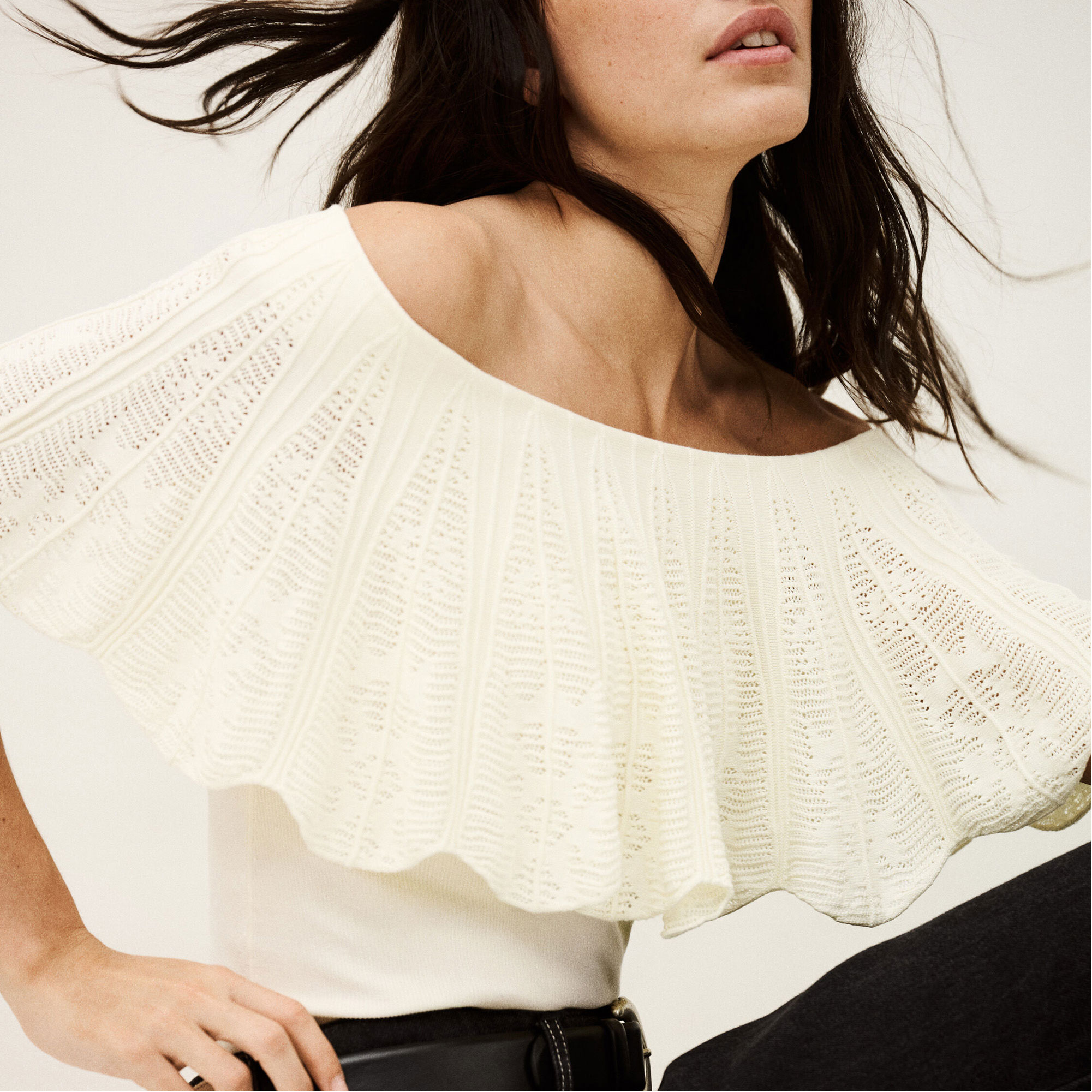 - Open shoulders, anti-slip band, textured Jacquard knit, stitched ruffles, knitted