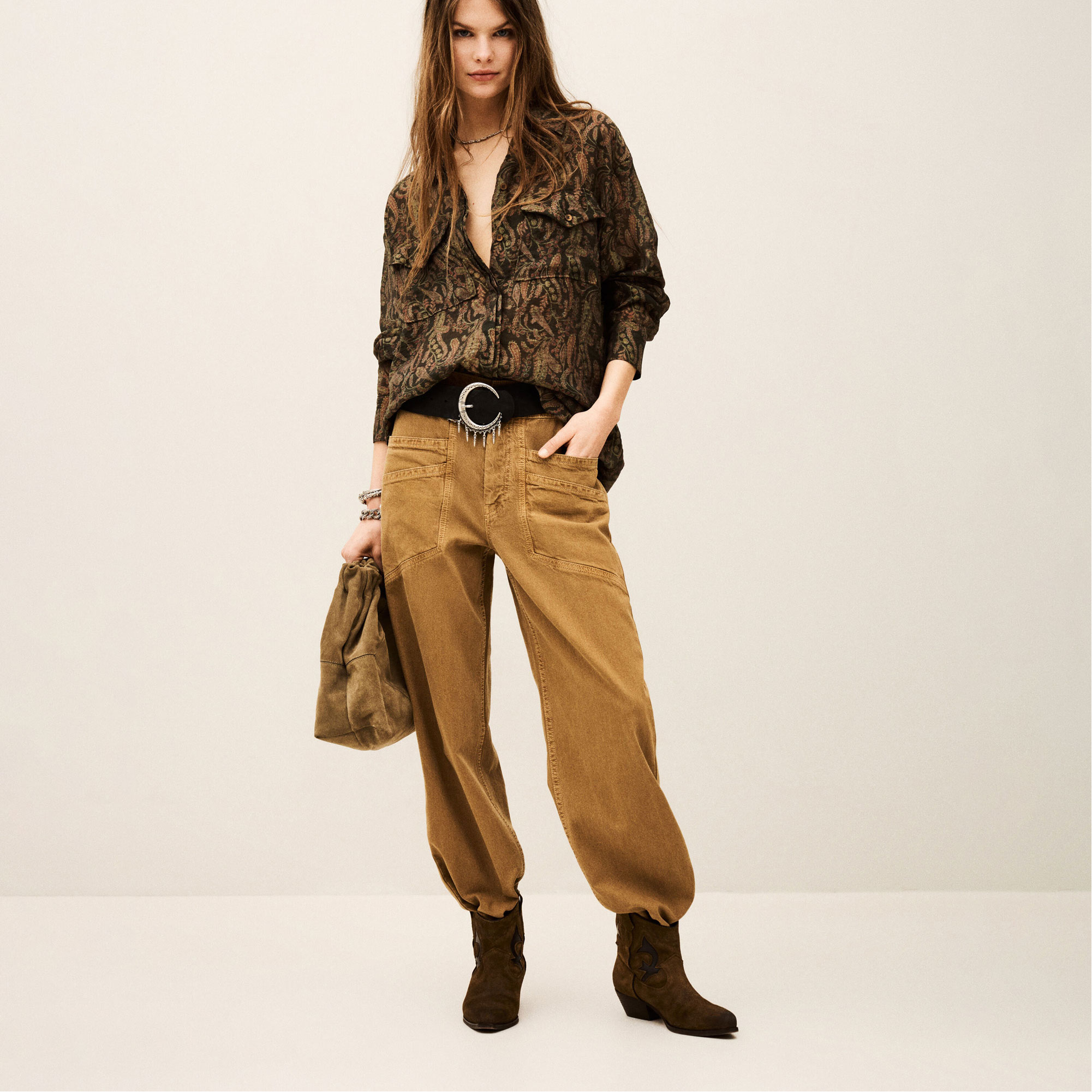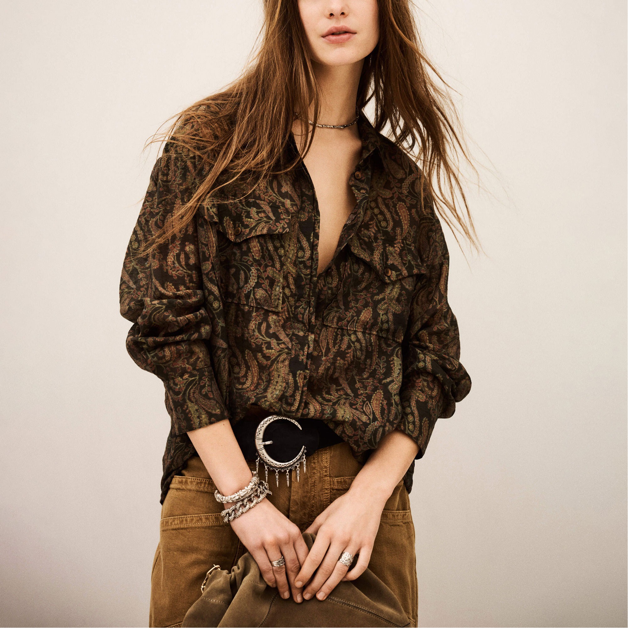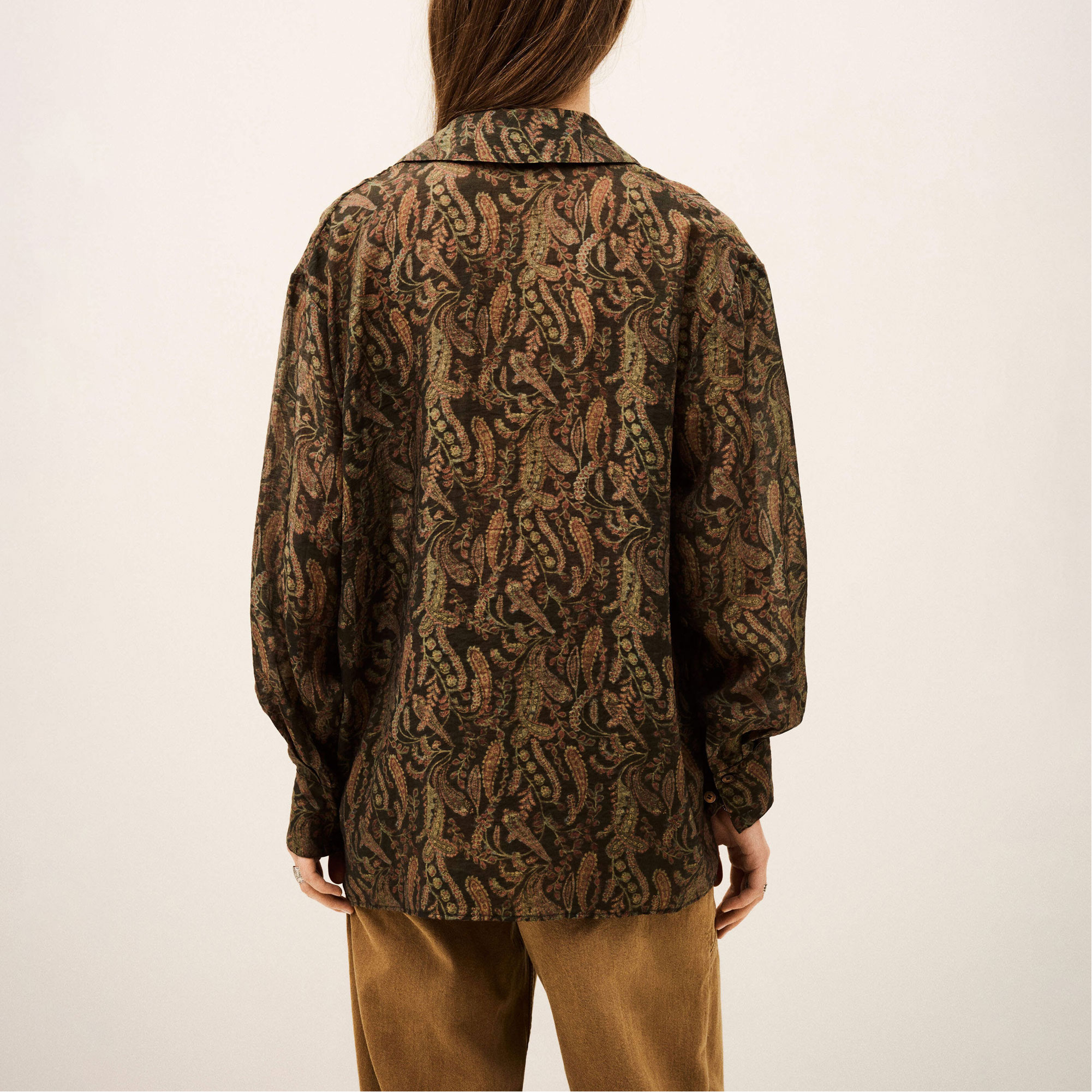 • Point collar, long sleeves, buttoned cuffs, concealed button placket with offset pleat, large chest pockets with pointed flaps, straight hem, paisley print