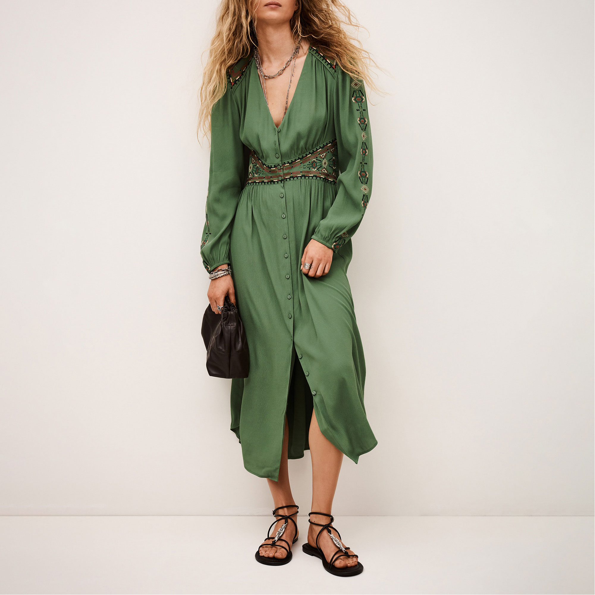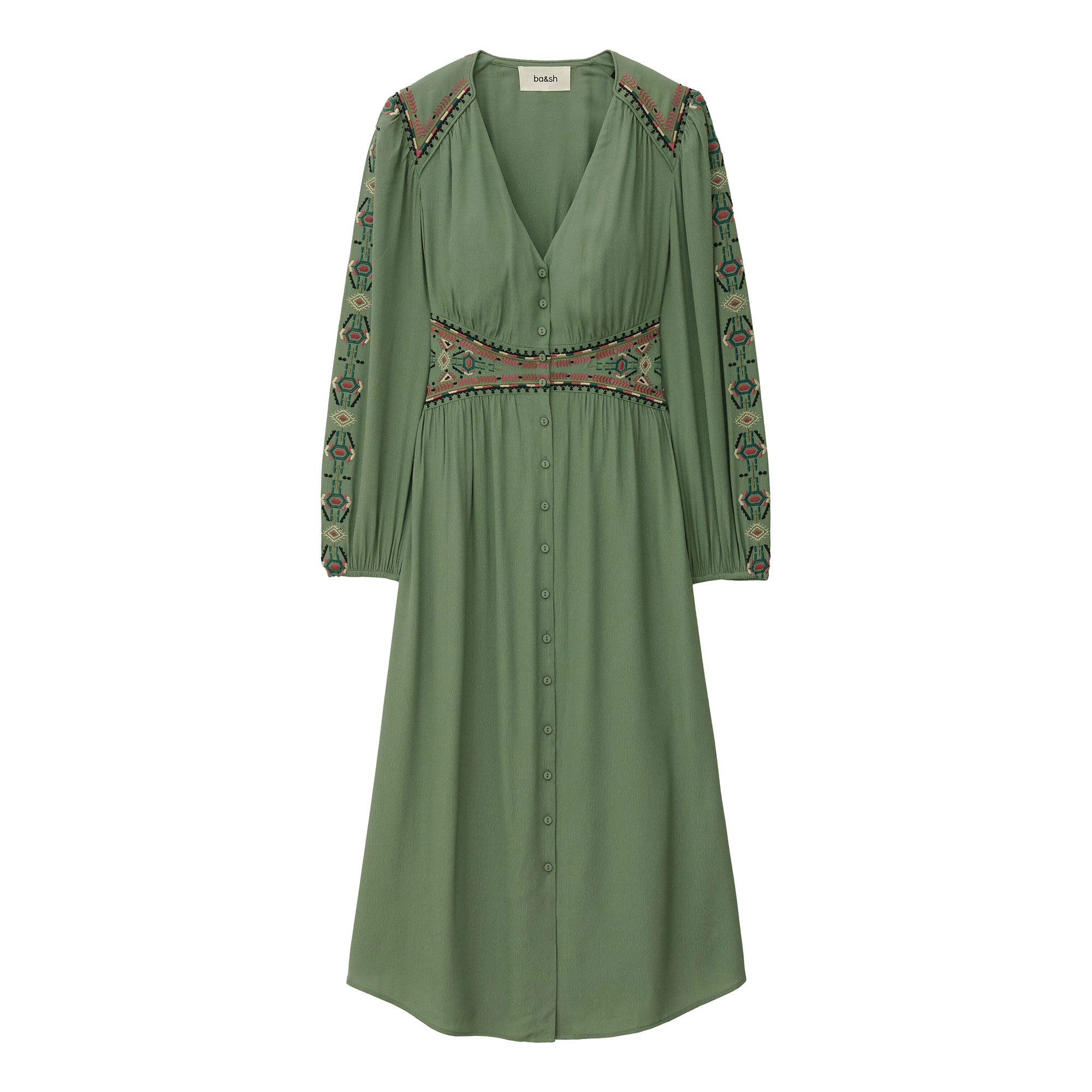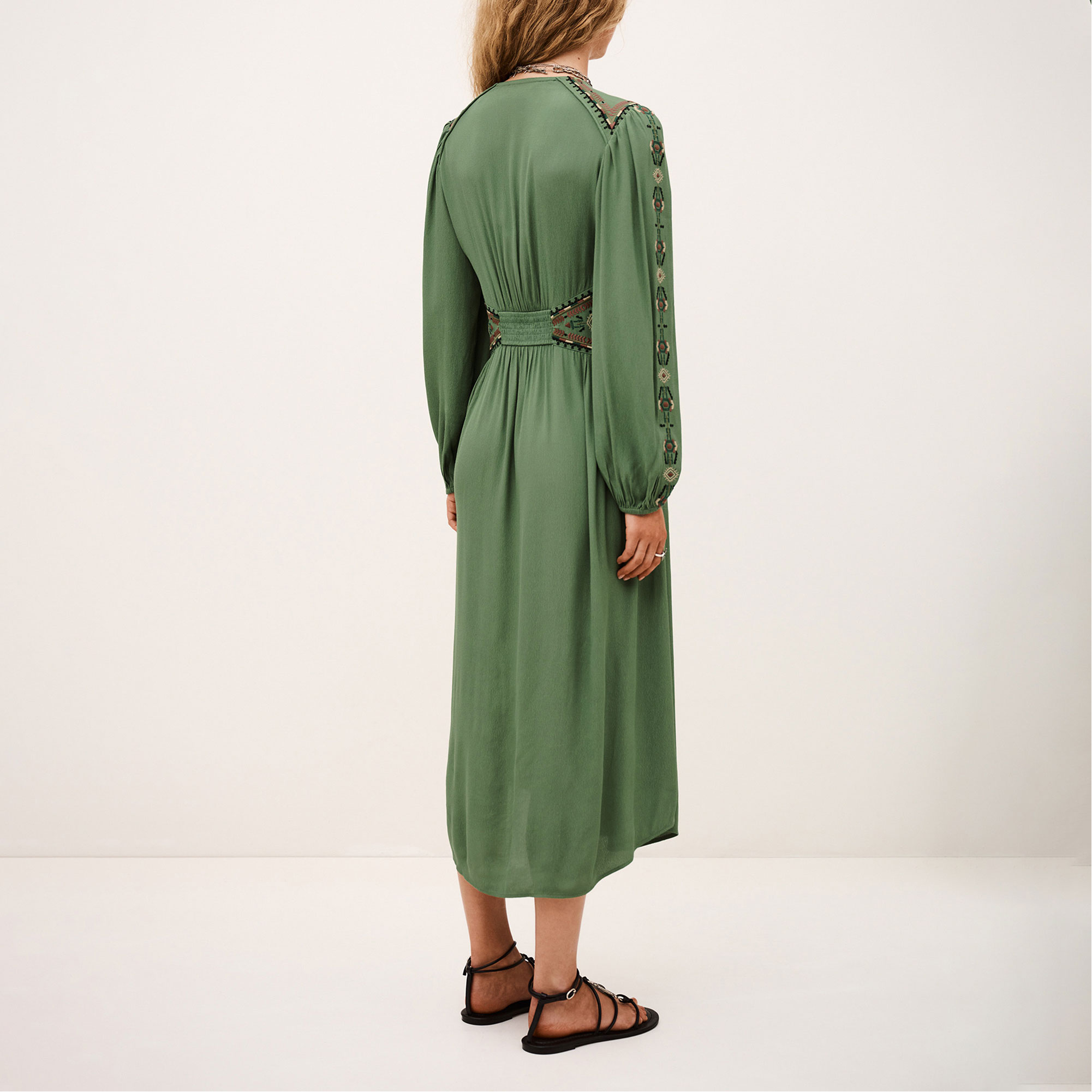 - Long dress with fitted waist, v-neckline, button fastening at the centre front, long puff sleeves with elasticated cuffs, embroidered inserts at the waist shoulders and sleeves, smocking at the back waistband for comfort