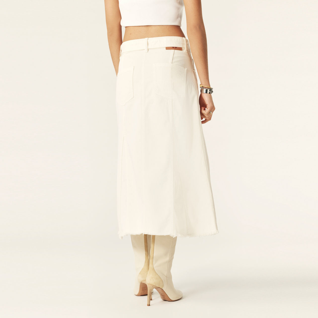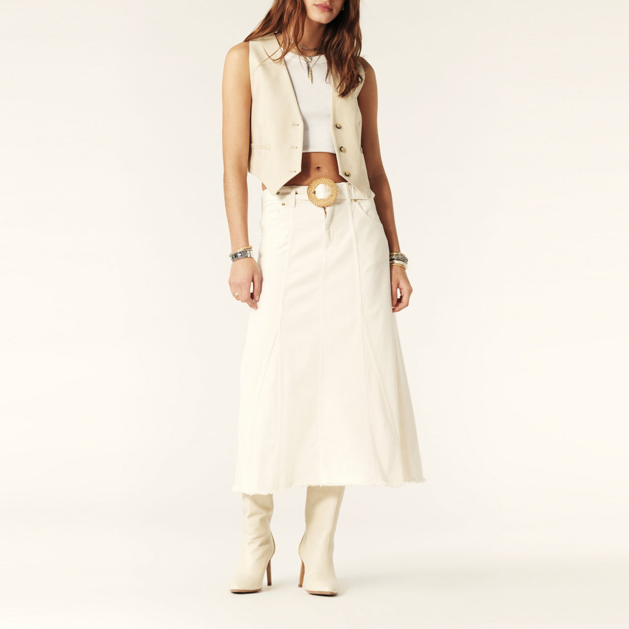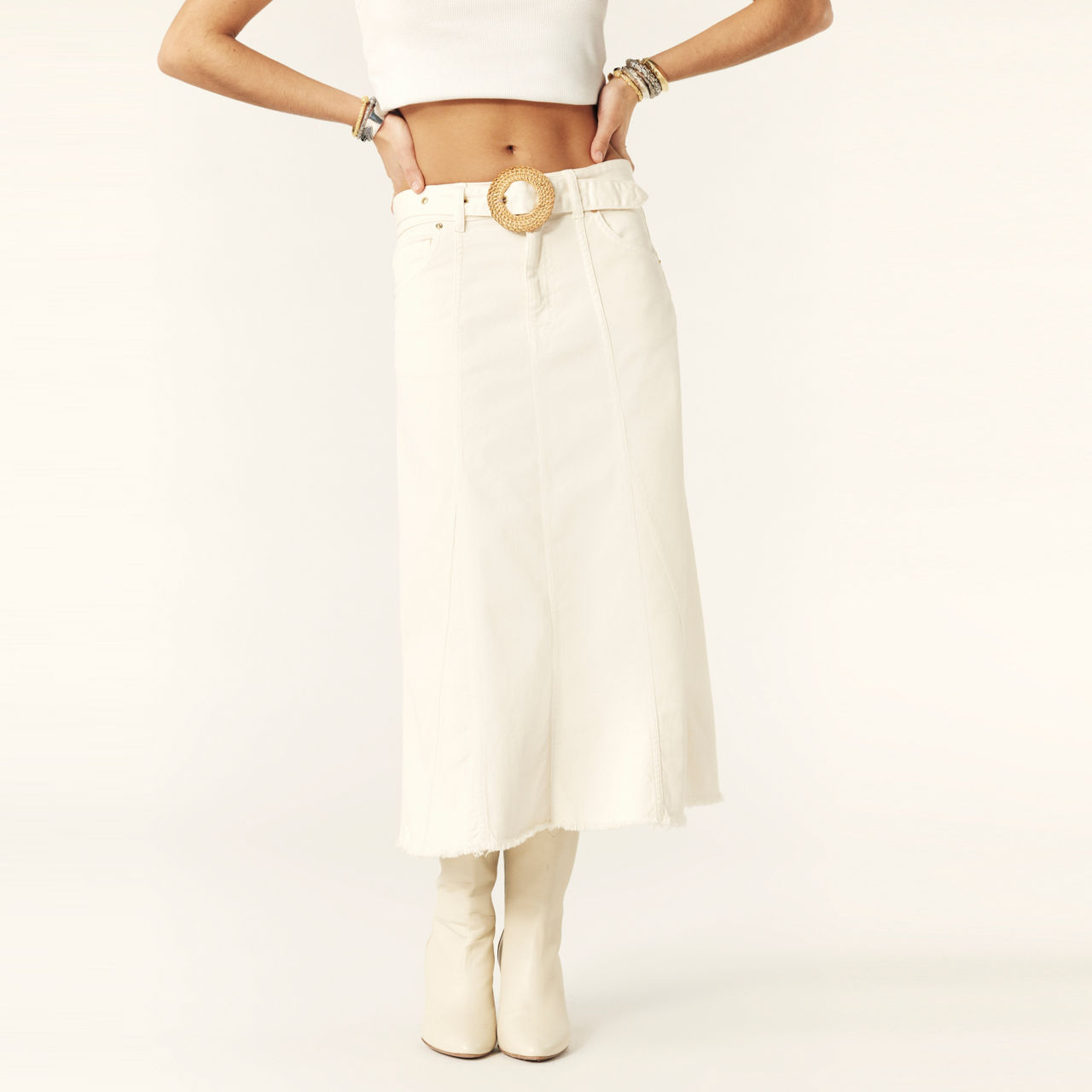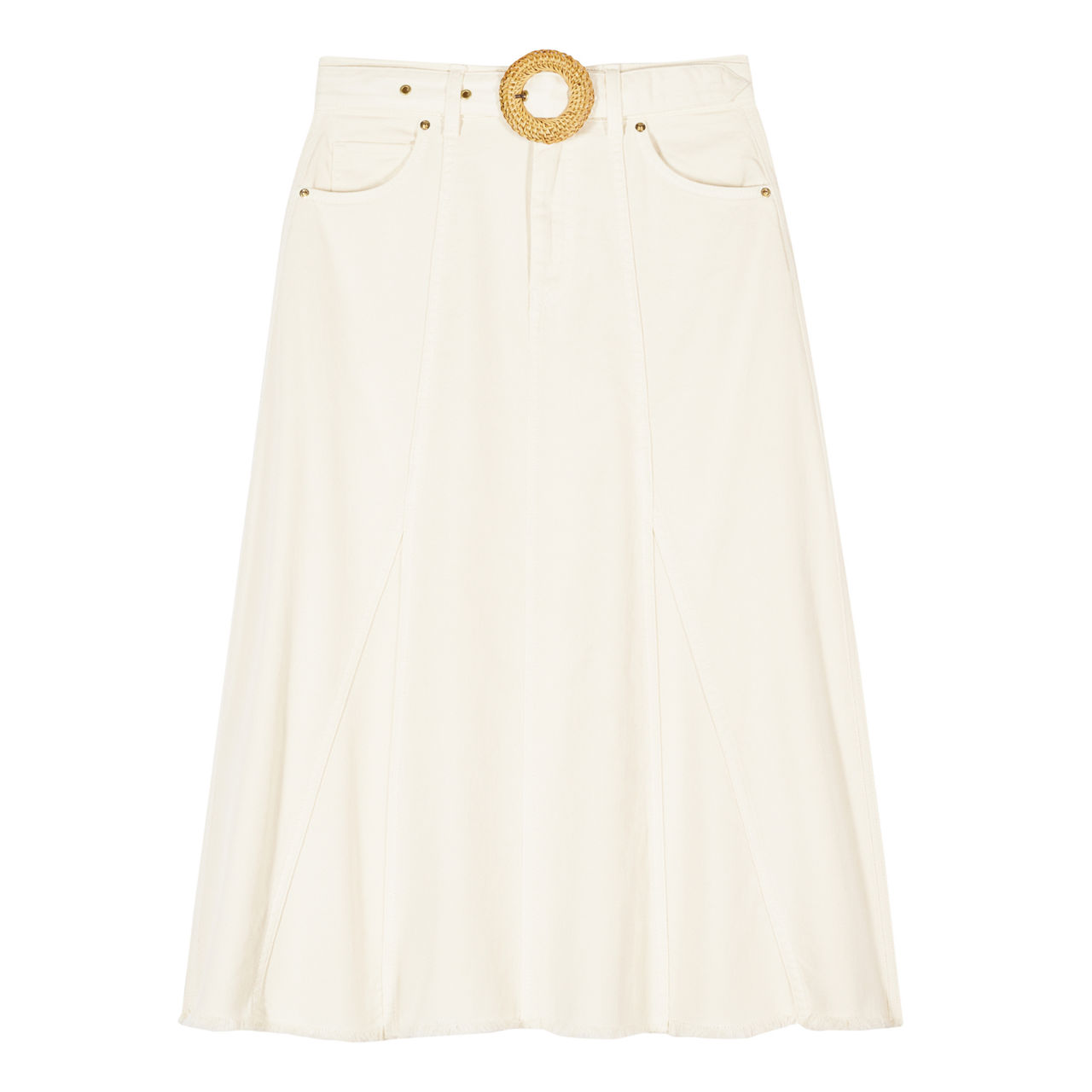 - Midi length, topstitching details, flared style, frayed hemline, five-pocket style, belt loops, brand patch, belt with round raffia-style buckle